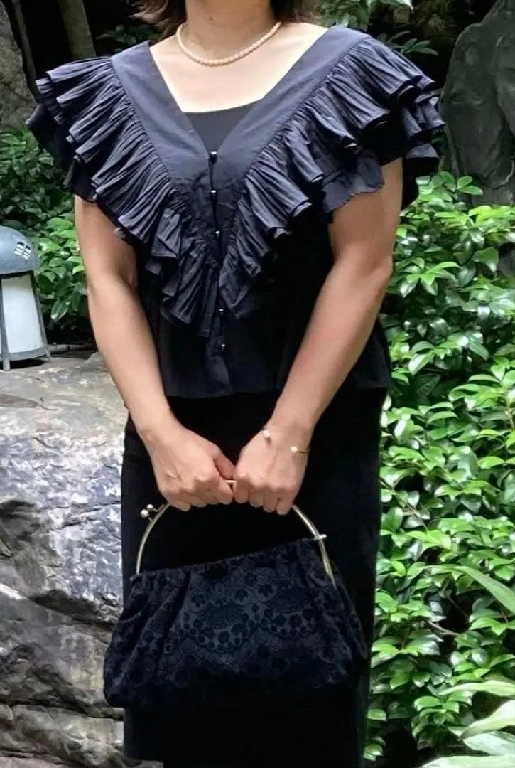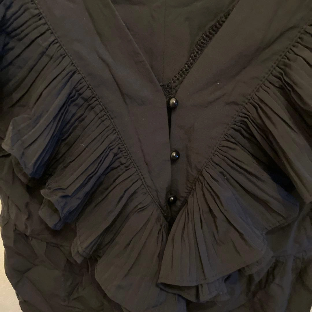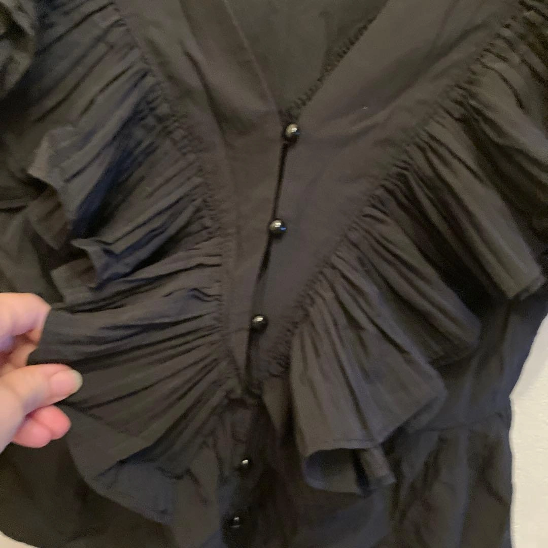 フリルデザインの黒いVネックシャツです。前面に丸ボタンが付いています。 色は黒で、フリルが華やかな印象です。 着丈51cm 肩幅はフリルがあるため計測が難しいです。 一度着用し、ホームクリーニング済みです。 - 色: 黒 - デザイン: フリル付き Vネック - ボタン: 前面ボタン付き - 袖: フリル袖 USED品にご理解いただける方のみご検討をお願いします。 カラー···ブラック系 カラー/ネック···Vネック 透け感···透け感なし 季節···春夏 ご希望の方はお気軽にご連絡ください。