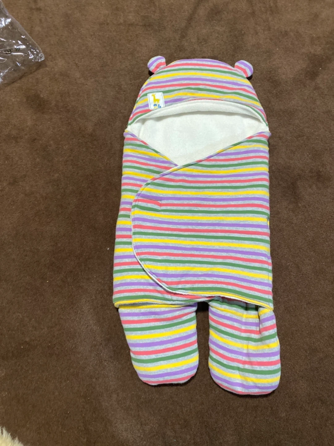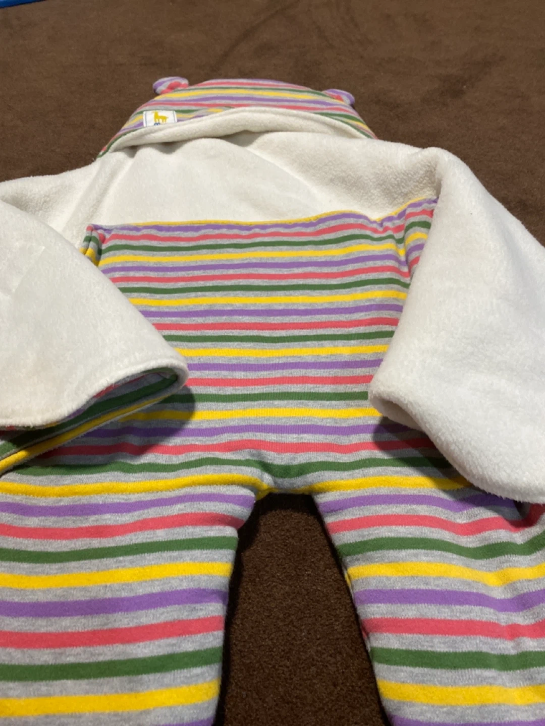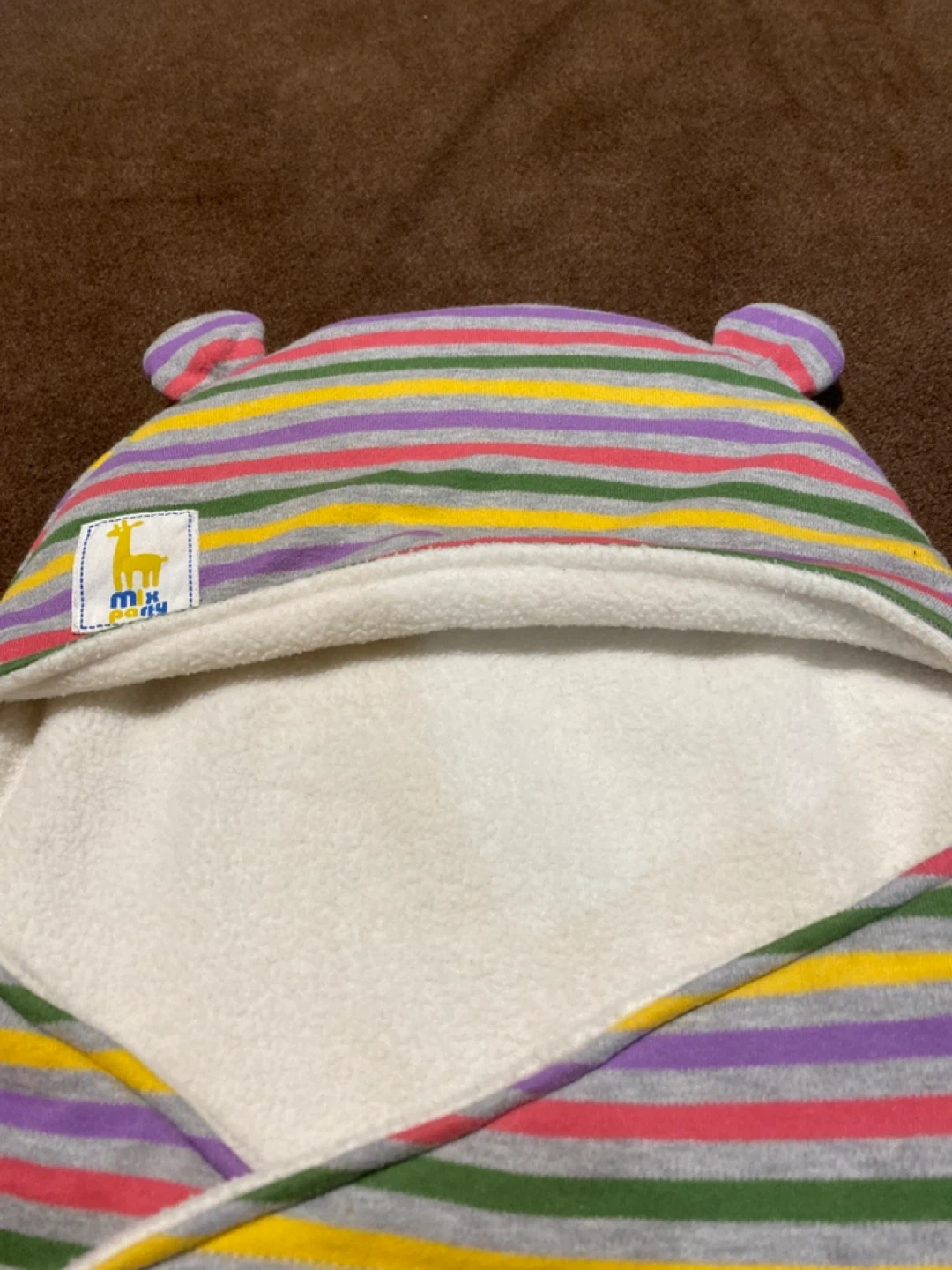 ベビーカーの時に役立ちます。 あったかいフリース素材で、足と頭の防寒にとても良いです。 新生児から使えます。 ひとつシミあります。写真5枚目(内側) ミックスボディのベビースリーパーです。 ・サイズ:50~70cm ・体重:3~9kg ・素材:ポリエステル100% ・カラフルなストライプ柄、フードに耳付き ・使用感あり 中古品であることをご了承ください。