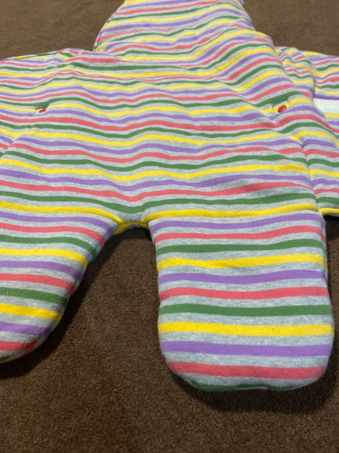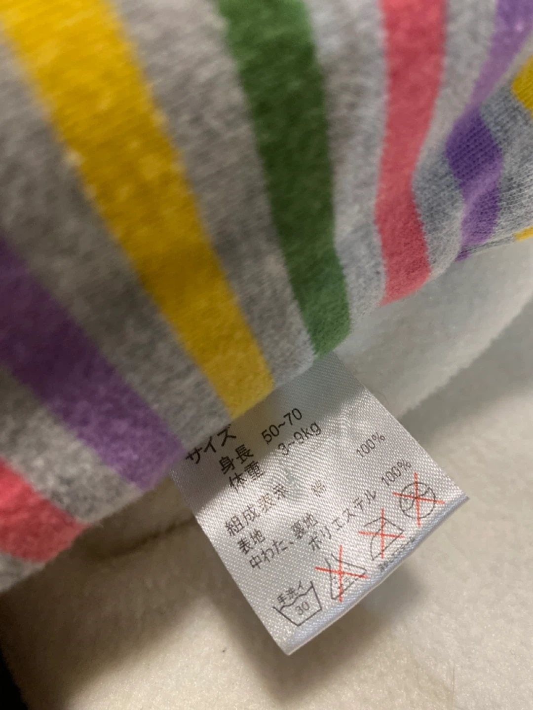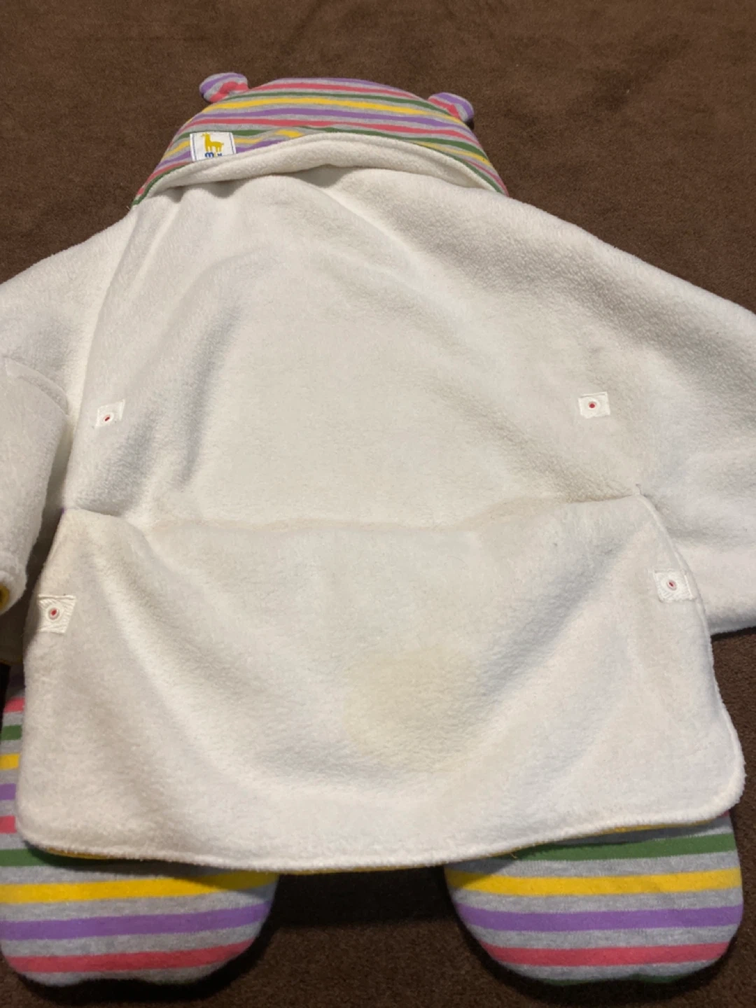 ベビーカーの時に役立ちます。 あったかいフリース素材で、足と頭の防寒にとても良いです。 新生児から使えます。 ひとつシミあります。写真5枚目(内側) ミックスボディのベビースリーパーです。 ・サイズ:50~70cm ・体重:3~9kg ・素材:ポリエステル100% ・カラフルなストライプ柄、フードに耳付き ・使用感あり 中古品であることをご了承ください。
