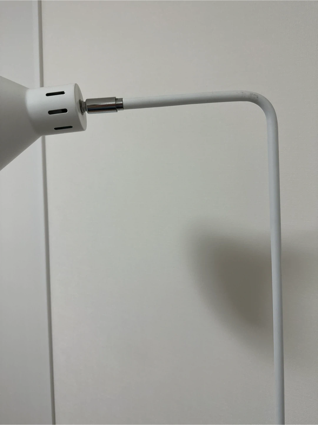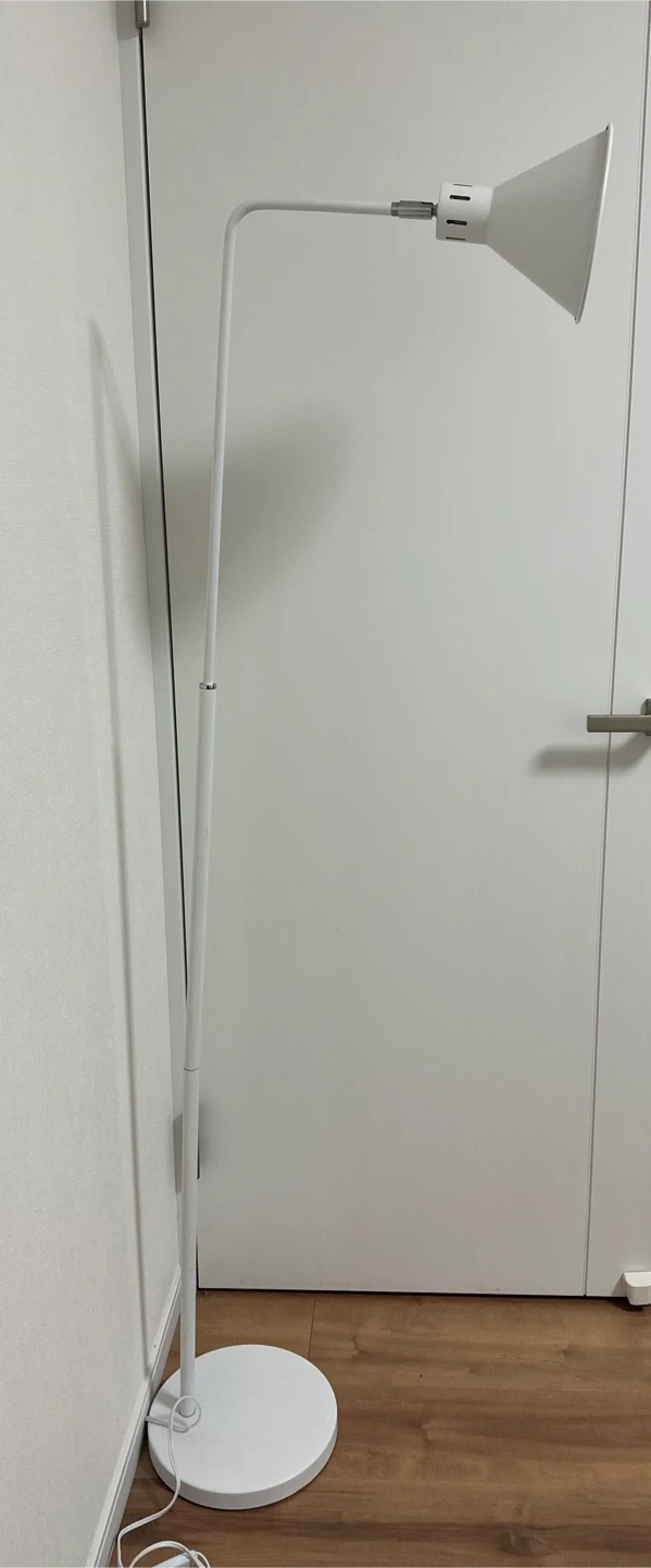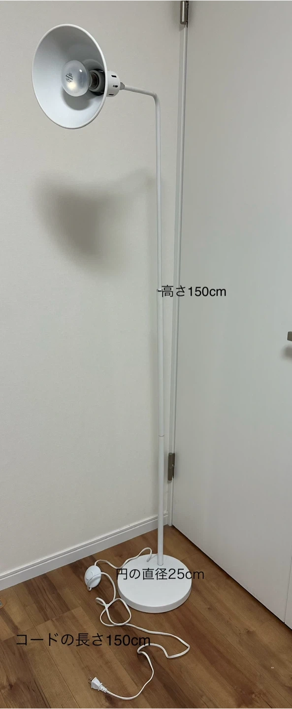フロアライトです。 ・色:ホワイト ・高さ:約150cm ・土台の直径:約25cm ・コードの長さ:約150cm ・電球付き(Panasonic 60形) 写真2:スタ ンドが少し前傾になります。 写真3:曲線の所に、汚れがあります。 中古品であることをご了承ください。 上下に袋を被せてのお渡しを考えてます。 片手で運べる重さです。 車の場合は乗用車の助手席をリクライニングすると、寝かせて入るサイズです。