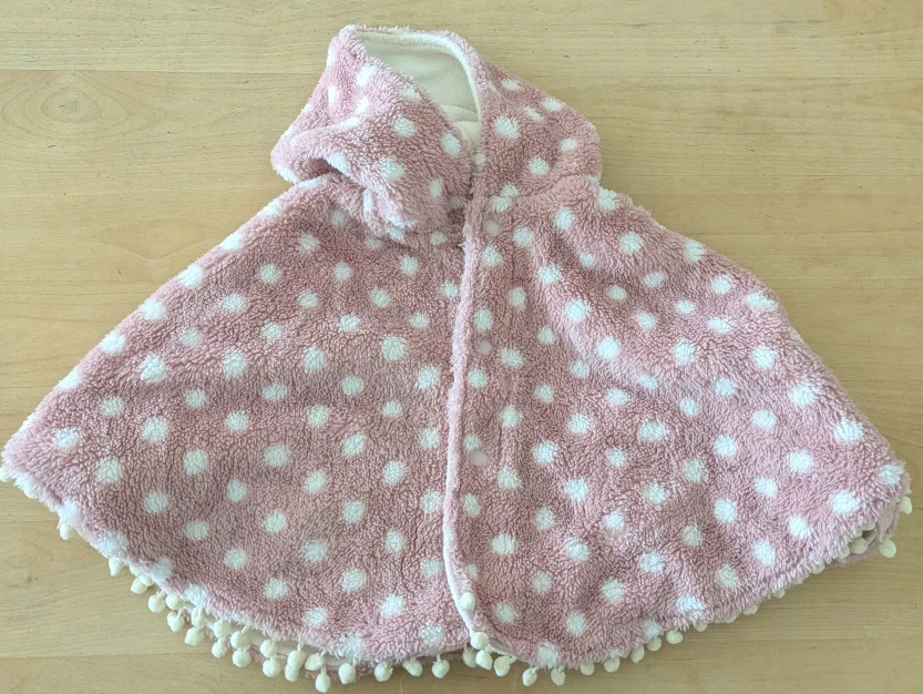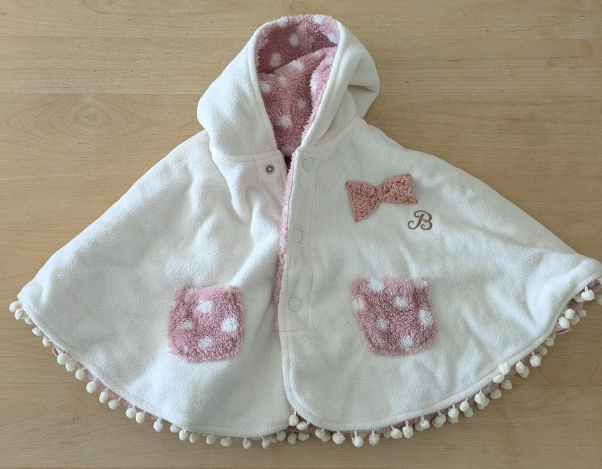 リバーシブルのベビーポンチョです。 フリースとボア素材、フード付。 サイズ (新生児〜2歳ぐらい) ヒモが付いていて手を通して着ることができるようになっています。 新生児から2歳ごろまで長く使えると思います。 寒い時期のお出かけに羽織りものとして使用していました。