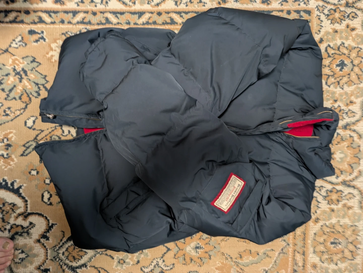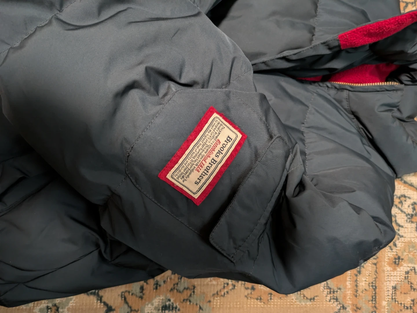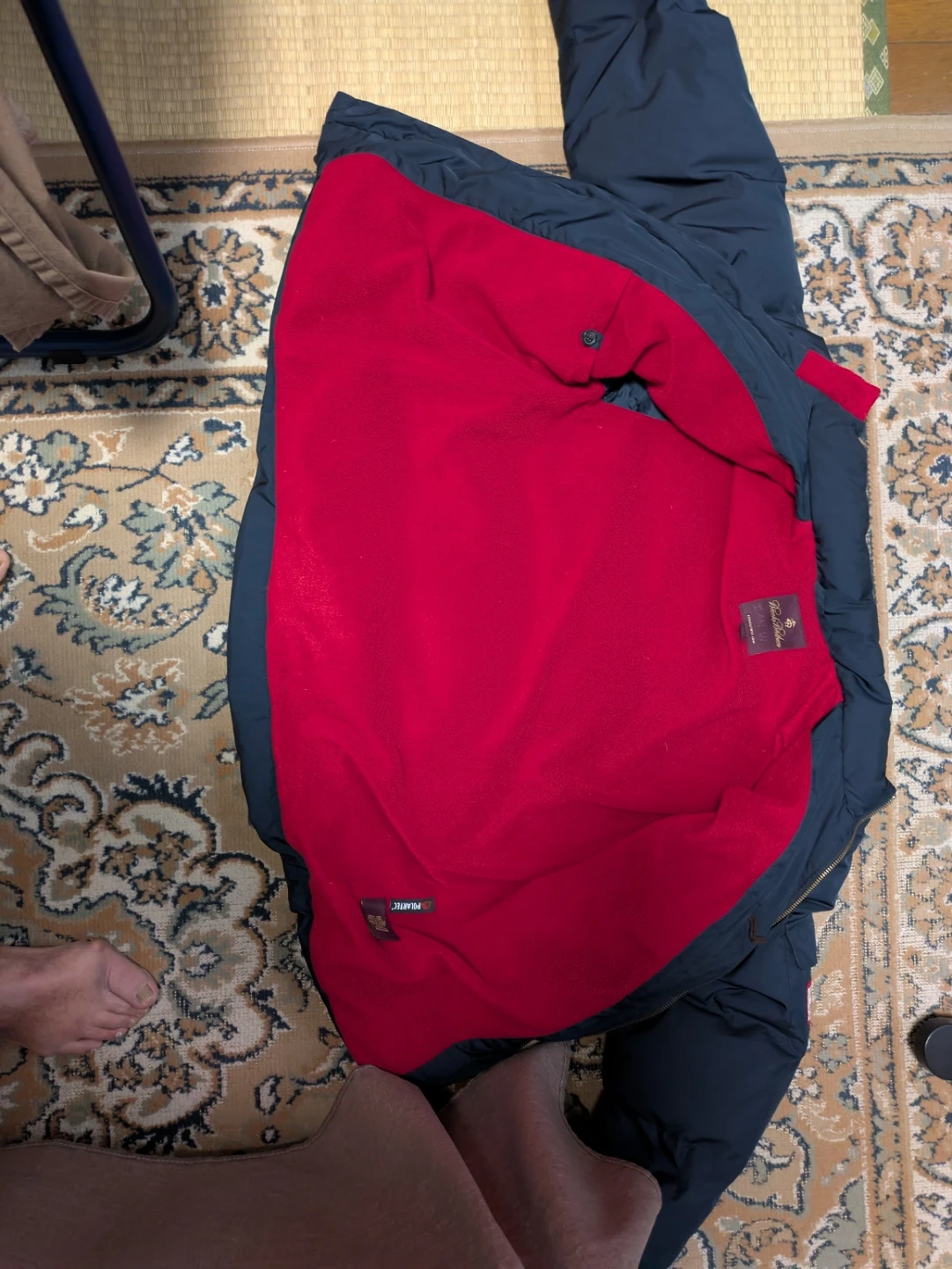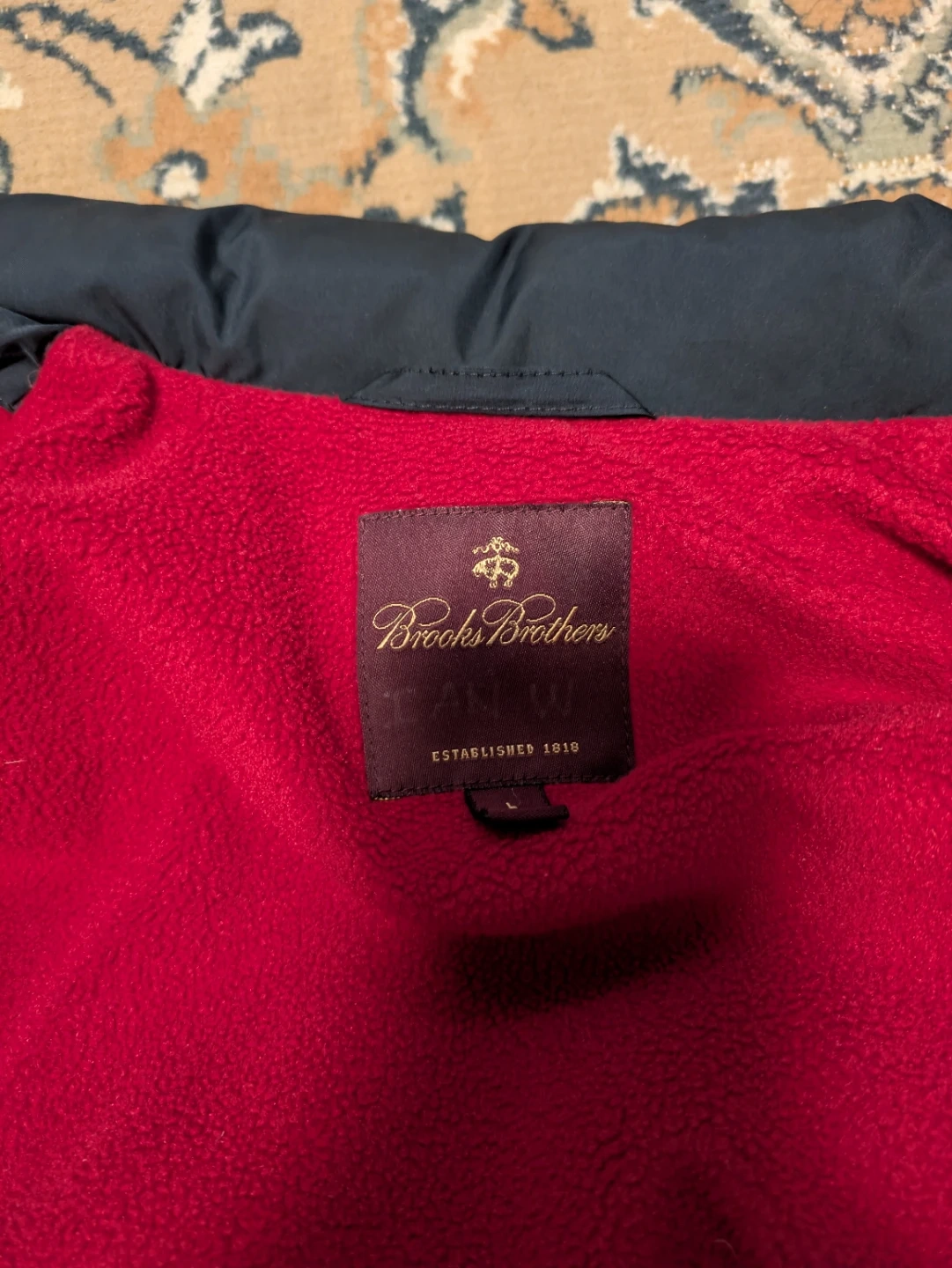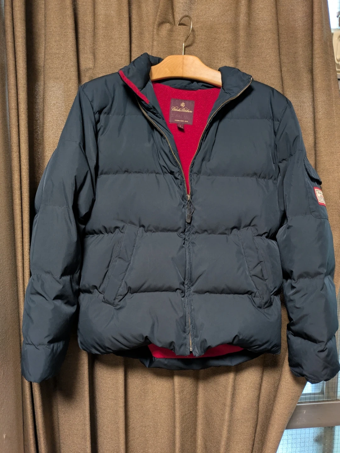 ブルックスブラザーズのダウンジャケットです。 ダウン85%フェザー15% 最近は中綿のダウン風が主流ですが、やはり 軽くて温かいのは、ダウンです。 【情報】 ブランド:ブルックスブラザーズ サイズ:L ヴォリュームがあるので 着用感は少しタイトに感じます。 身巾∶脇から脇 55cm 裄丈:襟付根から袖口 70cm 着丈∶襟付根から裾 65cm カラー:ネイビー(裏地は赤ポーラテックフリース) 平置き採寸ですが、若干の誤差はご容認願います。 【状態】 目立つ傷はありません、ライトの反射で 画像に陰影か見えますご、目立たった汚れもありません。 中古品であることご了承ください、神経質な方はご遠慮ください。