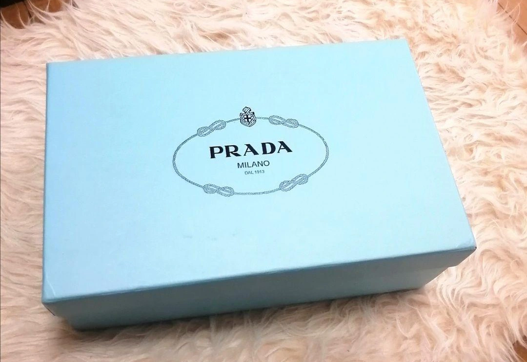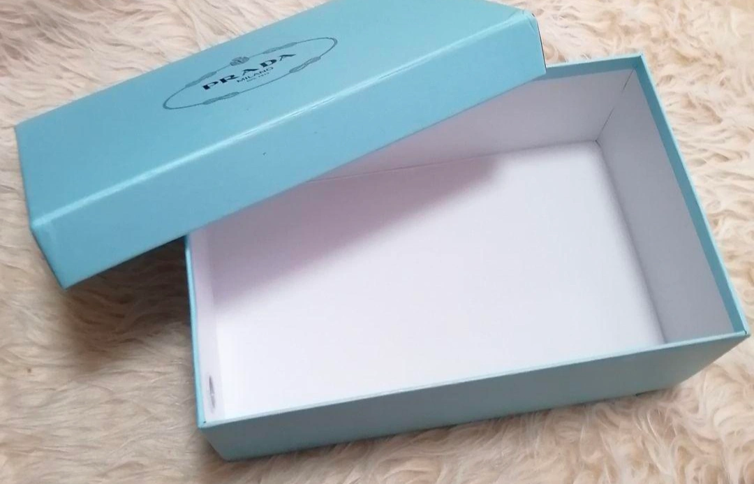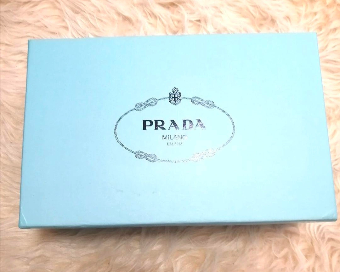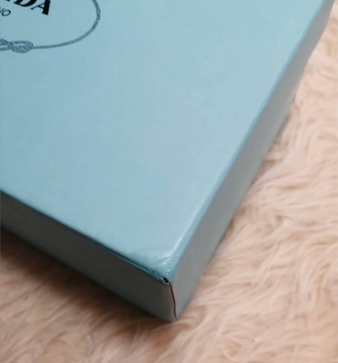 PRADA 箱 水色 大きめ プラダ 靴 空箱 プラダでサンダル購入した際に入っていた箱です。 実寸(誤差ご容赦ください) 箱20.5×30.5×11.5cm(たて×よこ×高さ) 高級感のある箱です。 インテリアや、小物いれ、パンプス収納としていかがでしょうか? あまり目立ちませんが、薄い変色等やへこみが所々あります。お写真で全ての角度から映しておりますのでご確認くださいませ。