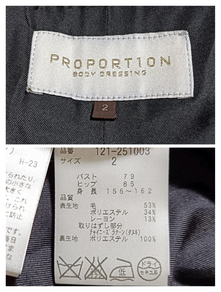 #joymaxお得なプロフへ #ゆうの古着屋さん_レディースアウター □ブランド□ PROPORTION BODY DRESSING プロポーションボディドレッシング □表記サイズ□ 2 □実寸サイズ(cm) □ 【床置きサイズ】 着丈:71 身幅:53 袖丈:63 ※実寸につきまして多少の誤差はご了承ください。 ※表記サイズだけではなく実寸のサイズをご確認ください。 □カラー□ ブラック 黒色 □素材□ 表:毛53%   ポリエステル34%   レーヨン13% 取り外し部分:タヌキ 裏生地:ポリエステル100% □コンディション□ 目立った汚れやダメージなど特にございません。 ※汚れはできる限り写真にて掲載しております。まずは画像をご確認ください。 出品一覧→ #joymaxお得なプロフへ どうぞよろしくお願い致します。 □商品管理番号□ T5-O-4418