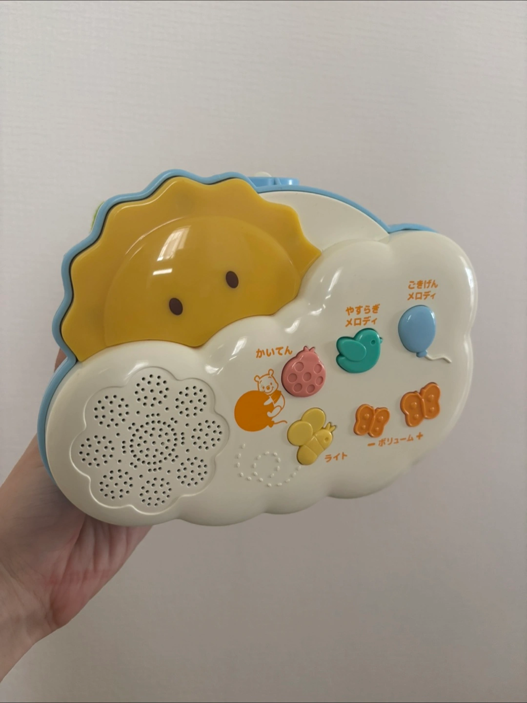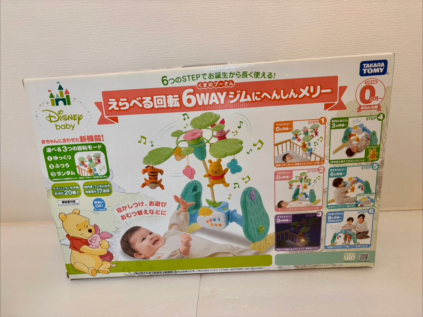 回転するメリーです。 使用に伴うスレや小傷はございます。 素人による動作確認を行いました。回転やライト、曲は正常に流れます。 ★子供が使用した物のため新品同様をお求めの方、完璧を求められる方、神経質な方はご遠慮いただけますようお願い申し上げます(*^^*) 【情報】 ブランド:ディズニーベビー 種類:6WAYジム 対象年齢:0ヶ月~ 【機能】 回転モード:3種類(ゆっくり、ふつう、ランダム) クラシック・子守唄:20曲 効果音:17種類