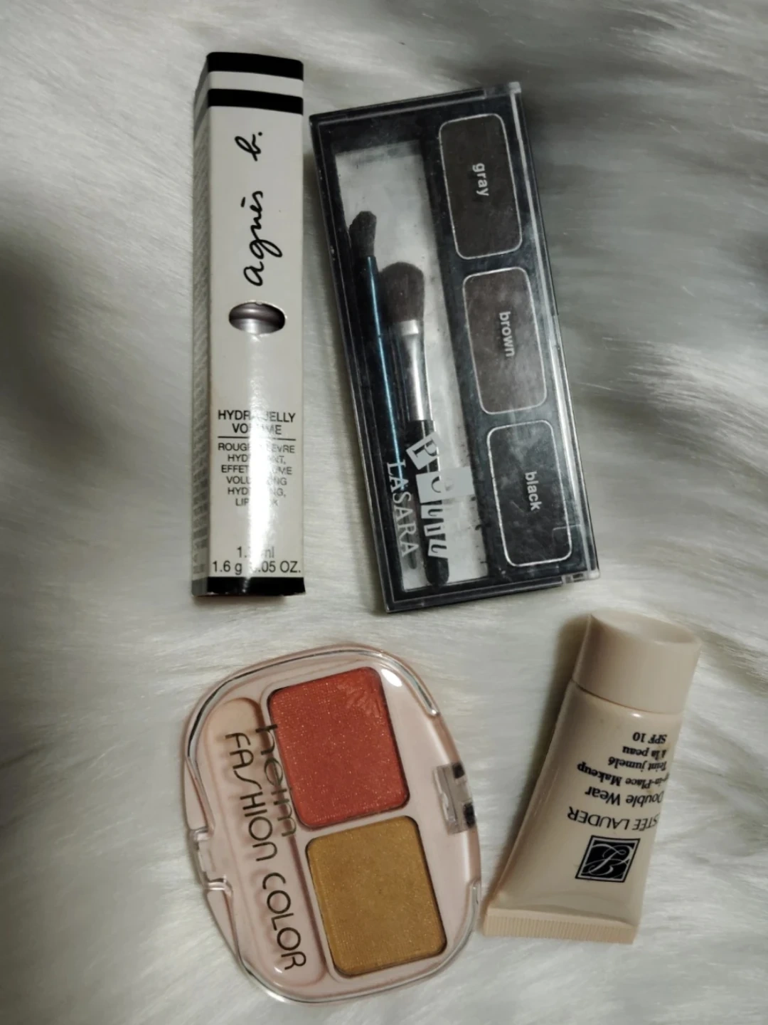 化粧品セットです。 ・アイシャドウ:ヘイミ ファッションカラー ・ファンデーション未使用エスティローダー ダブルウェア ステイインプレイスメークアップ SPF10 ・アイブロウパウダー:PETIT LASARA (gray, brown, black) ·アニエスベー口紅画面では実際の色と違います。 中古品が混ざっていることご了承ください。