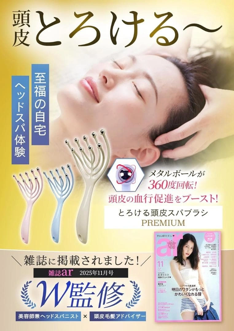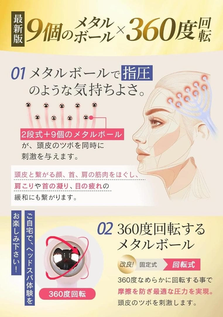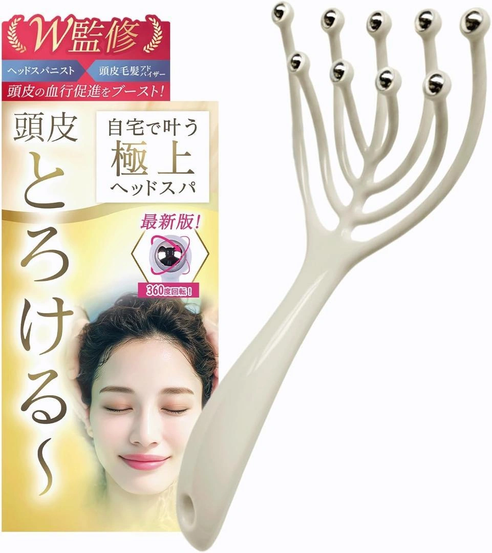 現役の美容師兼ヘッドスパニストと頭皮毛髪アドバイザーが共同監修したヘッドスパブラシです。 先端に搭載された2段式・計9個のメタルボールが、頭皮のツボを刺激します。360度回転式で、頭皮への摩擦を抑えながら血行を促進し、抜け毛・薄毛の予防、髪にハリ・コシと艶を引き出す効果が期待できます。 人間工学に基づくヘッドカーブ設計で、頭皮全体に均一な圧を届けます。お風呂でも使用可能です。 頭皮への刺激は、顔、首、肩の筋肉のコリをほぐすことにつながります。肩こりや首の凝り、眼の疲れの緩和、リフトアップやむくみ解消にも役立ちます。 抗菌仕様で、フック等に引掛けて保管できます。 【カラー】 グレージュ ご希望の方はお気軽にご連絡ください。