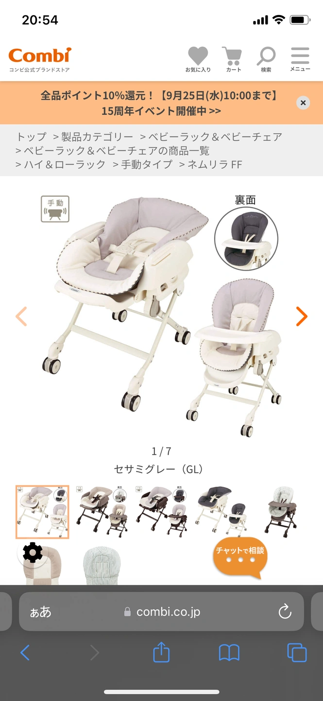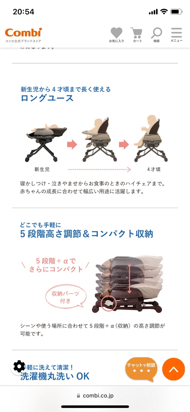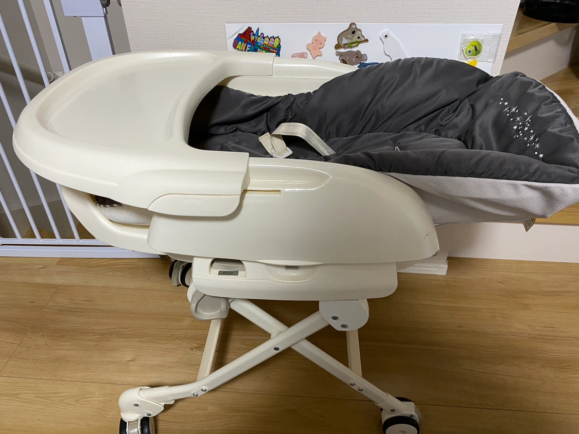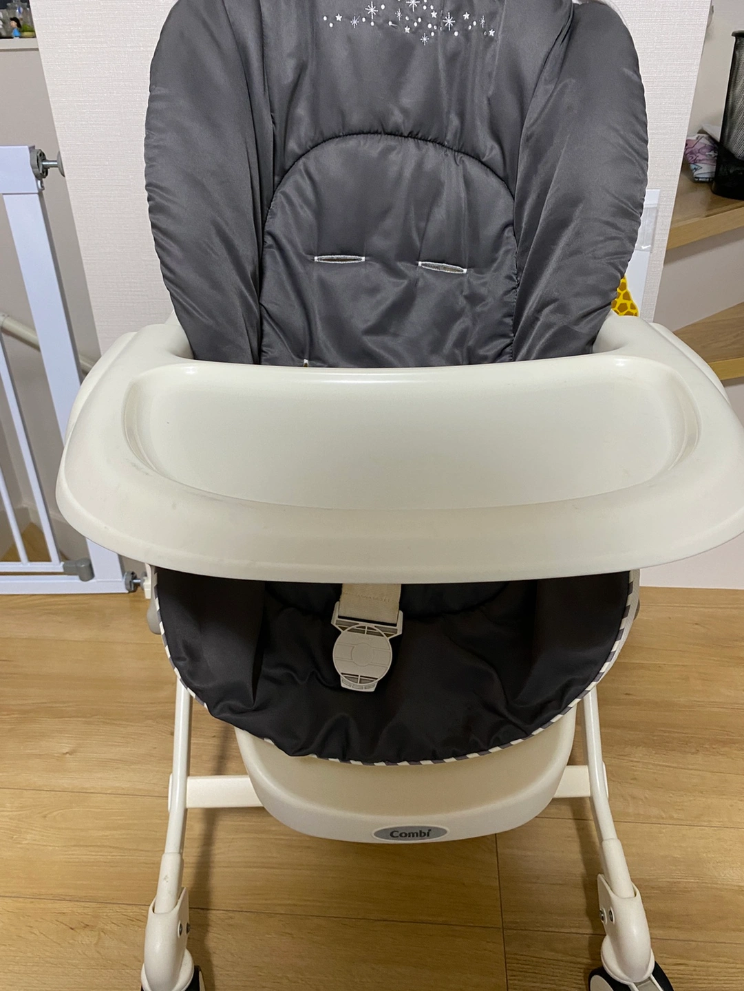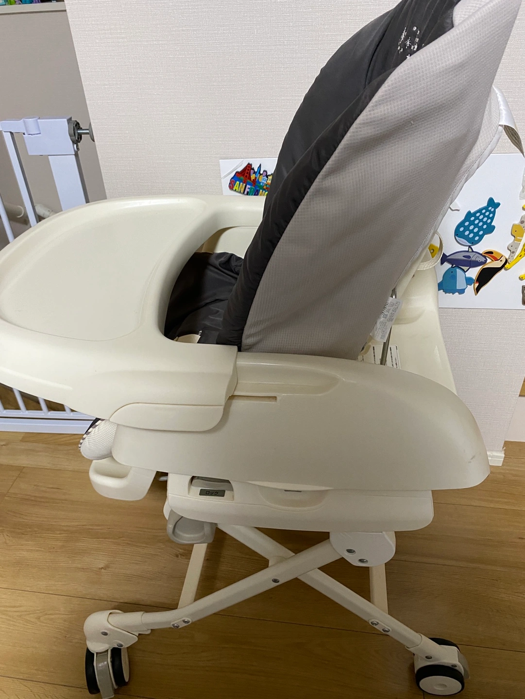 combiのハイローチェアです。 リクライニングがありベッド状態から背もたれを直角まで立てることができます。 手動です がスウィングもします。ロックがあるので椅子状態の時、スウィングが動かないように固定できます。 高さも変更可能。 テーブルもつきます。取り外し可能です。 足元はローラになっているため移動も手軽です。ローラをロックして動かないようにできます。 東十条駅付近での手渡し希望です。(近辺であれば場所によっては受け渡し場所の交渉可能です。) 袋に入れますが、大きいので、手持ちでの持ち運びは厳しいかと思います。 ベルト部分に汚れがありますが、使用上問題ありませんでした。