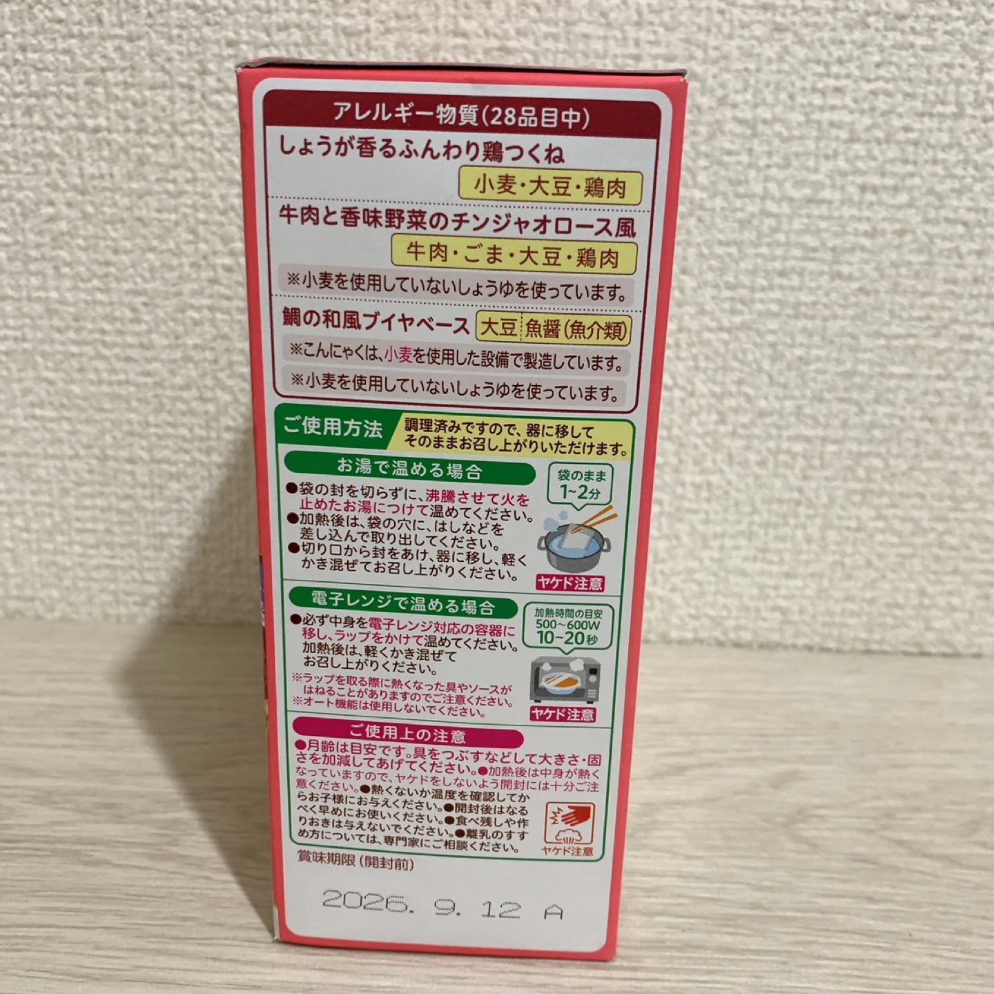 Pigeonのベビーフード、1才4ヶ月からの6袋セットです。 【情報】 ブランド:ピジョン 対象年齢:1才4ヶ月頃から 内容量:100g×6袋 セット内容:しょうが香るふんわり鶏つくね、牛肉と香味野菜のチンジャオロース風、鯛の和風ブイヤベース(各2袋) 【状態】 未使用品 【その他】 賞味期限:2026年9月12日 子供が好き嫌いが多く食べなかったため出品します。