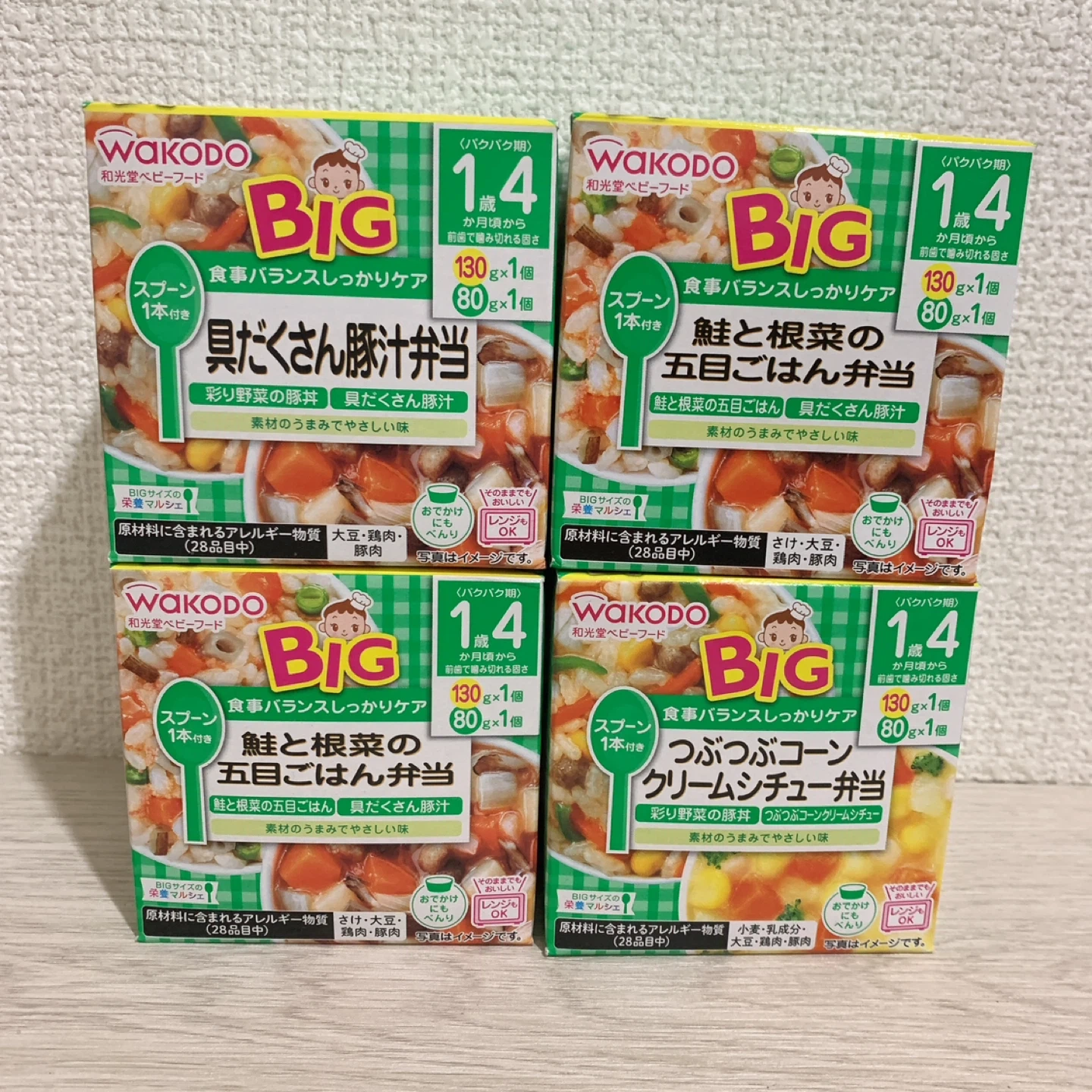 和光堂ベビーフード 1歳4ヶ月頃からの離乳食4個セットです。 賞味期限は1番早い物で2026年7月です。 写真ご参照ください。 【情報】 ブランド:WAKODO 対象年齢:1歳4ヶ月頃から 種類: ・具だくさん豚汁 1個 ・鮭と根菜の五目ごはん弁当 2個 ・つぶコーンクリームシチュー弁当 1個 賞味期限:1番早い物で2026年7月。 子供が好き嫌いが多く、食べなかったため出品します。未開封です。