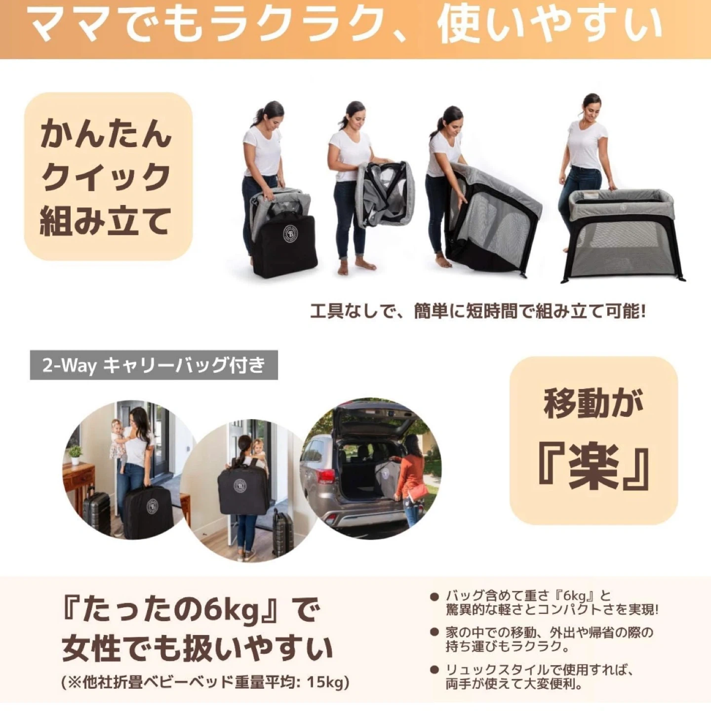 サイズ: 55.9長さ x 63.5幅 x 17.8高さ cm トラベル用のリュック付きです。 ❤️ルミエールベビー ベビーベッド 👶🏻【アメリカ発、日本人によるベビーブランド】ルミエールのベビーグッズは、創業者の日本人が設計・デザインしています 🍼【子育てママに自由時間を】持ち運びに便利なベビーベッドは、リビングやキッチン、書斎でもお子さまを寝かせることが可能です。起きた後もこのベッドが遊び場(プレイヤード)になるので、料理やリモート勤務の時も安心です 🫶【旅行先でもぐっすり安心】このベビーベッドがあれば、ホテルやコテージ、帰省先でもいつものように寝てくれます。もう旅行を我慢する必要はありません 🛌🏻【コンパクトで軽量、サッと広げてすぐ使える】『6kg』の圧倒的な軽さを実現(ポータブルベビーベッドの業界平均重量は13kg)。コンパクトに折り畳むことができるので場所を取らず保管できます。工具無しで短時間で組み立ても可能です ✨【高品質と高機能で快適・清潔】世界トップレベルの安全な繊維製品の証であるエコテックス素材を使用しているので、お肌にも環境にも優しい製品です。また、通気性抜群のマットレス使用で、ムレや汗から赤ちゃんを守り、快適な睡眠をサポートします 🌞【安心安全と長期保証】木枠の高さがあるベビーベッドと異なり、低いベッドは落下の危険性がありません。国際的な安全規格に認証済です(ASTM F2236, EN13209)。高品質な素材を使用しているので、生地はとても柔らかく、健康を害するような物質は一切入っていません。