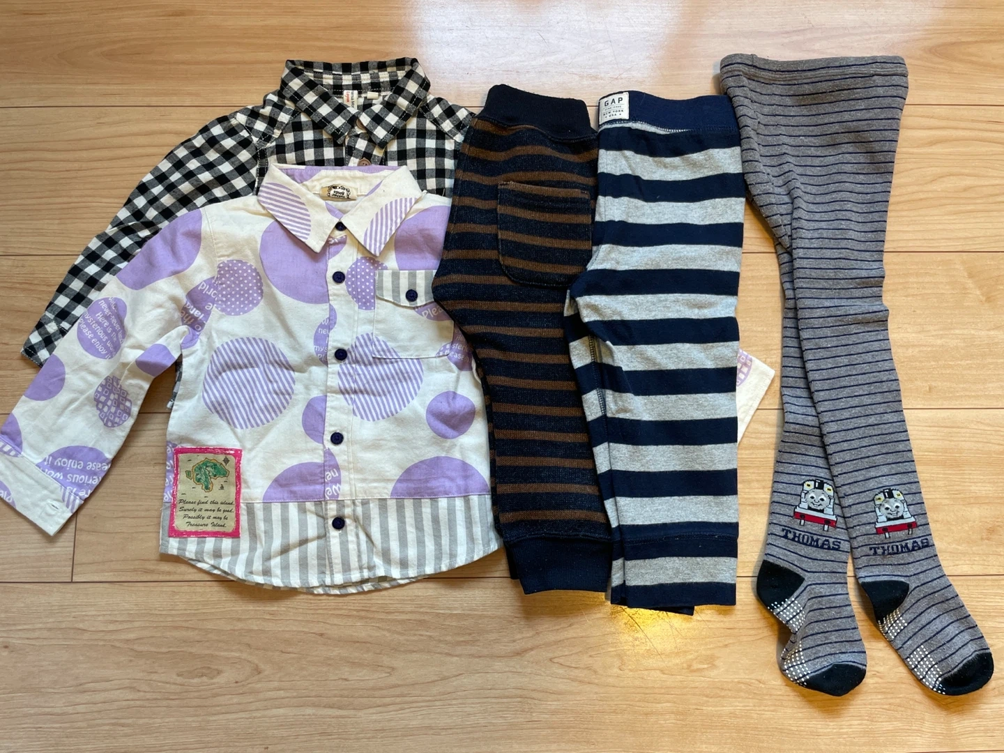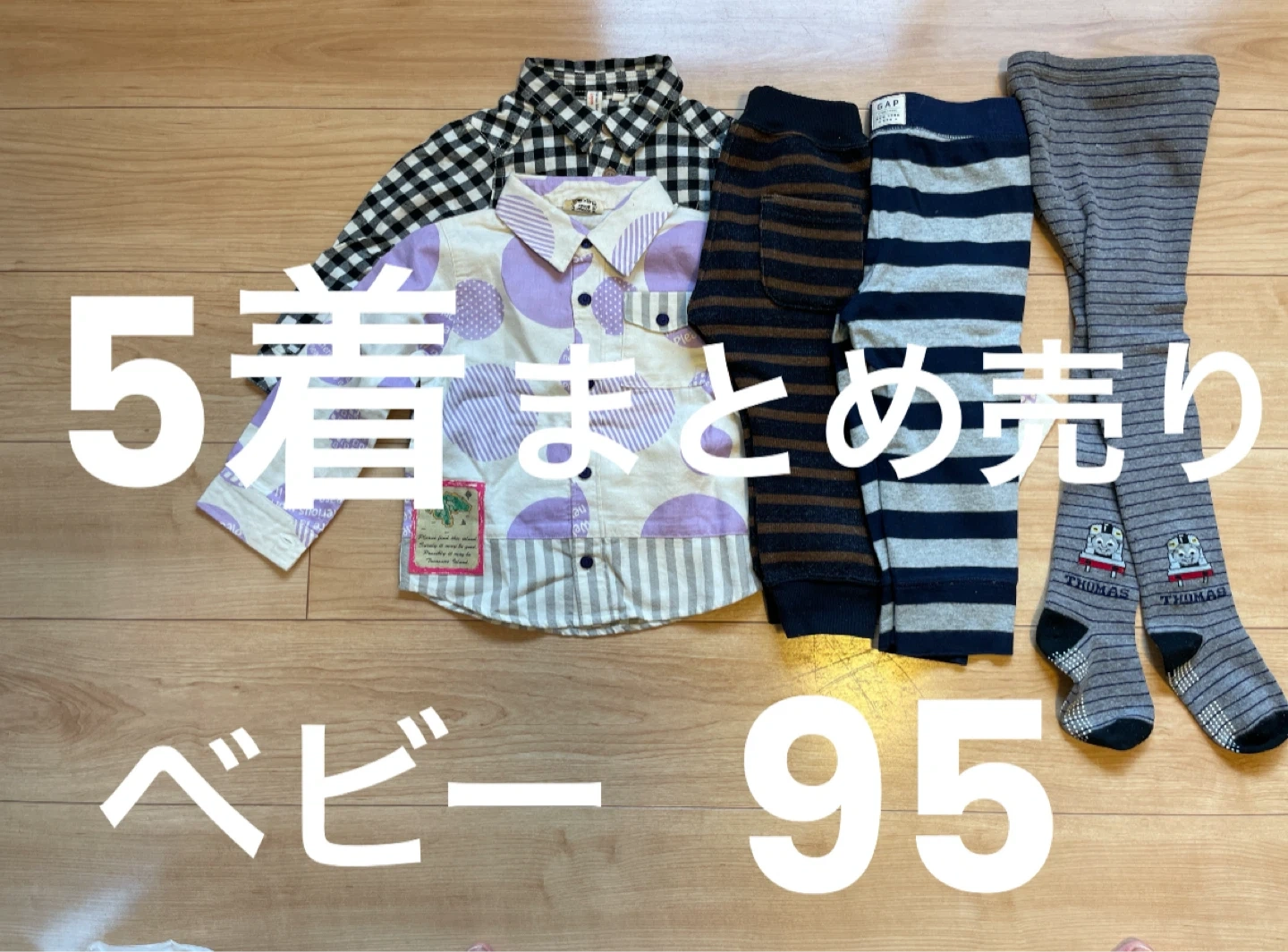 サイズアウトしたベビー服のまとめ売りです。 新品の物からお下がりでいただいた物まで様々です。 ①マザーグース  個性的な柄シャツです。  お祝いでいただき、自分では買わない  色柄なので、写真に納めようと思った  らもうサイズアウトでタグはありませ   んが新品未着用です。 ②サマンサモスモスLagom 白×黒チェックネルシャツ。  親子コーデできる色柄です。  着用少なく綺麗。 ③サマンサモスモスLagom  厚手のニット生地に裏起毛で  暖かさMAXな1着。  真冬日の外遊びに最適です。  着用少ないのですが、製品の特性上  表面に毛玉あり。 ④babyGAP  めっちゃ使いやすいスウェットパン  ツ。部屋着から外遊びまで。 ⑤機関車トーマスタイツ  いただき物で、内側タグに記名あり。  うちは着用せずサイズアウトしてしま  いましたが、半ズボンにこれを穿かせ  たら冬もいけたなとサイズアウトして  から後悔。 以上5着を欲しい方にお譲りします。 某フリマサイトにバラバラで出品してますが、合計すると2,000円超えるお品物たちなので、お買い得かと思います。 我が家にペット、喫煙者はおりません。 ・サイズ:95 ・シャツ2枚、ズボン2枚、タイツ1枚 ・ブランド:mother goose, Samansa Mos2 Lagom, GAP ・タイツにトーマスの絵柄あり ・全体的に使用感あり 中古品であることご了承ください