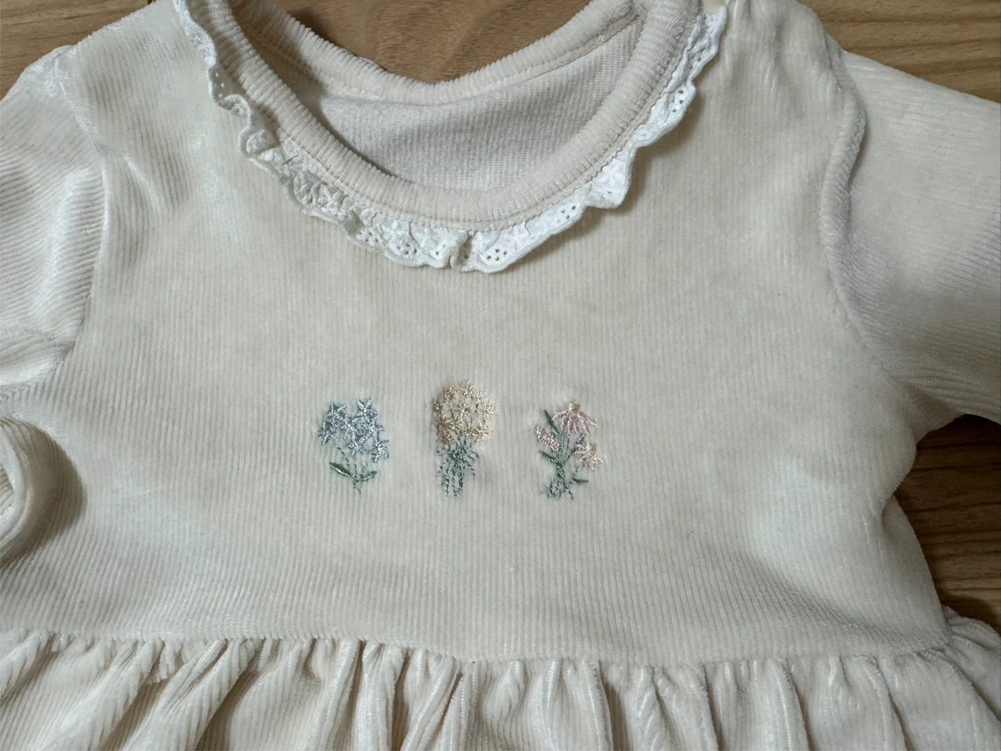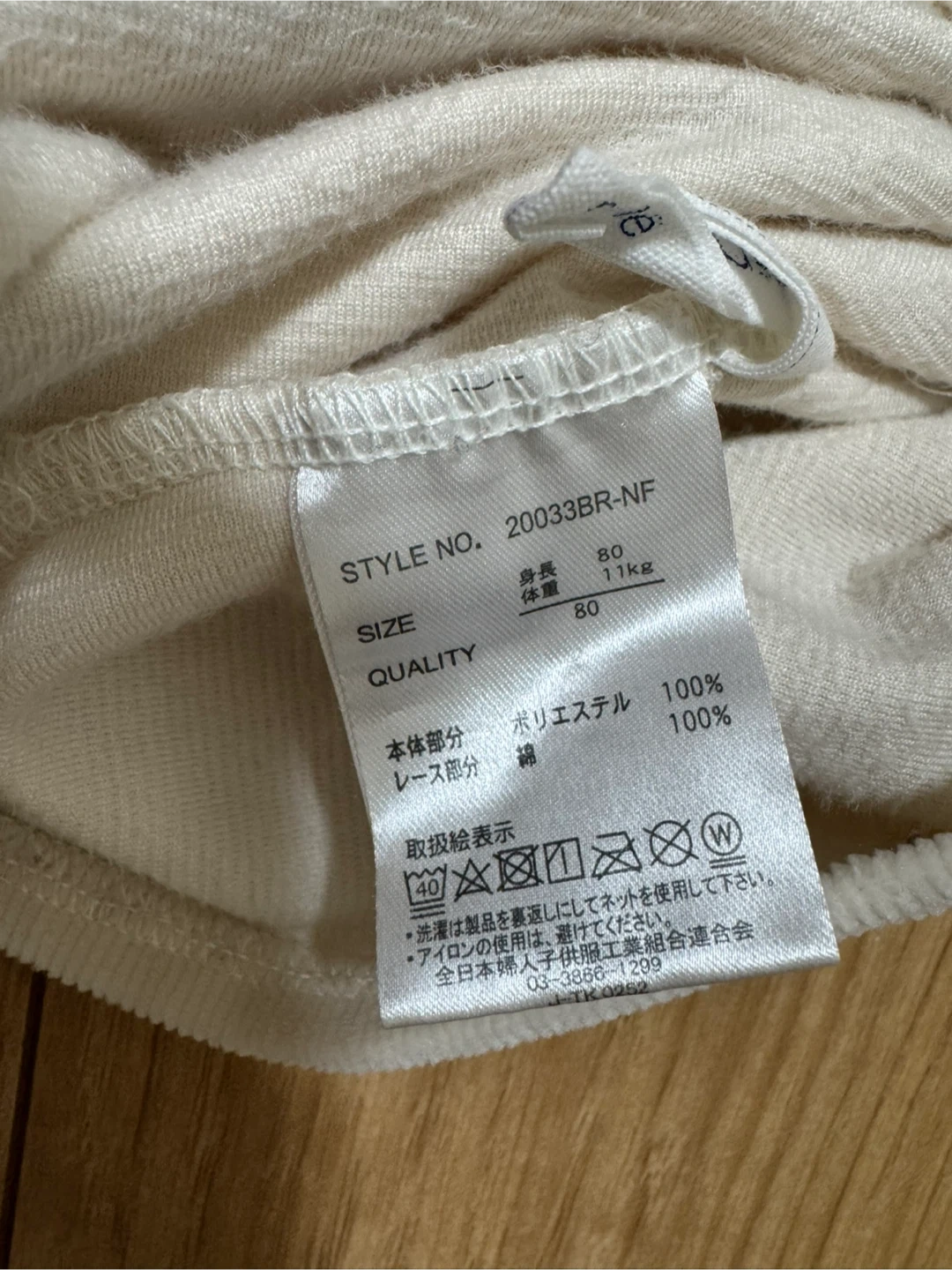 バースデイブランド、mamarakuのワンピース80サイズです。 ・色:クリーム色 ・サイズ:80 ・素材:ポリエステル100%、レース部分 綿100% ・スタイルNO:20033BR-NF ・小さな花の刺繍あり 中古品であることをご了承いただける方でお願いいたします。