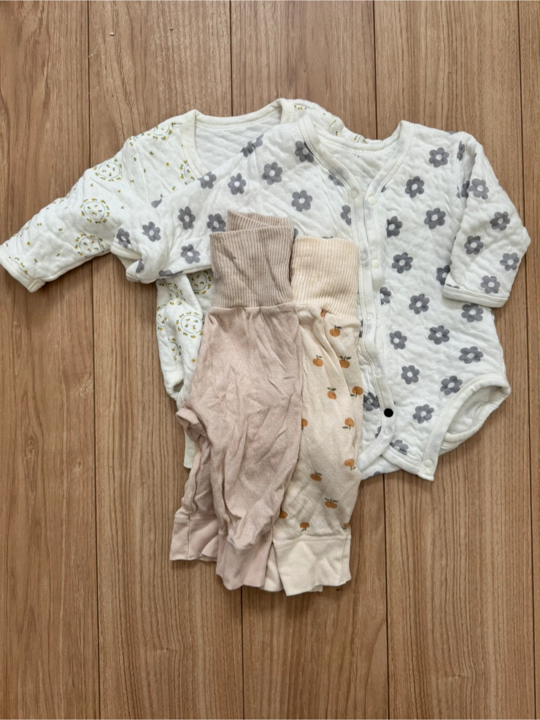 70cmのベビー服のセットです。 ・長袖前開きロンパース肌着2着 ・長ズボン2着 ・全体的に使用感あり ・ズボンにシミあり(画像参照) 昨年生後4-6ヶ月の子どもが使用していました。 中古品であることをご了承いただける方でお願いいたします。