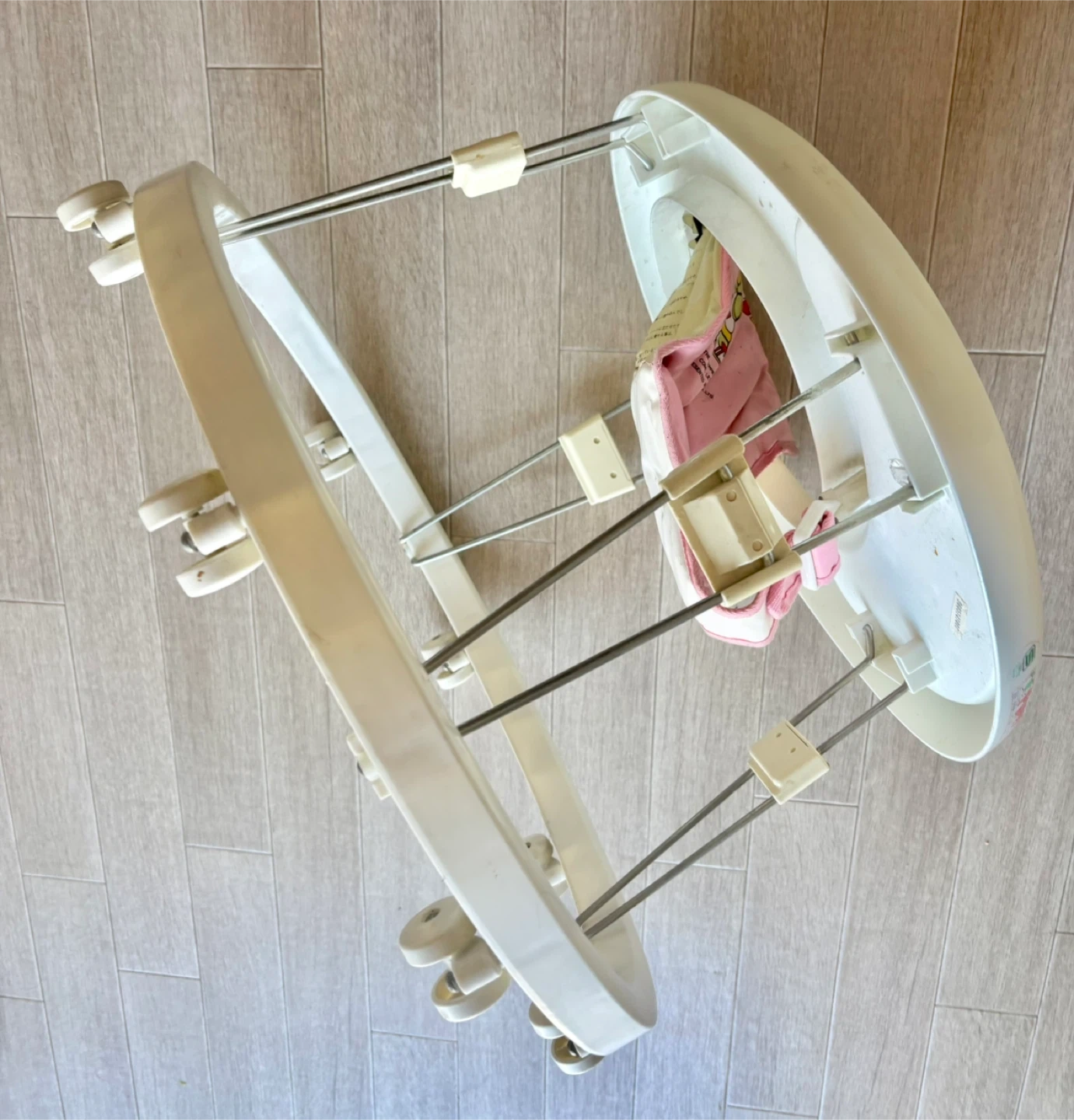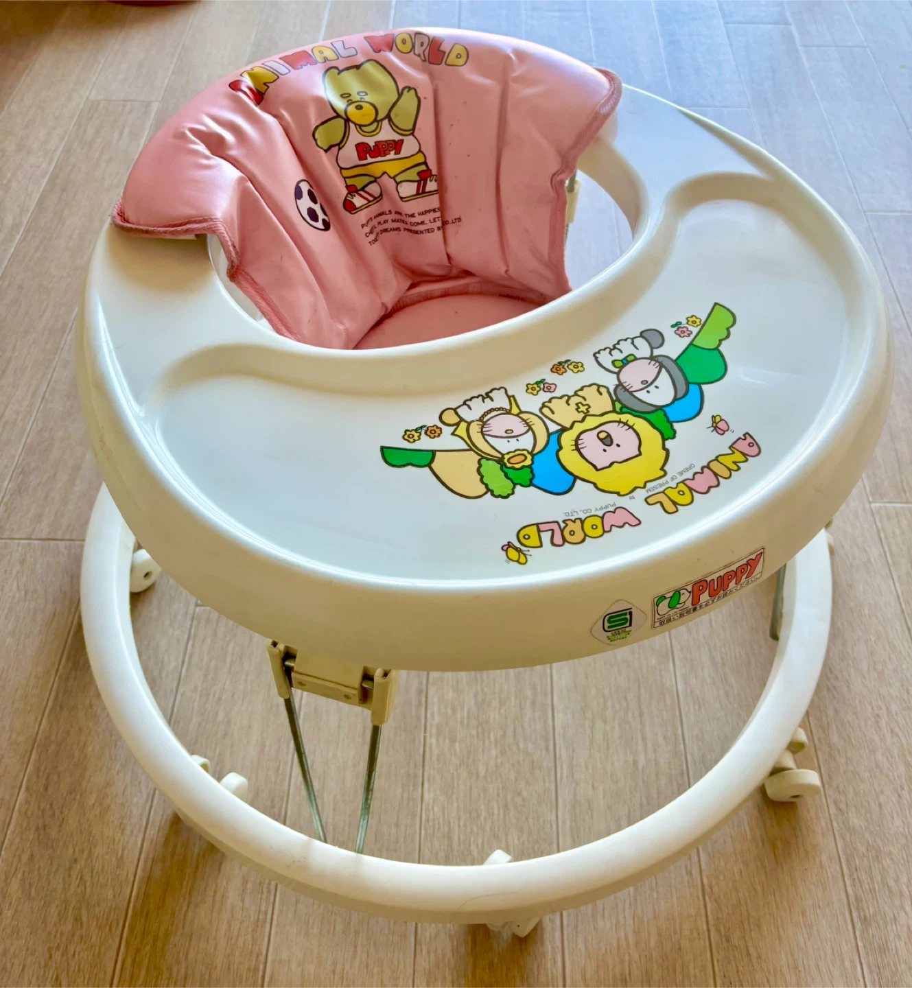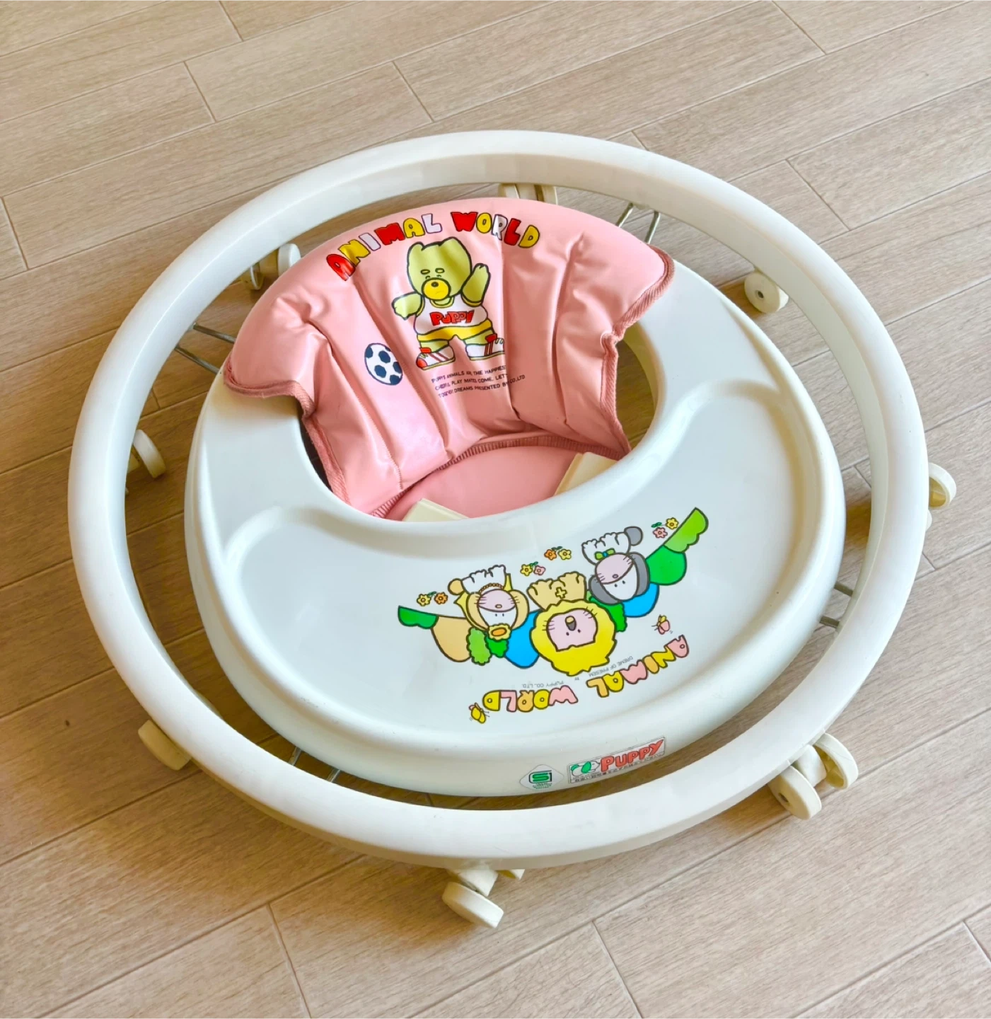 動物テーマのデザインで、サポートクッション付きの歩行器。ベビーチェーアがわりに使っていました。折りたたみ式です。 横幅  約60センチぐらい/一番大きな部分 高さ  約38センチぐらい/車輪含む 自宅保管品、中古品になります。酷いダメージ、壊れはないですが、小さなキズ、スレ、くすみ、金属部のくすみなどあります。 ご理解ある方にお譲りいたします、 - モデル名: Animal World 歩行器 - 色: ホワイト/ピンク - 特徴: サポートクッション付き - タイプ: 歩行器 - 素材: プラスチック/布 - デザイン: 動物テーマ - ホイール: 4つのキャスター付き ご覧いただきありがとうございます。 #ベビー #歩行器 #赤ちゃん #ベビーグッズ #補助 #歩行補助