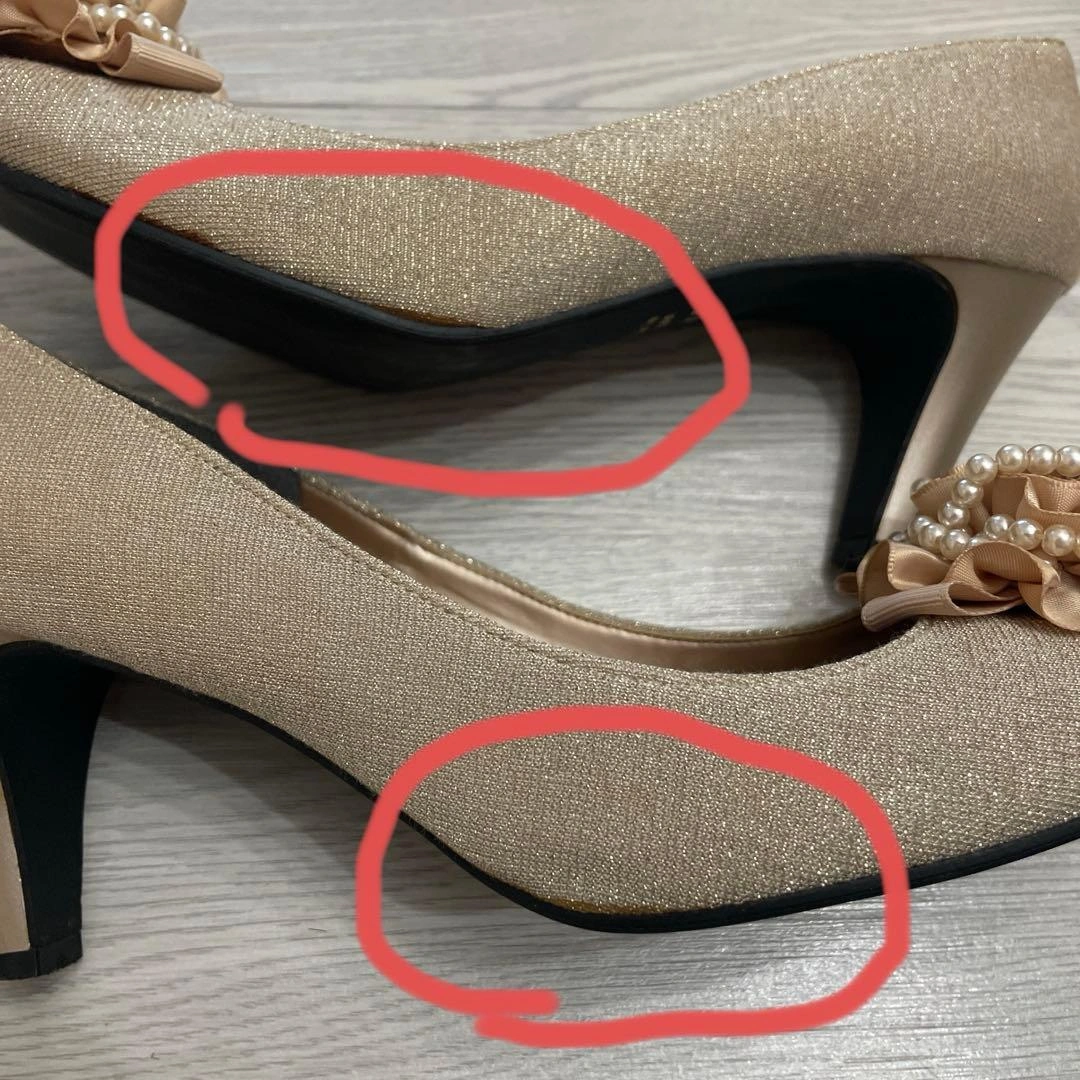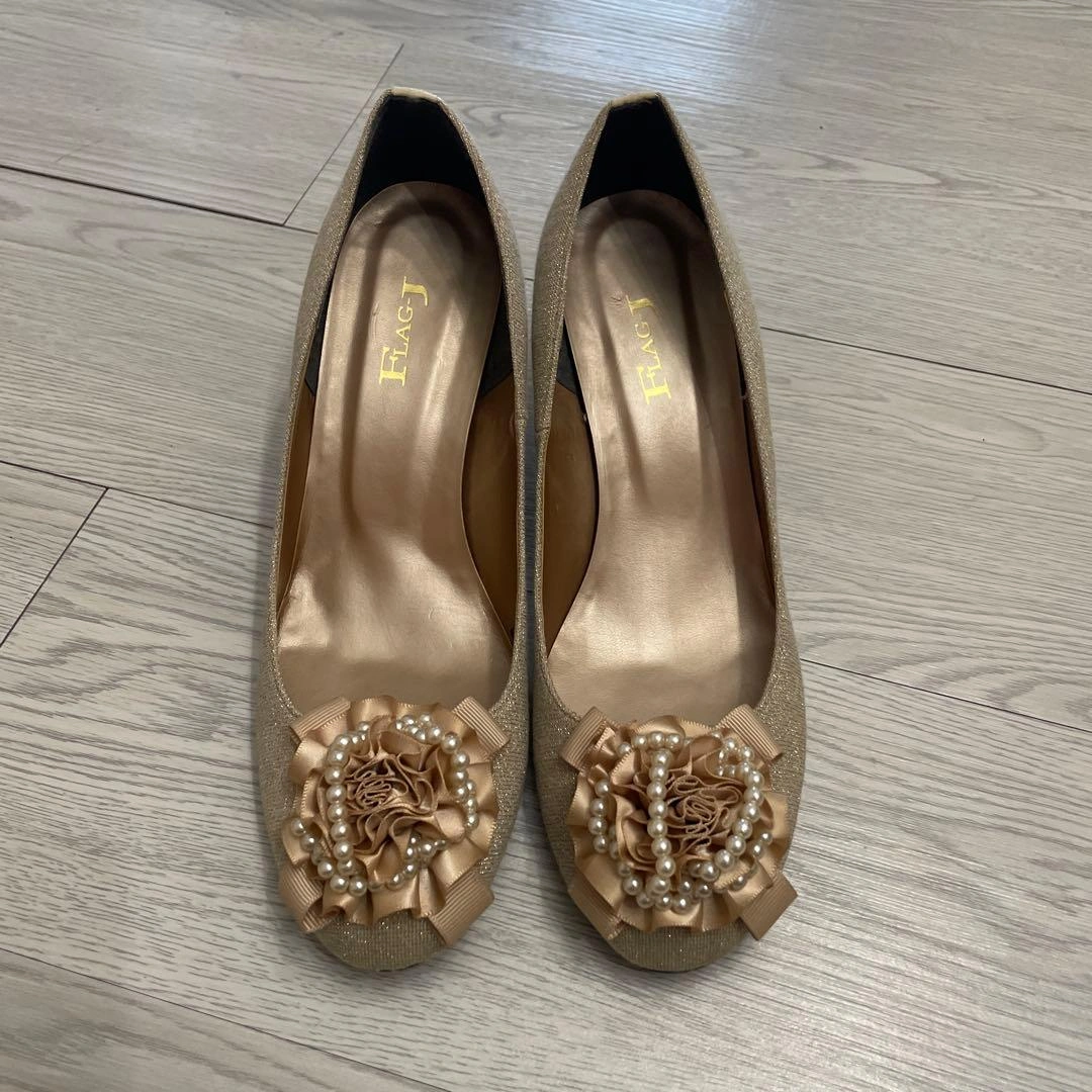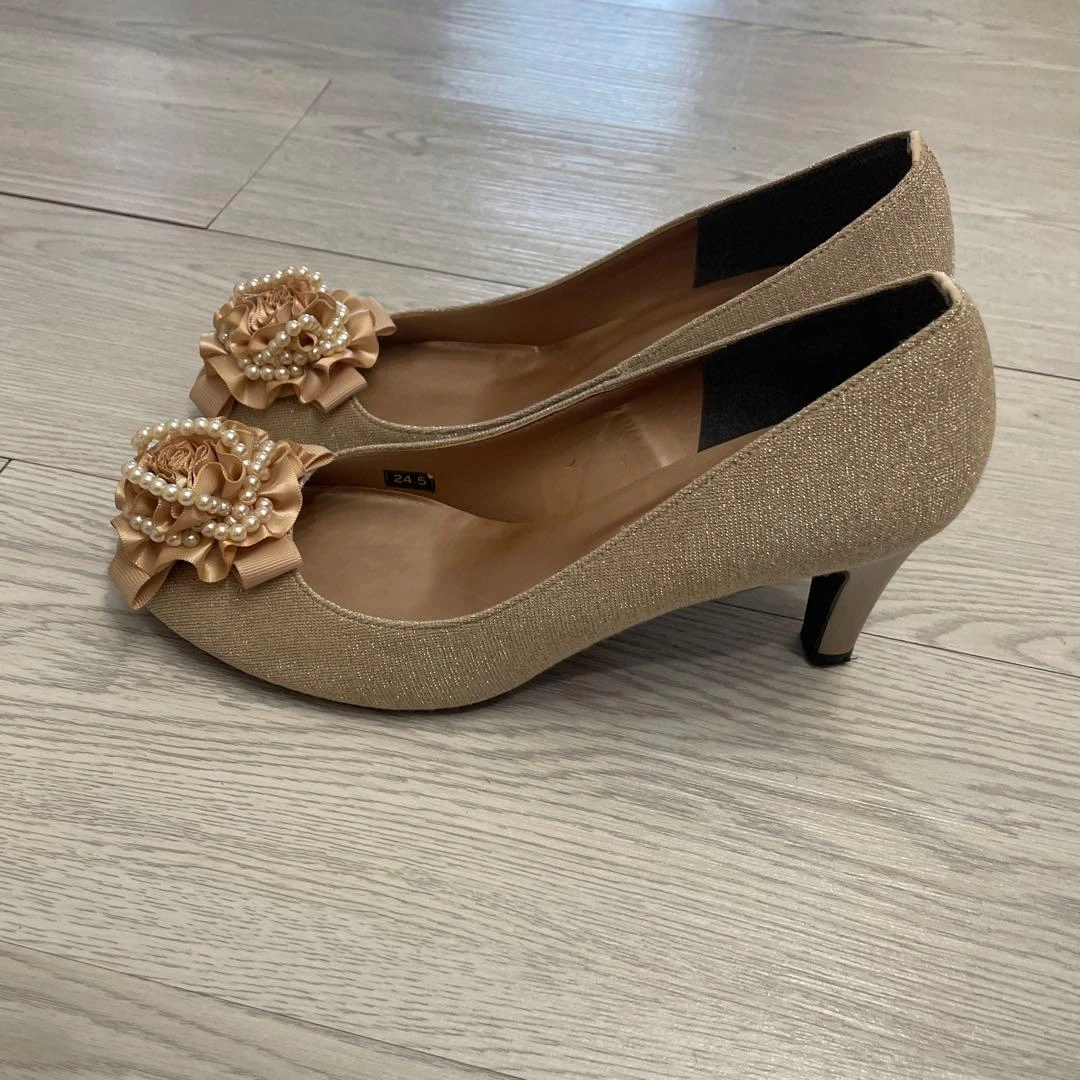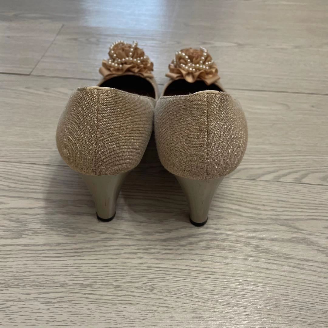 フラワー装飾が施されたベージュの中ヒールパンプスです。 結婚式に出席する為に数回着用しました。 中古品ですので神経質な方はご購入をお控え下さい。 - 色: ゴールドベージュ - デザイン: フラワー装飾付き - ヒールの高さ: 中ヒール7cm - 素材: ラメ入り生地 ご覧いただきありがとうございます。