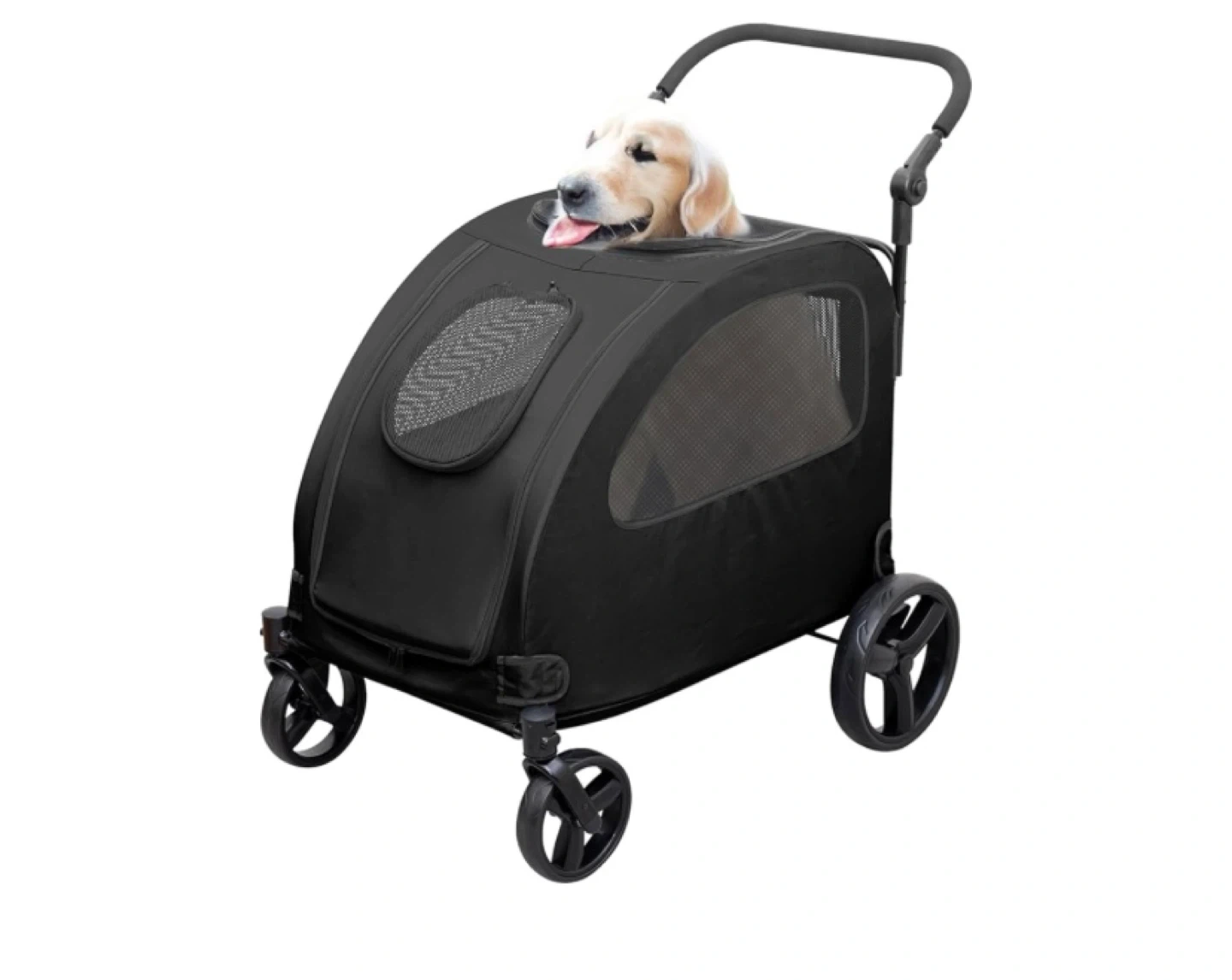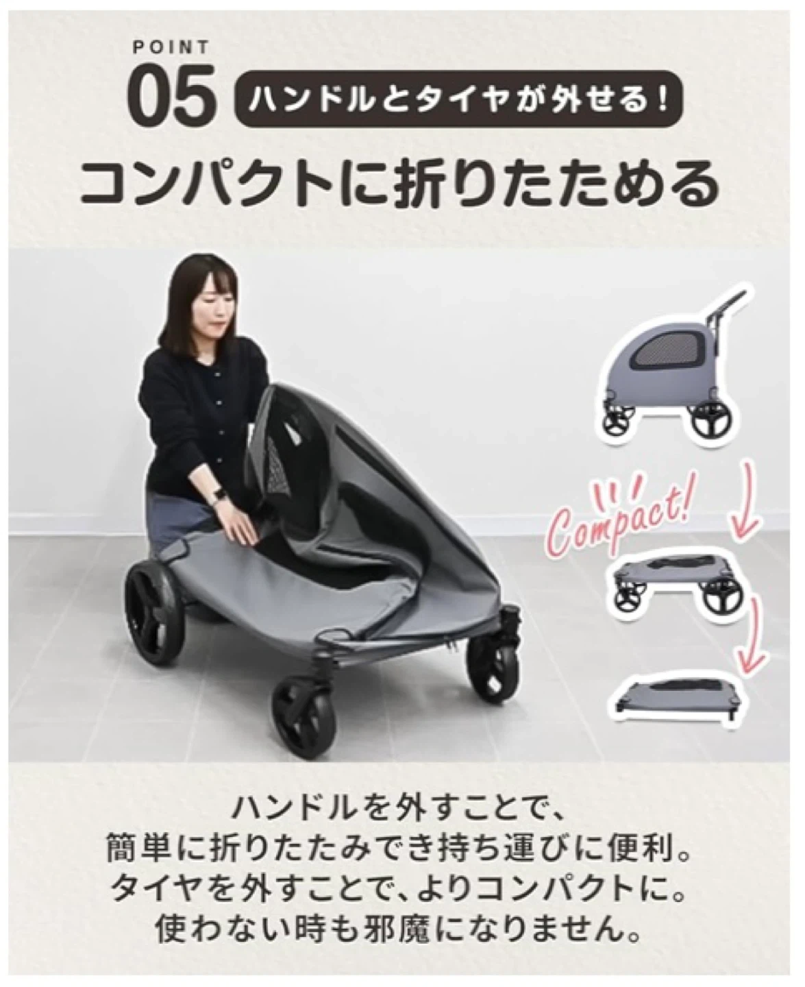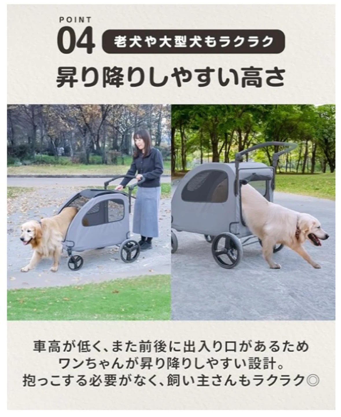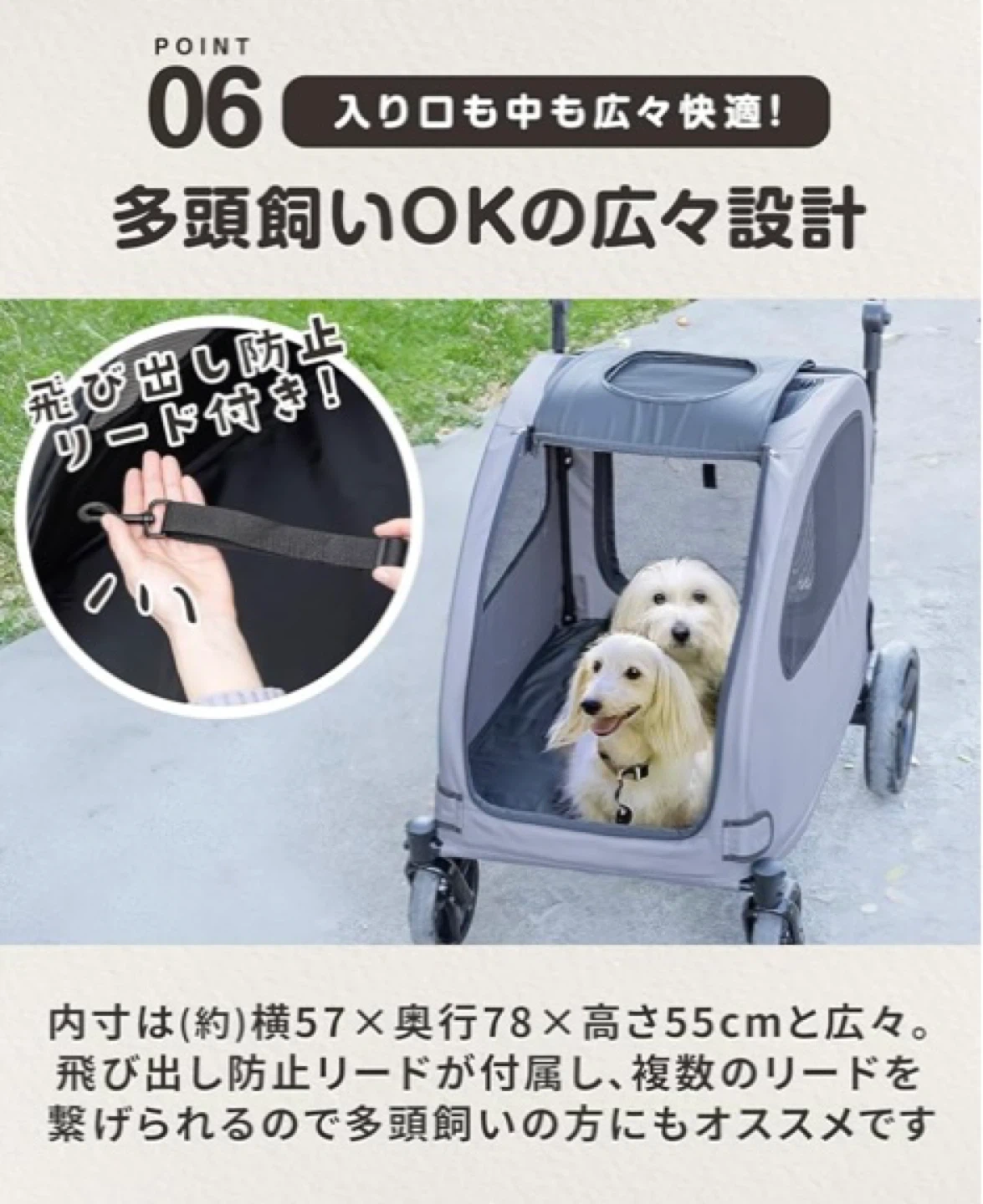 ペットカートです ・色:ブラック * 【大きな後輪タイヤで乗り心地良いスムーズ走行】 * 【通気性の良いメッシュ窓】 * 【止めやすい後輪ストッパー】 * 【昇り降りしやすい高さ】 * 【コンパクトに折り畳める】 * 【大型犬や多頭飼いOK耐荷重60kgの安心設計】 * 【押しやすい角度にできるハンドルは角度調節可能】 * 【商品詳細】(カート)■サイズ・展開時:(約)幅61cm×奥行99cm×高さ112cm※ハンドルの奥行は含まず※ハンドル最大高さ・折り畳み時①(ハンドルを外した状態):(約)幅71cm×奥行99cm×高さ31cm・折り畳み時②(ハンドルとタイヤを外した状態):(約)幅57cm×奥行78cm×高さ17cm・ケージ部分内寸:(約)幅57cm×奥行78cm×高さ55cm・飛び出し防止リードサイズ:(約)幅2.5cm×長さ123cm※1本付属※ナスカンを含まず※飛び出し防止リードは長さ調節可能 ■重量:(約)10kg ■材質:タイヤ:EVA フレーム:スチール 布:ポリエステル ■耐荷重:(約)60kg※大型犬対応 ■特記事項:商品はお客様組み立てとなります※組み立て用の工具等は不要です。 ⭐︎愛犬の為に購入しましたが、サイズが合わなかったので出品することにしました。 一回玄関で組み立てましたが、うちの子が大きくて乗せることが出来なかったので、未使用に近いです。
