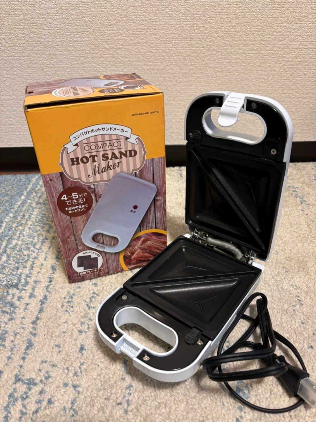 ほぼ新品!コンパクトホットサンドメーカー 一度だけ使用しました。 すぐに元の箱に戻して保管していたので、とても綺麗な状態です。新品とほとんど変わりません✨ 買ってみたものの、結局あまり使う機会がなかったため出品します。 付属品・箱すべて揃っています。 中古品にご理解のある方のみご購入をお願いいたします。返品・返金は対応しておりませんのでご了承ください。 即購入大歓迎です! ご質問があれば、ぜひお気軽にコメントください😊