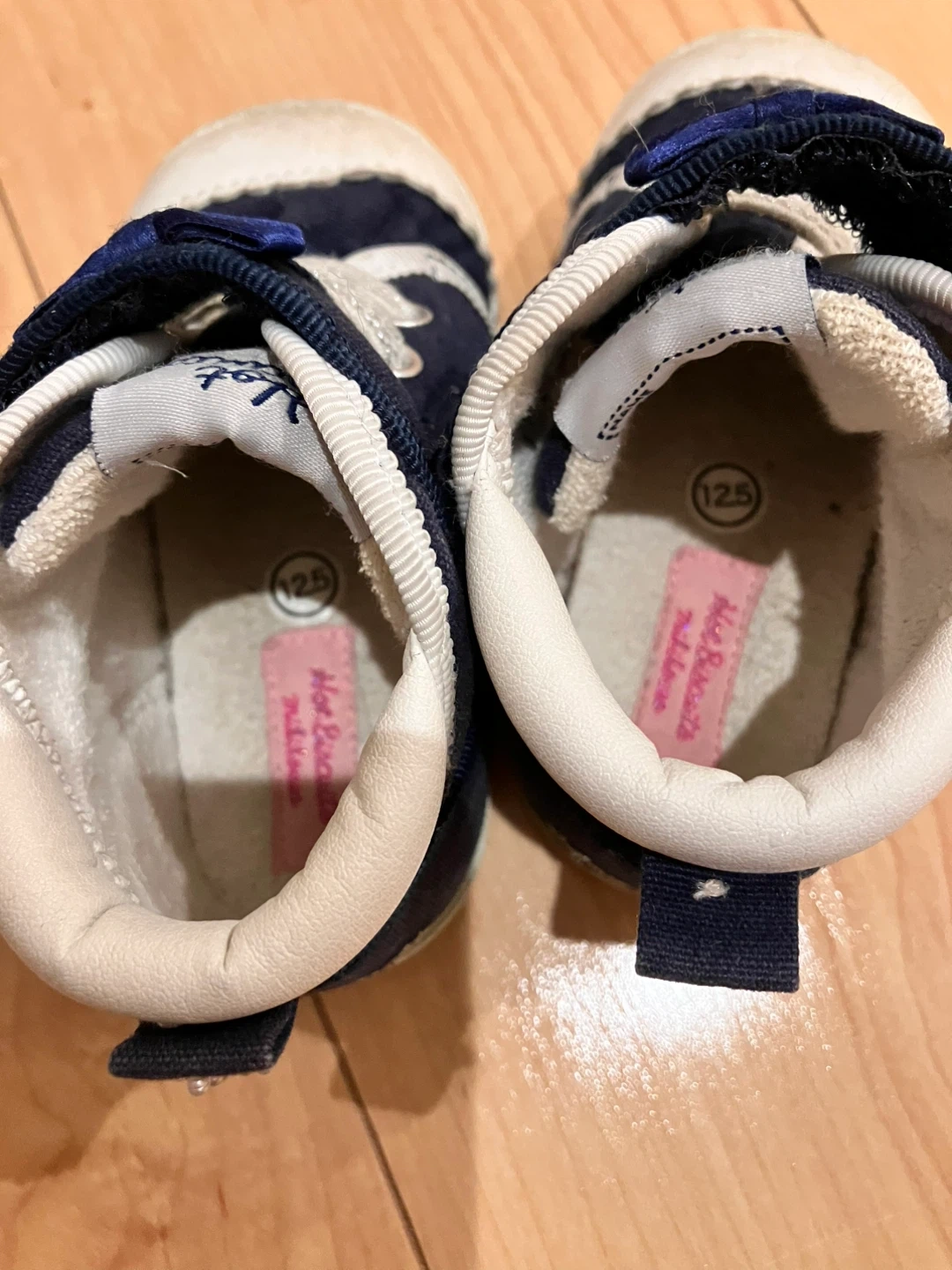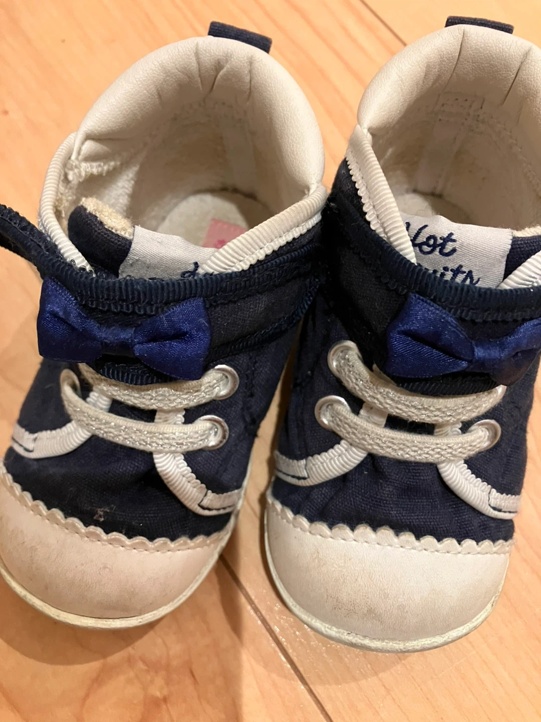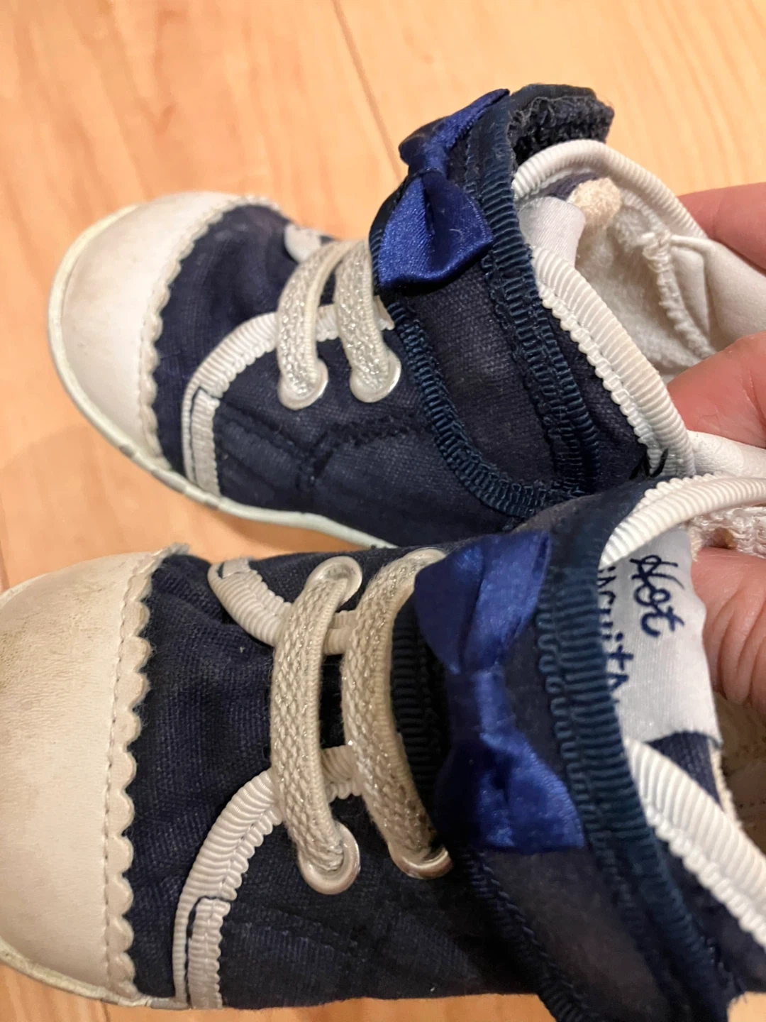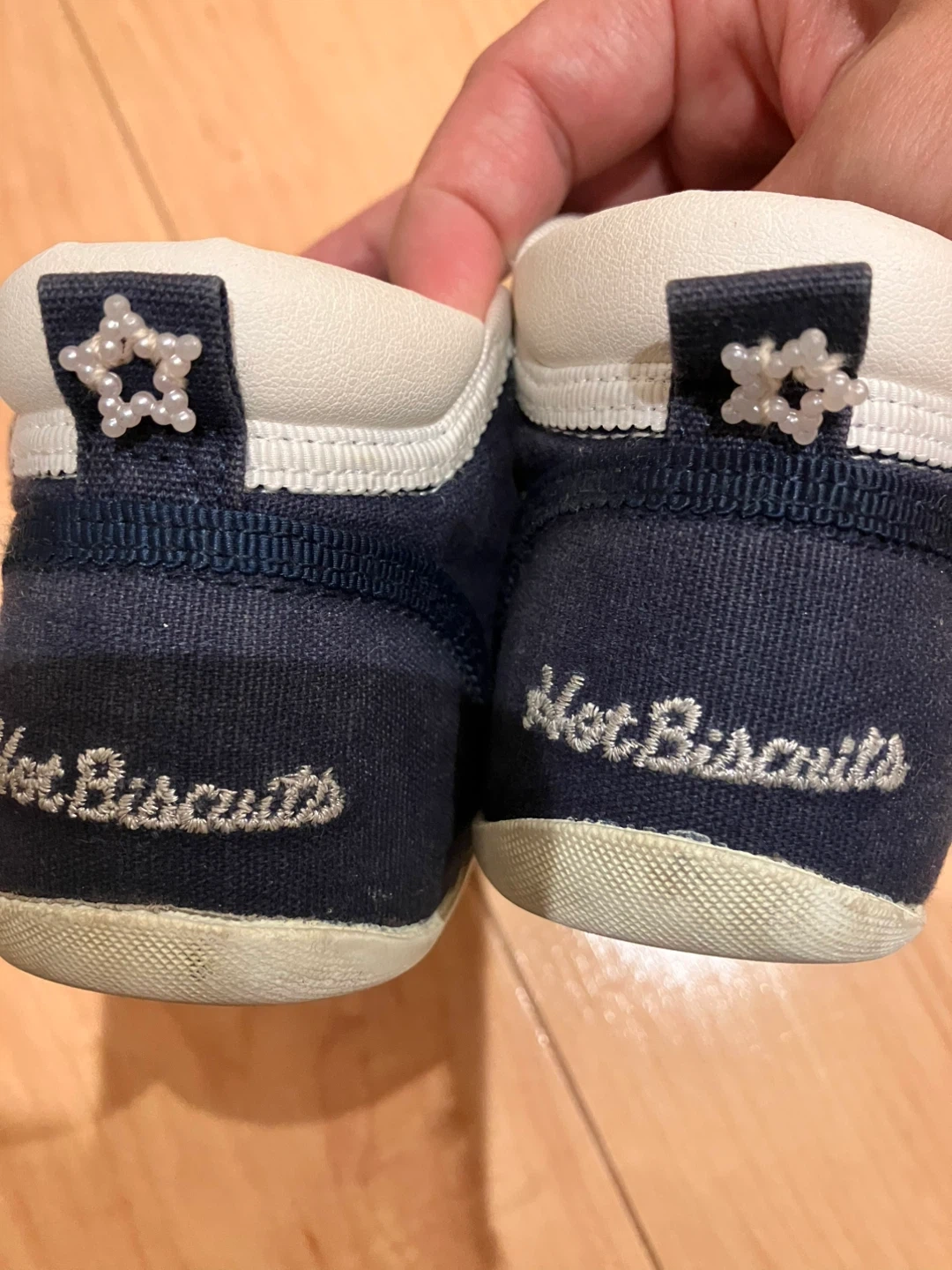 ホットビスケッツのベビーシューズです。 ・サイズ:12.5cm ・カラー:ネイビー ・リボンと星の飾りが付いています ・多少の使用感あり 中古品であることご了承ください もう一足あるため、わかりやすいように靴のタグに星の刺繍を縫い付けていますが、外してお渡しもできます。 さほどたくさんは履いていないため、靴底の減りもほぼありません。