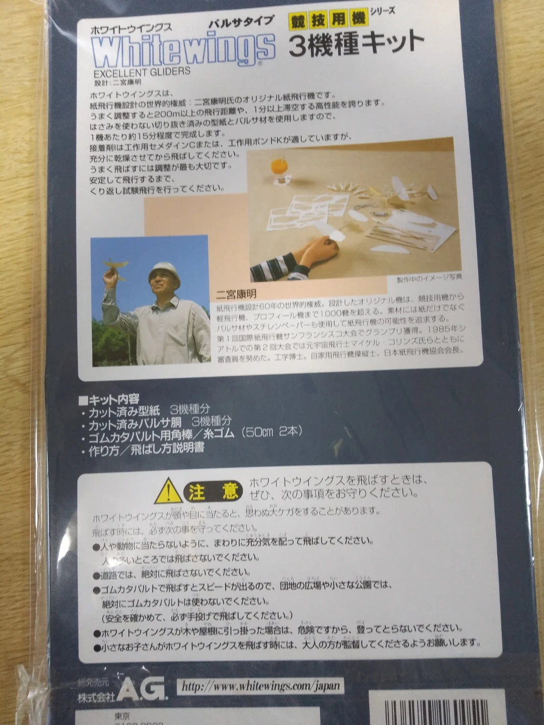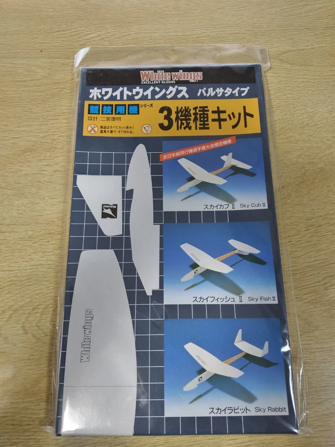 ホワイトウイングスの紙飛行機キットです。 【情報】 種類:紙飛行機キット 内容:3機種キット 【付属品】 カット済みバルサ型紙 3機種分、コムサバルド用角棒/糸ゴム(50cm 2本)、作り方/飛ばし方説明書 購入したけれど作らなかった未開封の物です。小学校高学年以上向きだと思います。