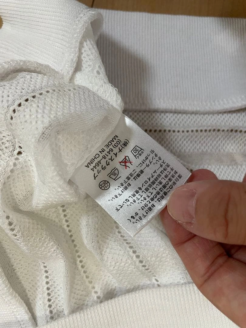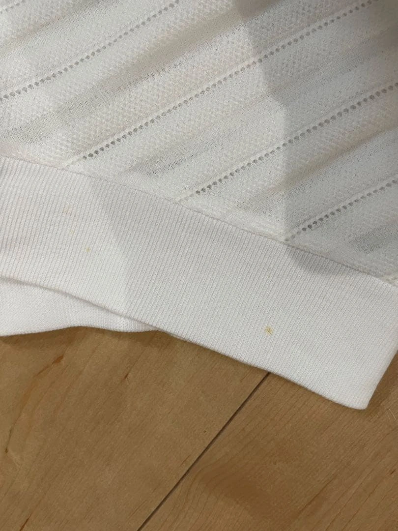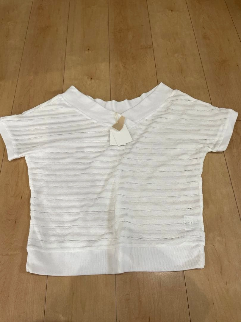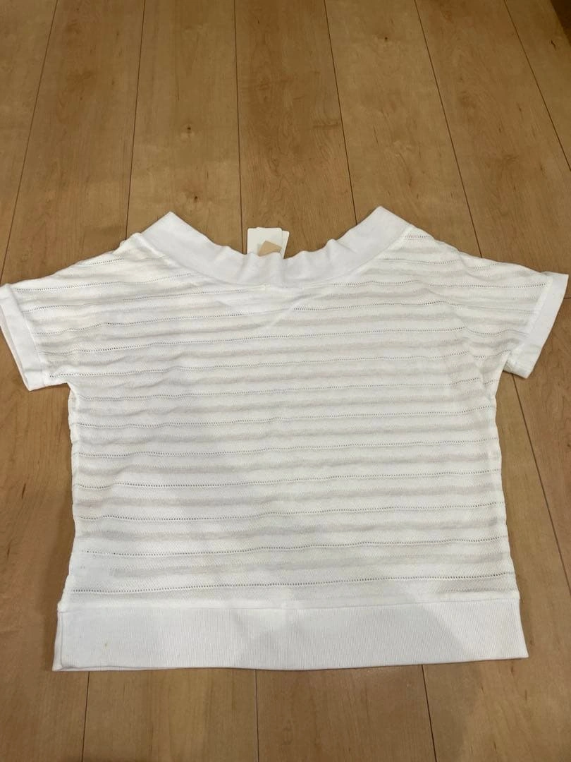 ストライプデザインのホワイトニットです。アクリル・ナイロン素材。 - 色: ホワイト - 素材: アクリル、ナイロン - サイズ: フリーサイズ - 特徴: ストライプデザイン、半袖 ※こちらは新品タグ付きですが長期保管により裾と襟部分に薄い黄色いシミが付着しております。画像8枚目以降に載せてます。洗濯すれば落ちるかもしれませんが、わからないためお安く出品します。 ご希望の方はお気軽にご連絡ください。