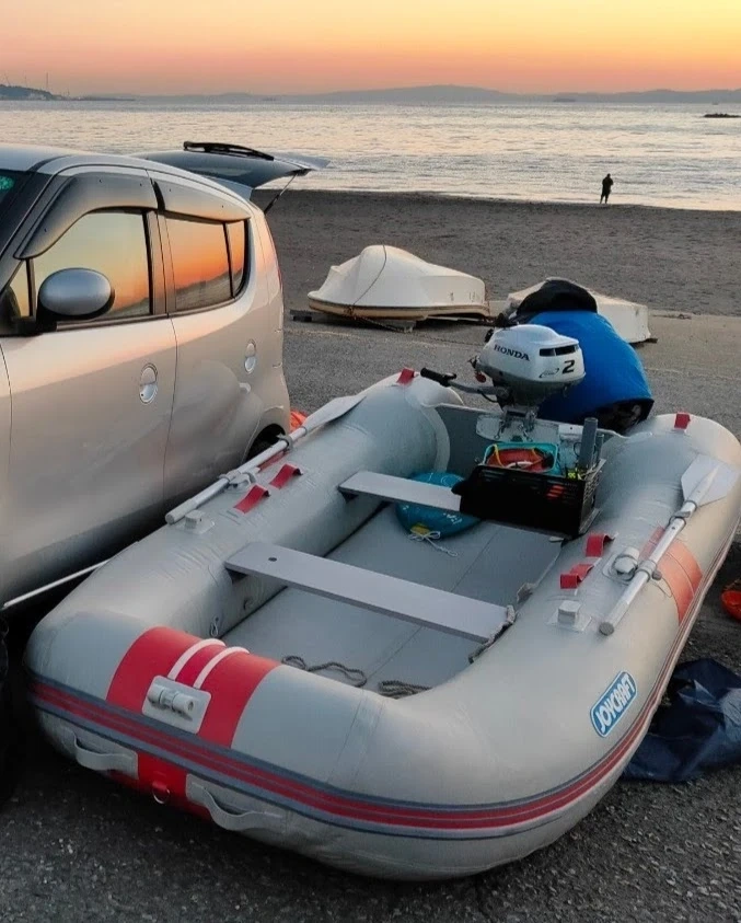JOYCRAFTゴムボート(オール、電動高圧ポンプ、リアドーリー他) HONDA2馬力空冷船外機(4スト)のフルセットです。船外機スタンド、ガソリン 携行缶(10㍑)マッシュルームアンカー(約40㍍ロープ付き)もオマケで付けます。それなりの使用感はありますが、10月に使用した際、何の問題もありませんでした。もちろんメンテナンス済です。 竿とリール、餌、クーラーが、あれば直ぐにボートデビュー出来ますよ。🤗