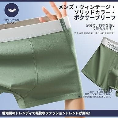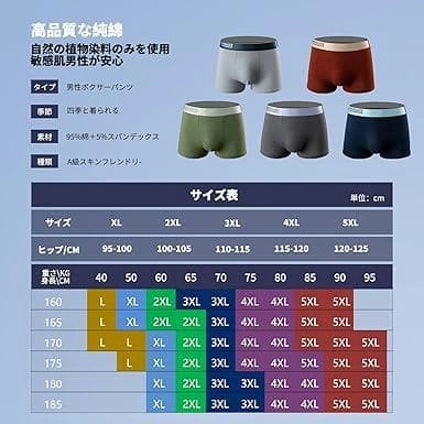 ご覧いただきありがとうございます。 【サイズ】 サイズ表を参照してください。※普段よりワンサイズ上をオススメします※。XL=日本サイズM(体重目安50-60kg) ♦サイズが合わない等の理由での返品は受け付けません。 【素材】コットン95%、スパンデックス5%;柔らかでしなやかな肌触りの超長綿、肌にやさしい快適ボクサーパンツです。季節問わず爽快な履き心地を実現しました 【前閉じ&立体設計】大切な部を守るために、2重生地を作ります。ボクサーパンツのフロント部は前閉じタイプで、押さえつけない立体設計が密着せずに収まりも良く、とても自然でまるで何も履いていないかのようです。 【快適なウエストゴム】腰回りに自然にフィットして、締め付け感のない履き心地、それでもしっかりフィットするように厚めの素材で構成されております。腰回りのゴムの跡が付くなどもなく履きやすさ・脱ぎやすさを実現しております。 【驚きの吸水速乾性を実現】不快な汗をすぐに乾かし、サラッとした肌触りをキープし続けますので、汗の気になる季節でも安心して着用していただけます。 ご希望の方はお気軽にご連絡ください。