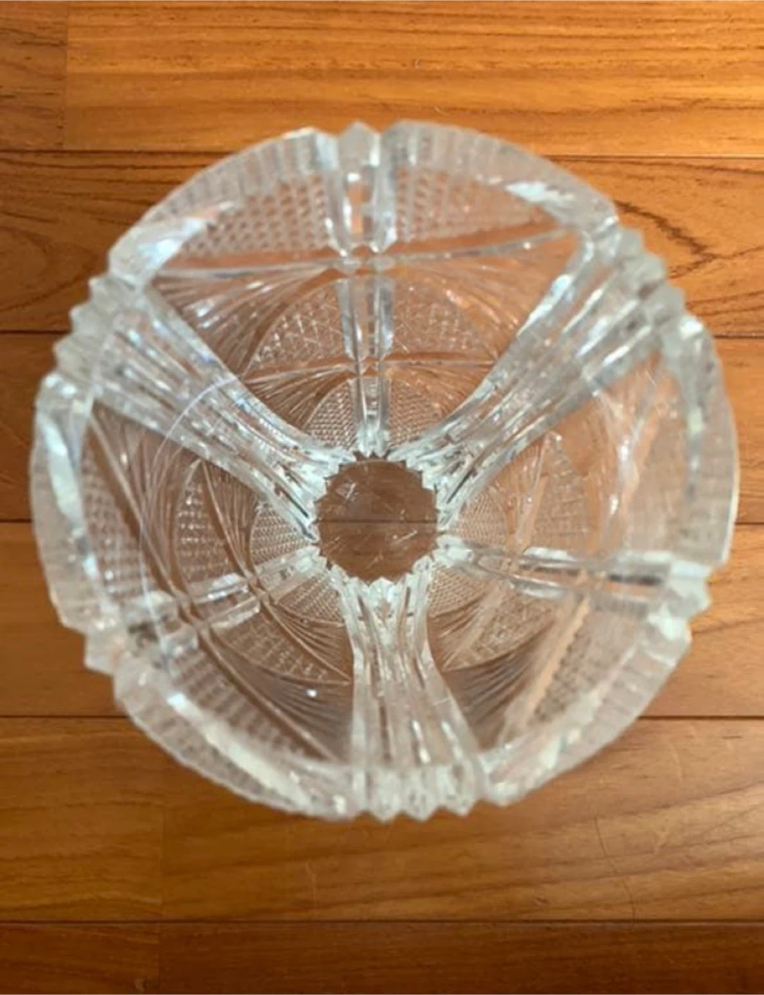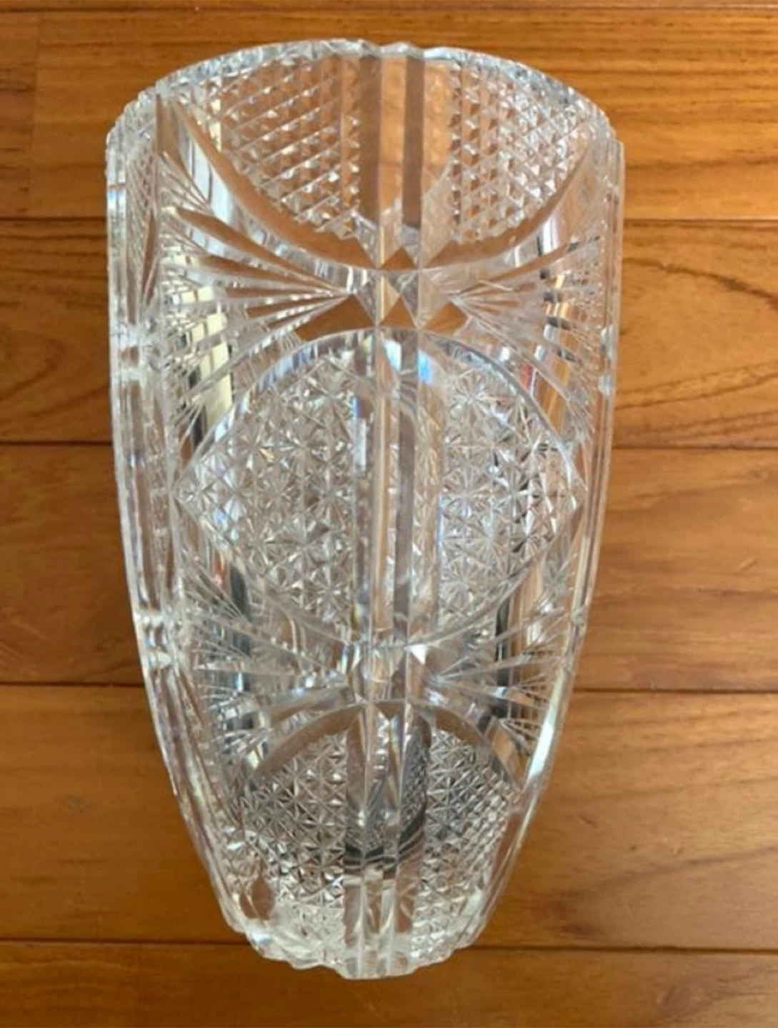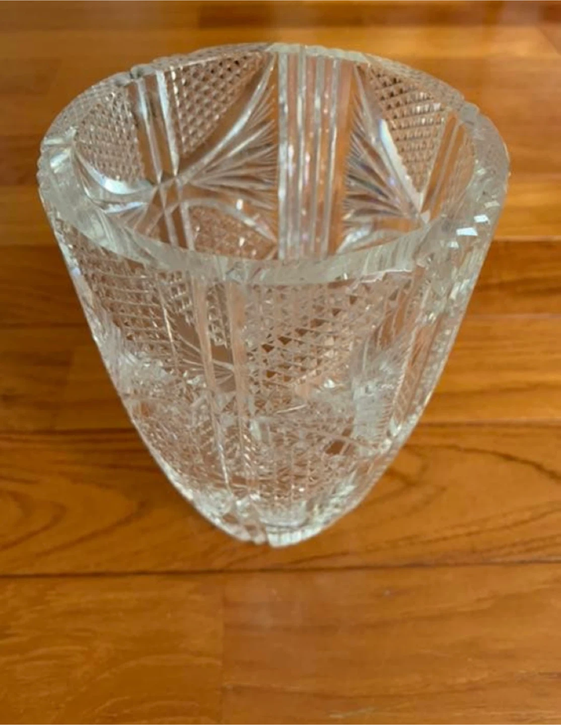 ボヘミアグラス 直径約11×高さ約17(cm) ※本体にはボヘミアグラス等の刻印はありません。 かなり細かく繊細にカットされた模様です。見た目では分かりませんが縦にカットされた筋の角が、爪を当てて滑らせると、ところどころ引っかかりますから細かな傷などはあります。 また底部には少し深い擦り傷があります。 大きな割れや欠けはありませんが年代物なので経年変化や経年劣化、擦り傷がありますので、画像を良くご覧頂き、ご理解ご納得の上、お買い求めください。 なお確認されたい箇所があれば画像追加致しますので、お伝えください。 お客様都合による返品はご遠慮下さい。