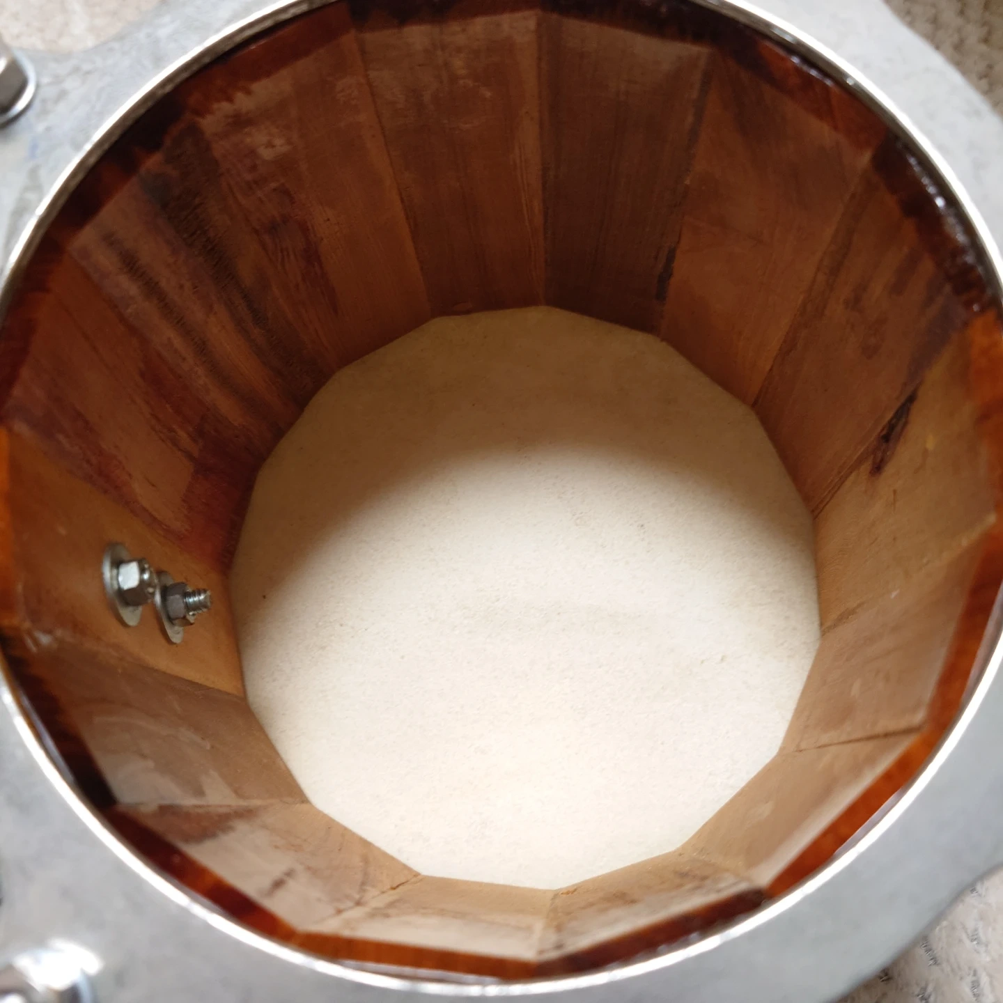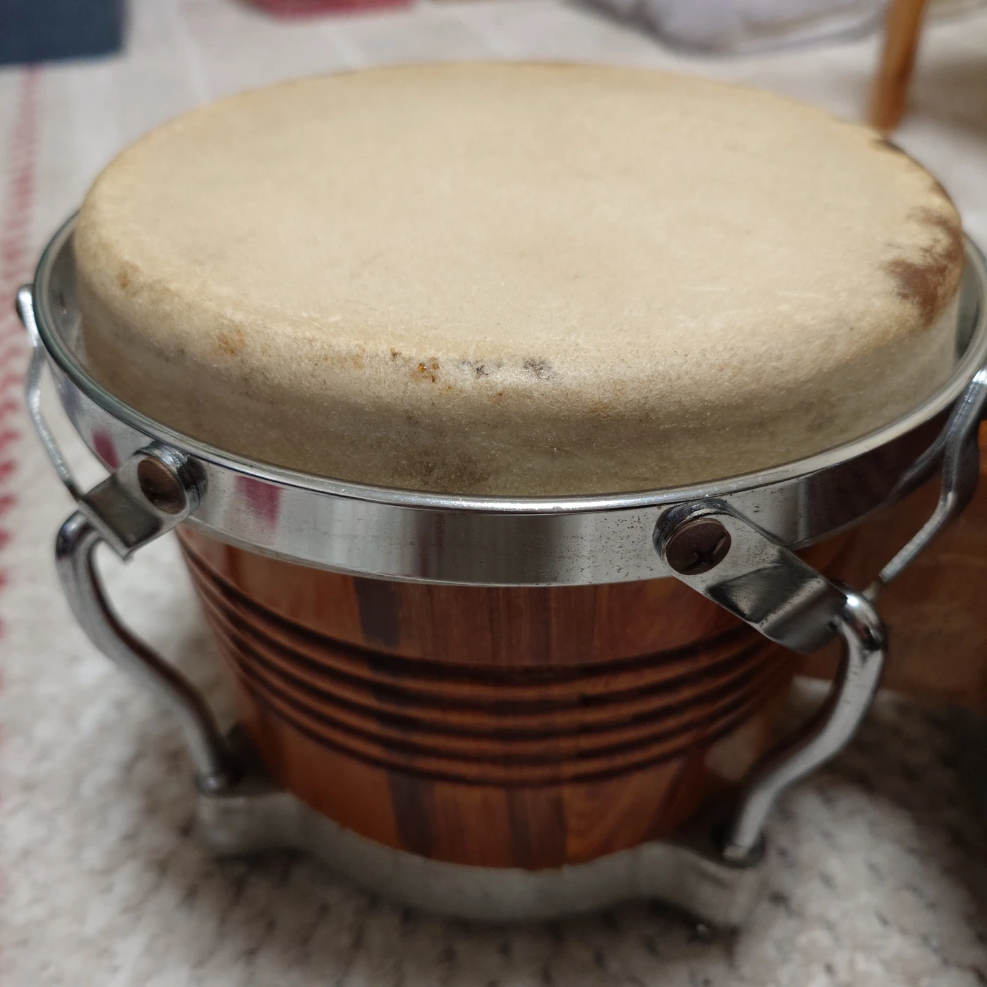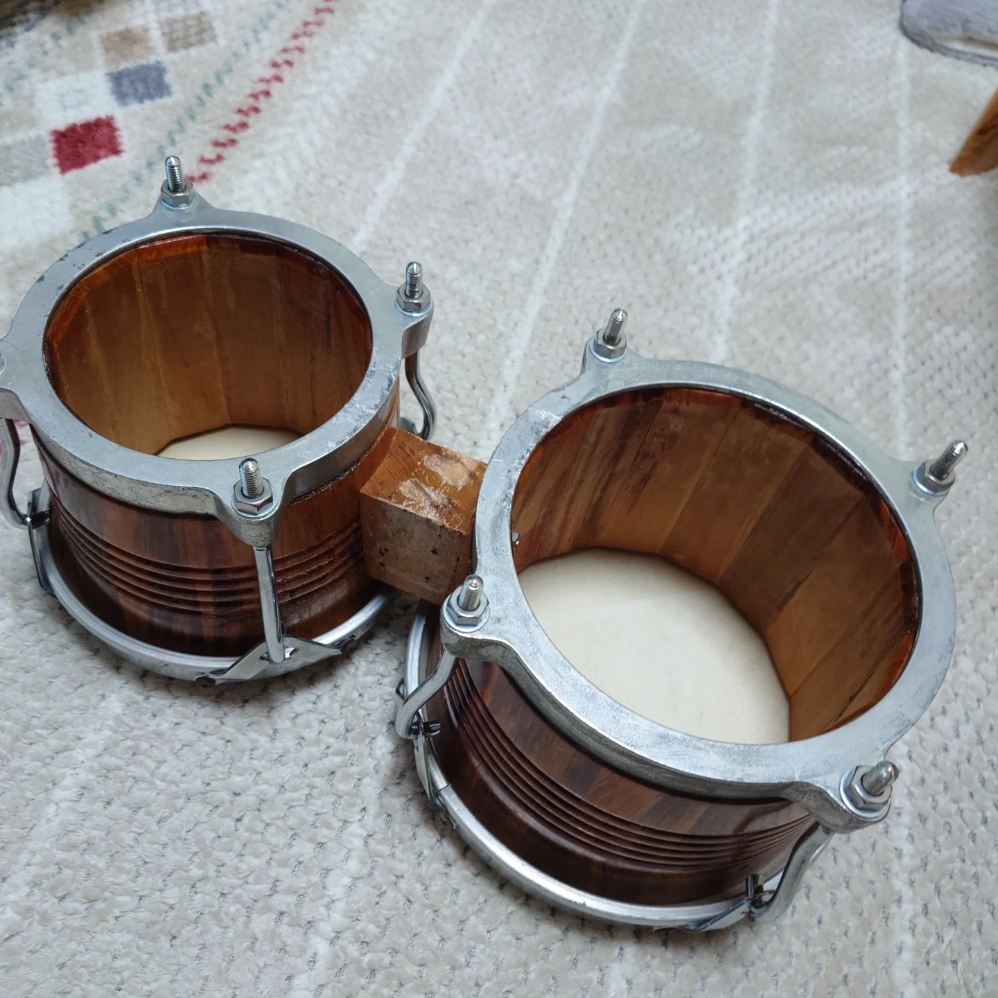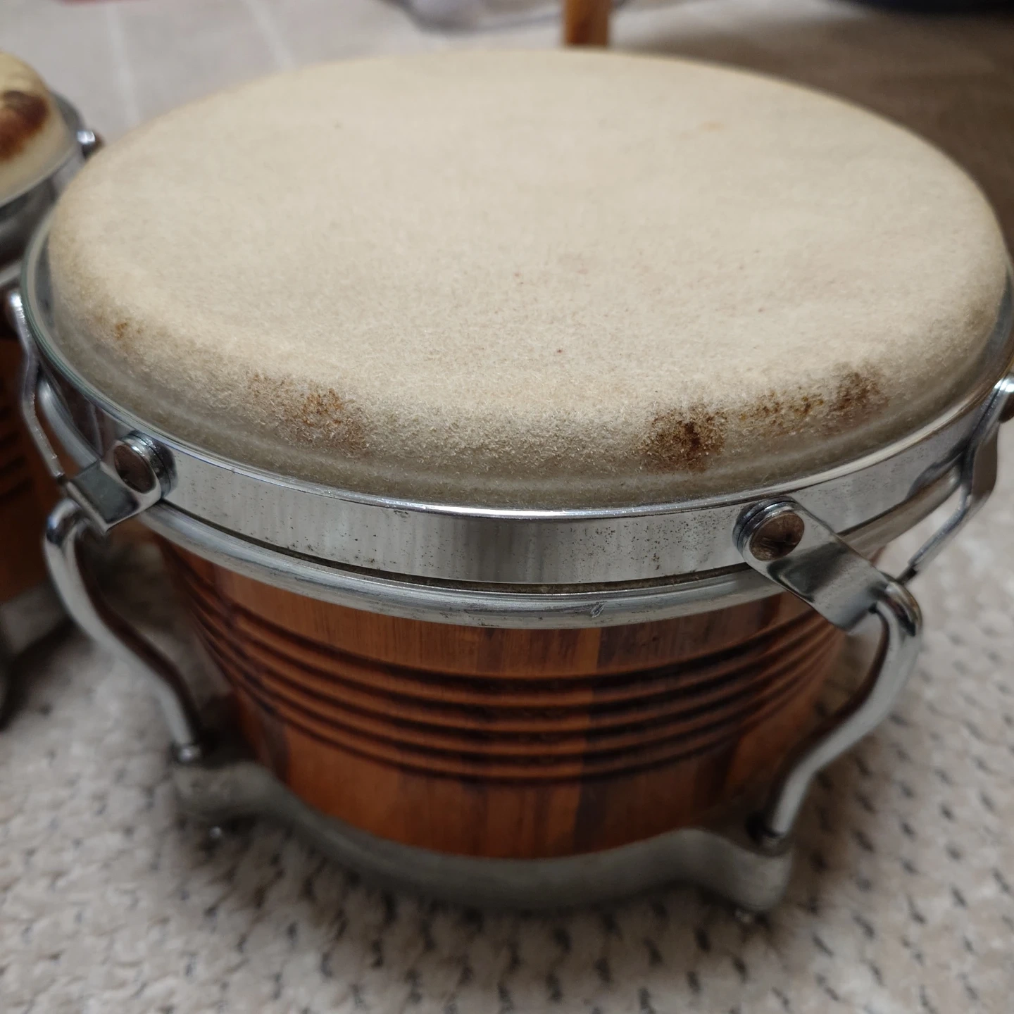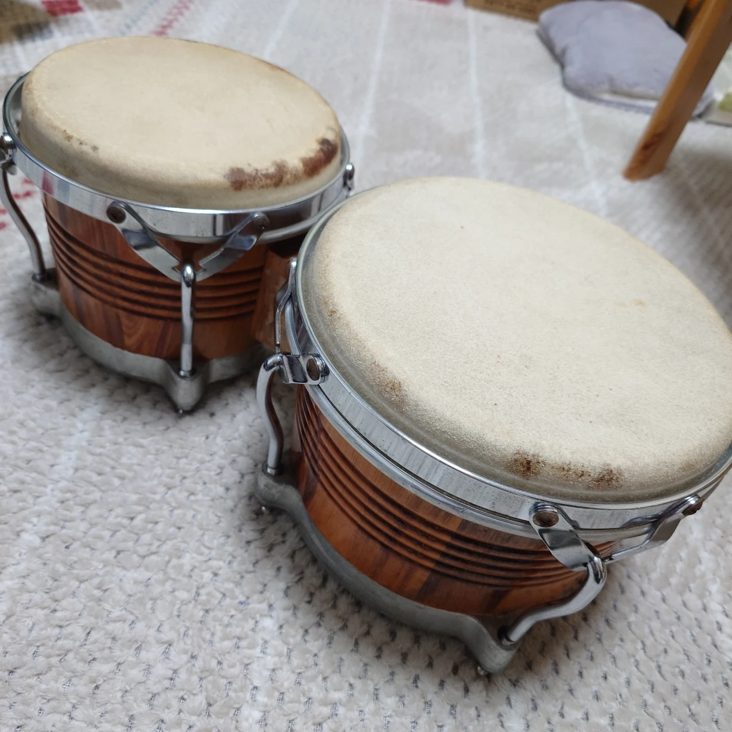 ラテン楽器の代表的な打楽器「ボンゴ」です 昔使っていたものですが、年末の片付けで整理して出品する事にしました。 両足に挟んで座って演奏する場合と、ボンゴスタンドに備え付けて立って演奏する場合とで、使い分けてください。 皮の汚れは経年劣化によるものですが、大、小、両方とも打音、響き共に残っていますので、使えるレベルと思います。 年末年始の家族の集まりで、ボンゴにリズムに合わせて、家族歌合戦とか、子供のリコーダーやピアニカに合わせて演奏するとか、楽しい音楽時間にボンゴを使ってみてはいかがでしょうか? お渡しは直接の手渡しとなります。ご都合あわせてお引き取りをお願いします。