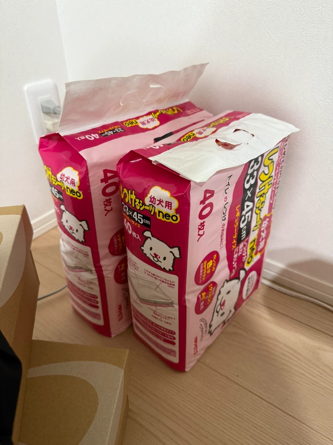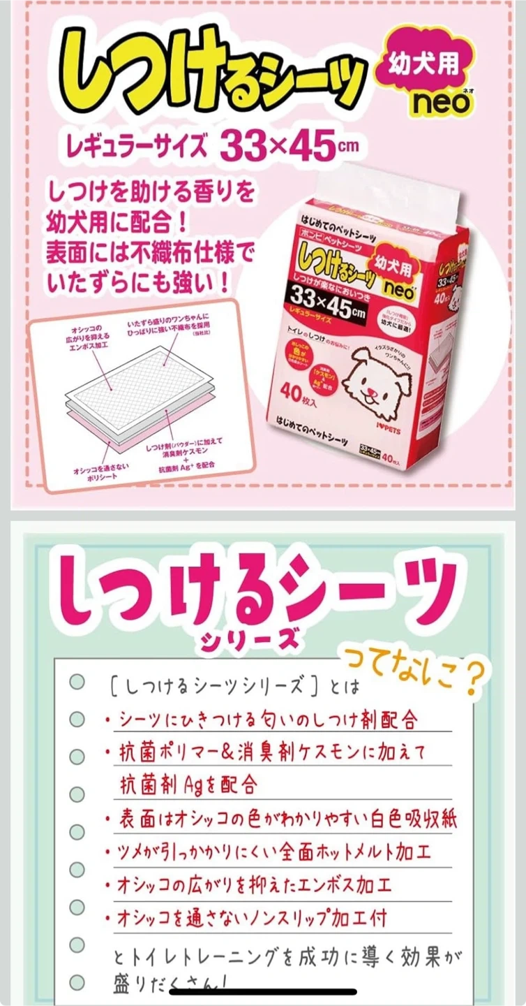 ボンビアルコンのペットシーツです。 ・ブランド:ボンビアルコン ・ペットシーツ ・幼犬用 ・サイズ:33×45cm ・40枚入 2つあるので全部で80枚