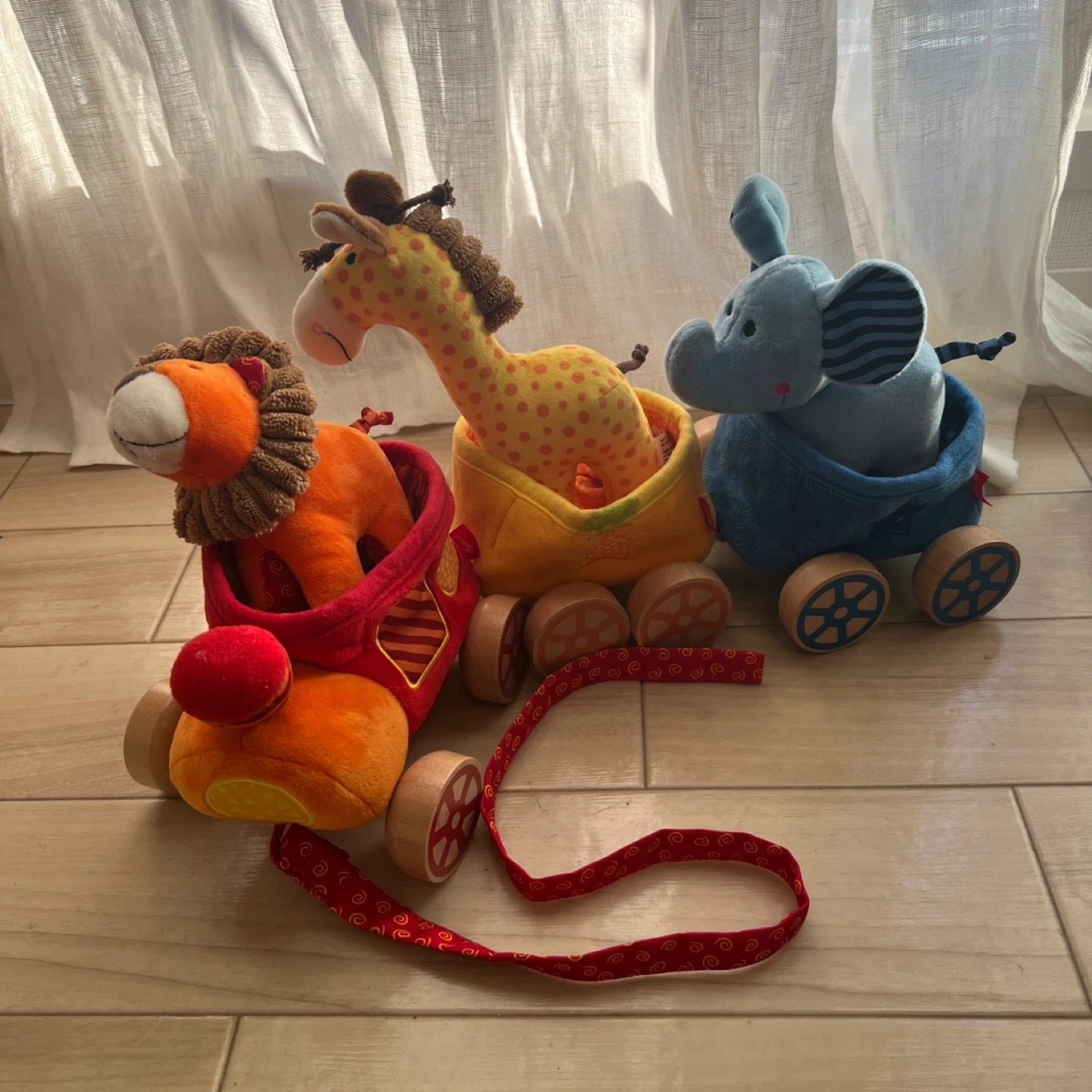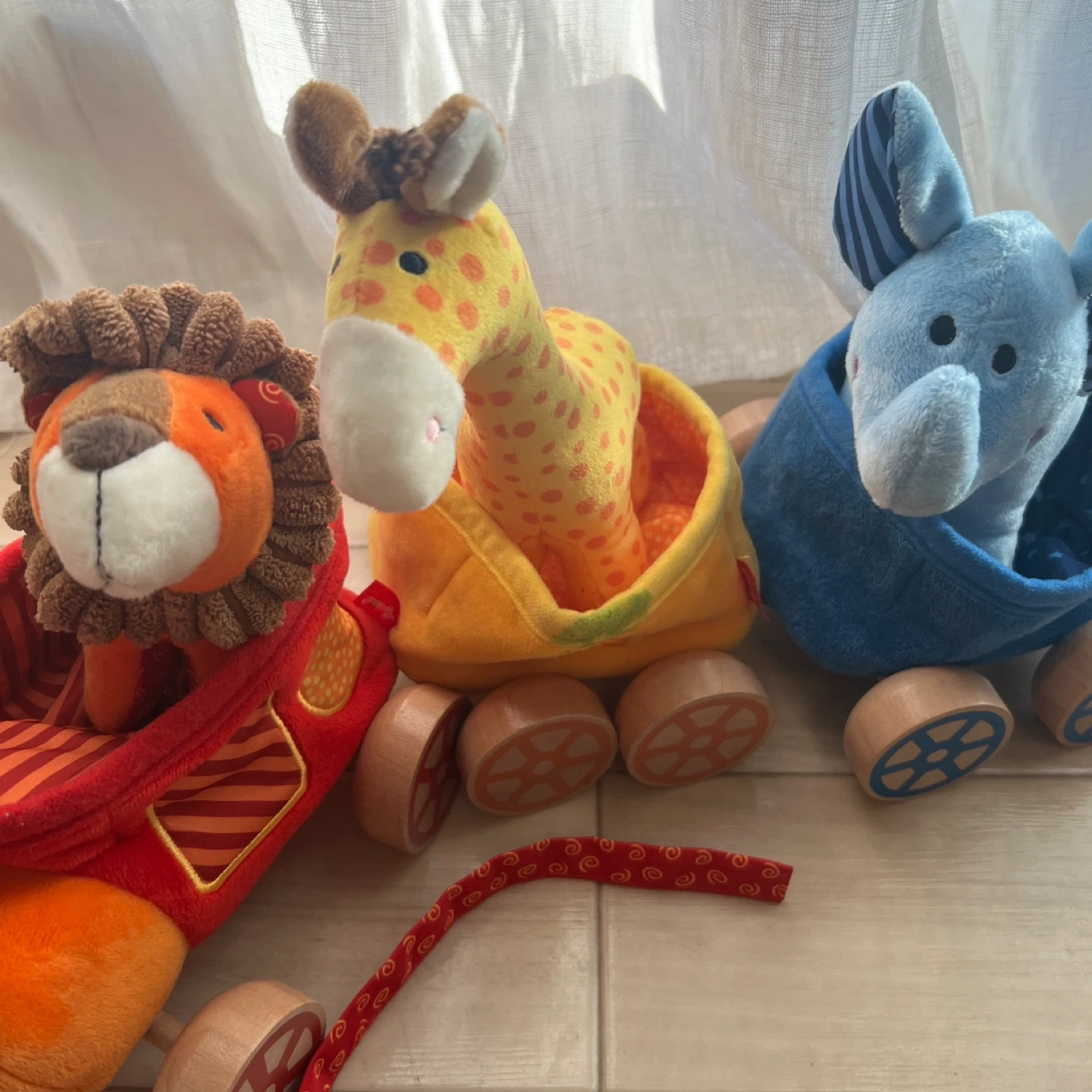 1箇所汚れがあります。写真をご確認ください。 ・ライオン、キリン、ゾウの3種類の動物 ・木製の車輪付き ・赤色の紐付き ・使用感あり 中古品であることをご了承ください。
