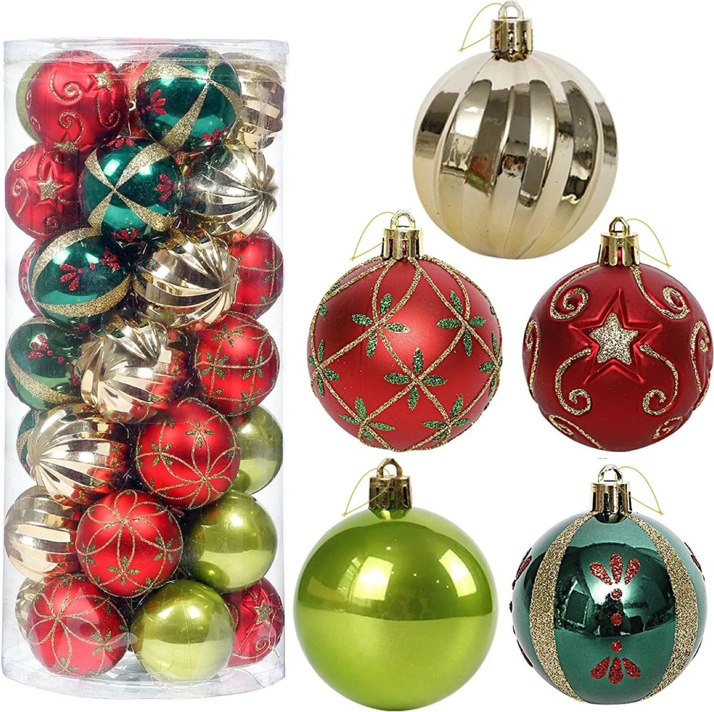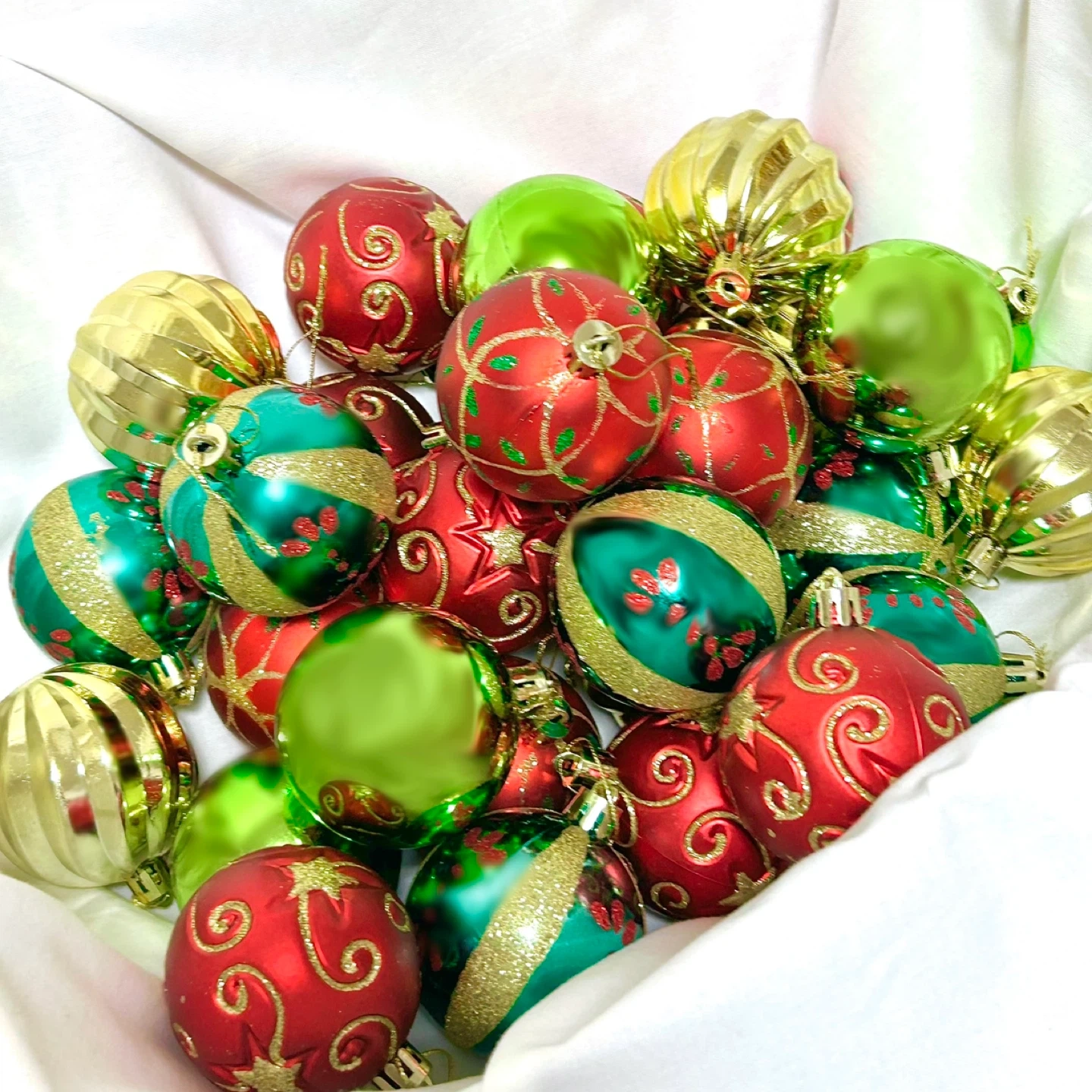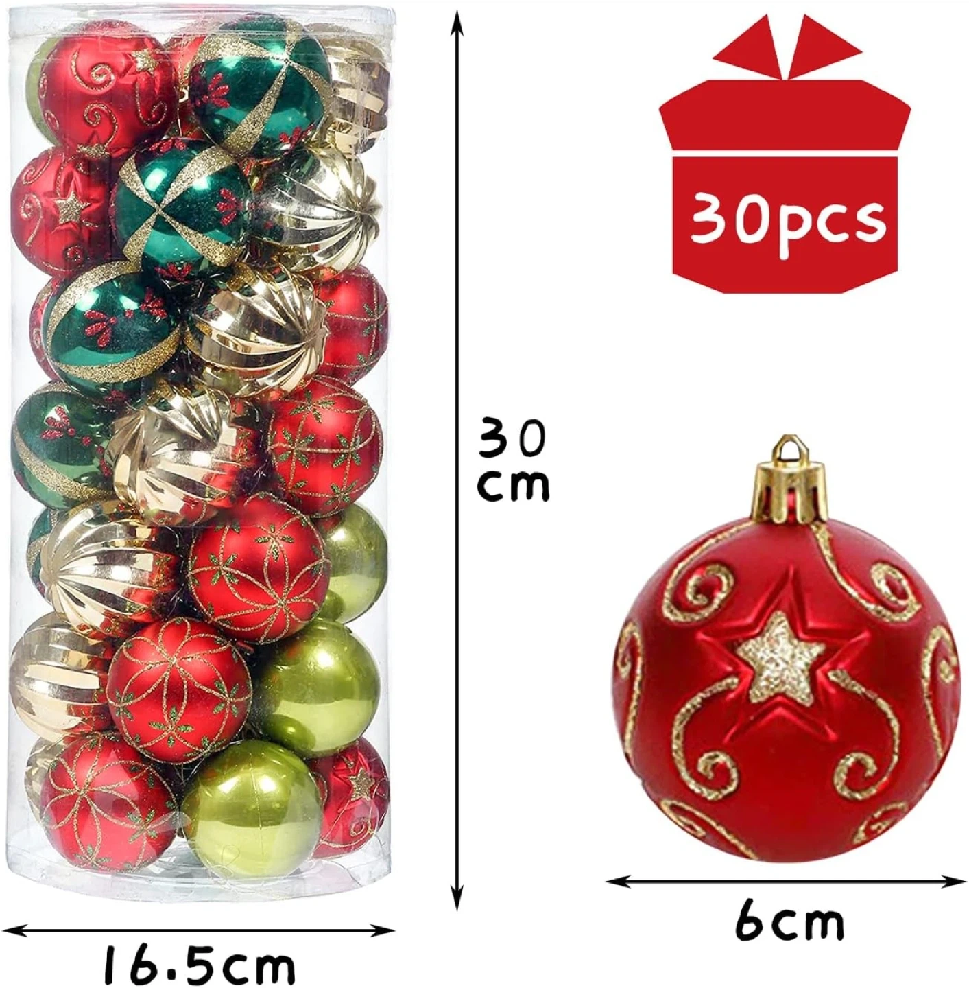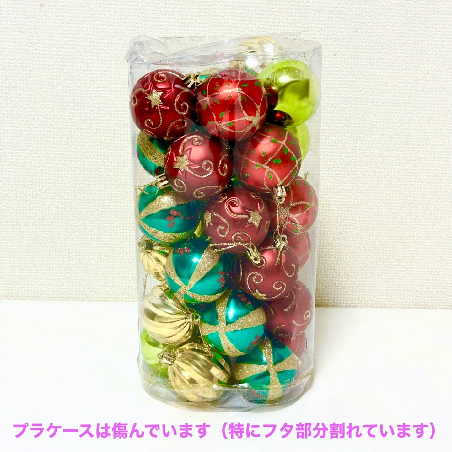 5カラーx6個ずつの30個セット、大きさは全部同じです。 単色と柄ありのボールがバランスよく入っています。 高さ120cmー150cmくらいのツリーにピッタリです。 1シーズン(短期間)使用しました。 ラメが結構落ちます。了承ください。 1個の大きさ直径約6cm、紐付き。 買った時のプラの箱に入れていますが、箱は蓋が割れていたり傷んでいます。 中身の状態は良いと思います。 購入時定価は1個¥1,980