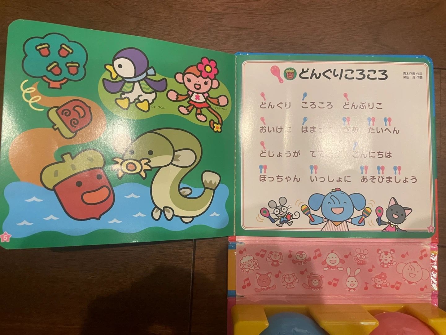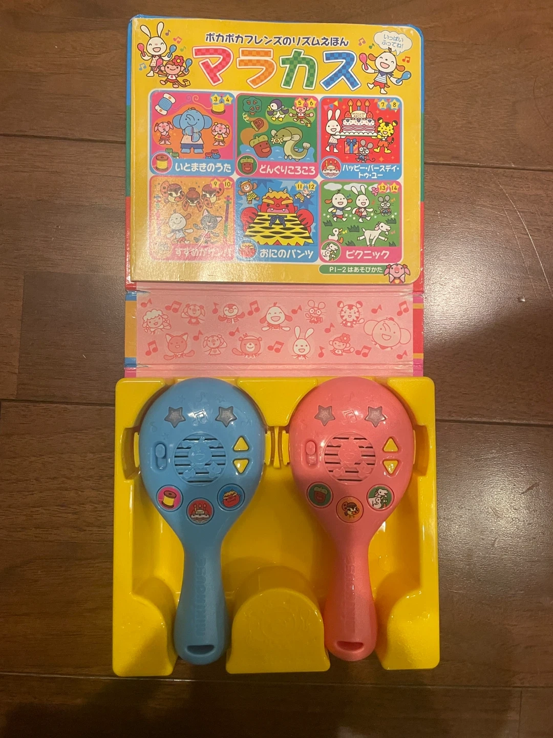 ミキハウスの人気商品のマラカスです。 メロディー6曲(いとまきのうた、どんぐりころころ、ハッピーバースディトゥーユー、すずめがサンバ、おにのパンツ、ピクニック) マラカスはシャカシャカの音とポロロンみたいな音がします。 動作確認済みですが、電池入ってません。 また背表紙に切れてる箇所があります(写真ご参照ください)。 中古品ご了承の上ご検討ください。 #マラカス #ポカポカフレンズ #リズム絵本 #知育玩具 #ミキハウス #mikihouse