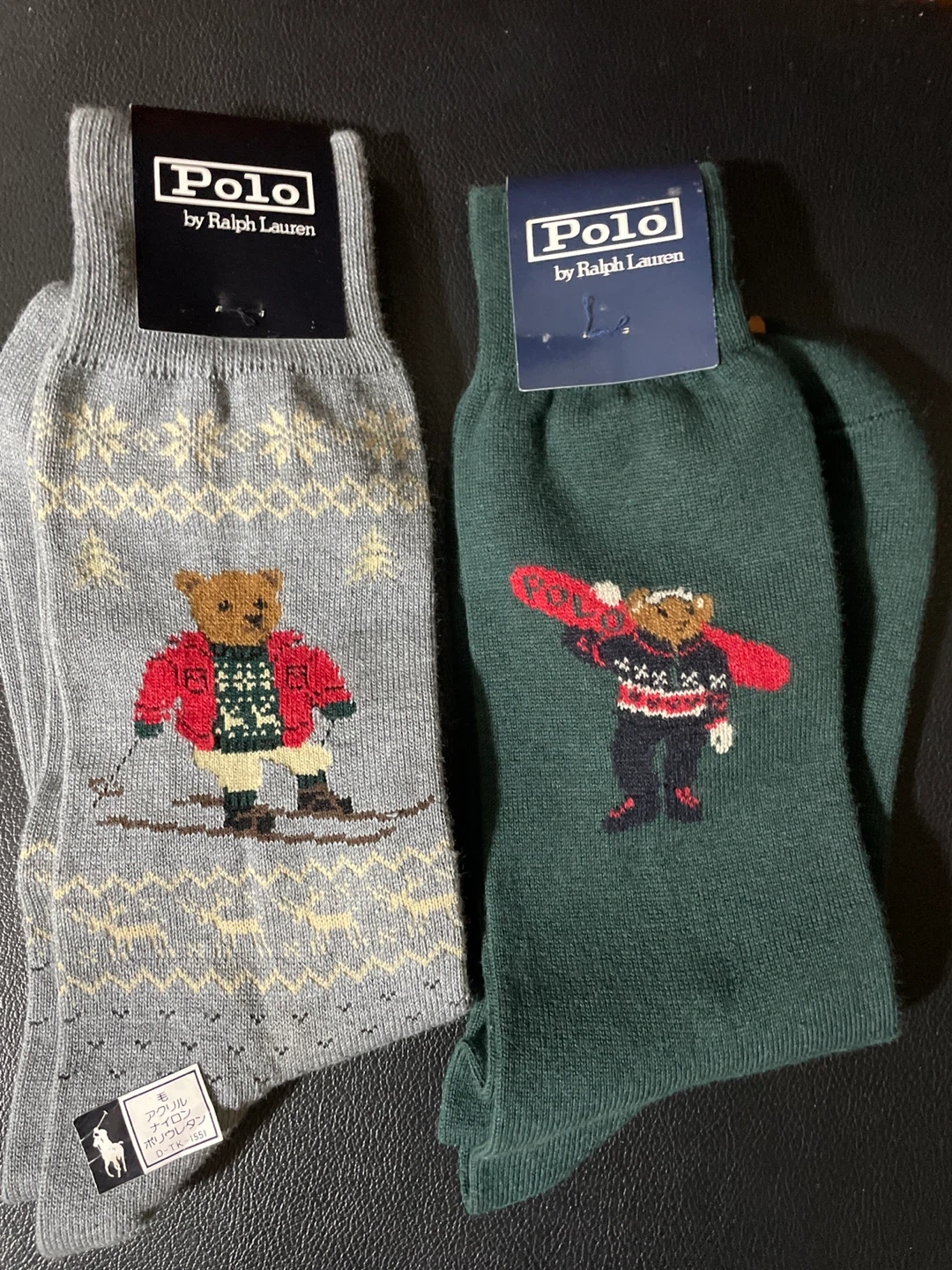 ポロラルフローレン メンズ靴下2足セット ・ブランド:ポロラルフローレン ・色:グレー、グリーン ・素材:毛、アクリル、ナイロン、ポリウレタン ・デザイン:スキーをするクマ   スノーボードをかついだクマ