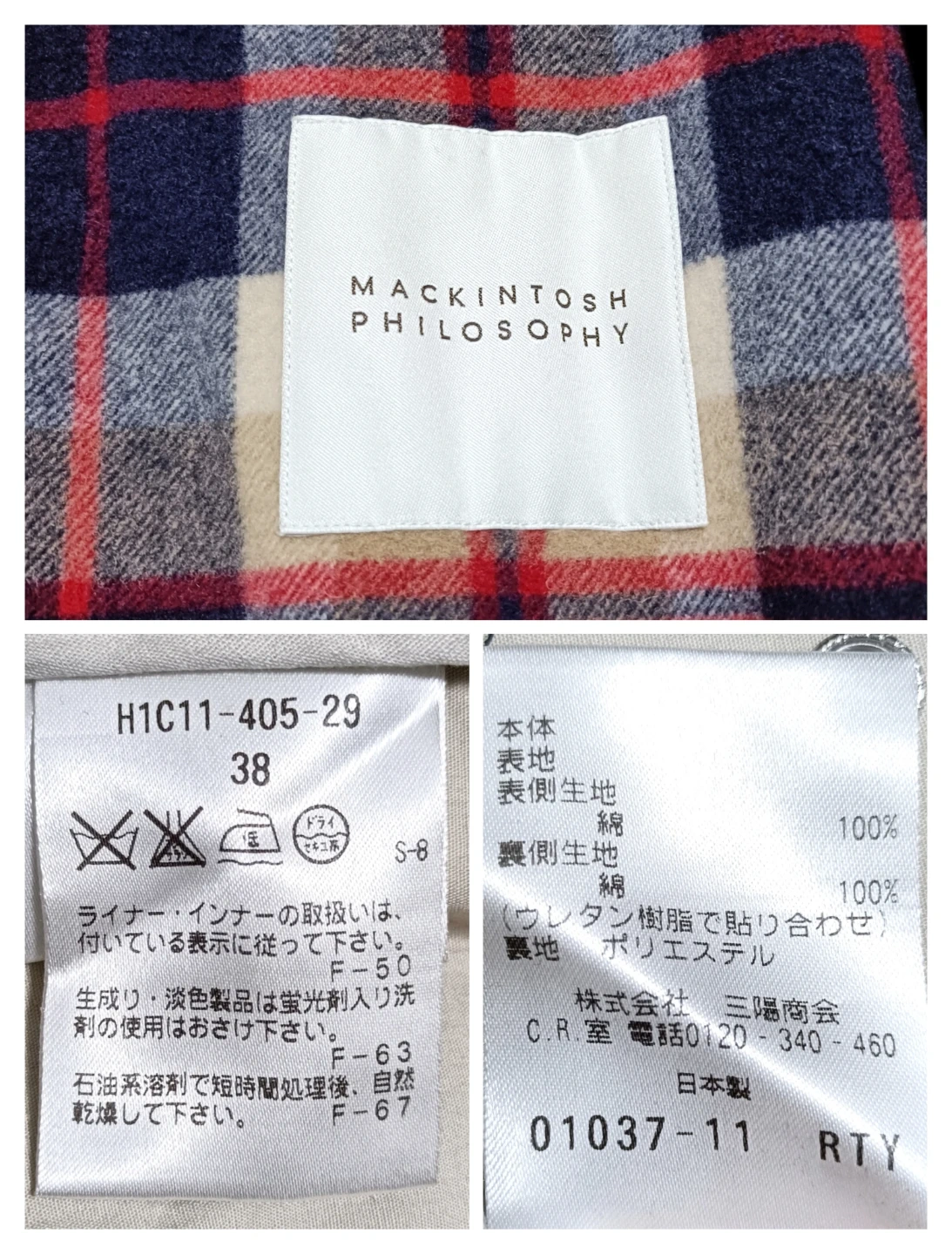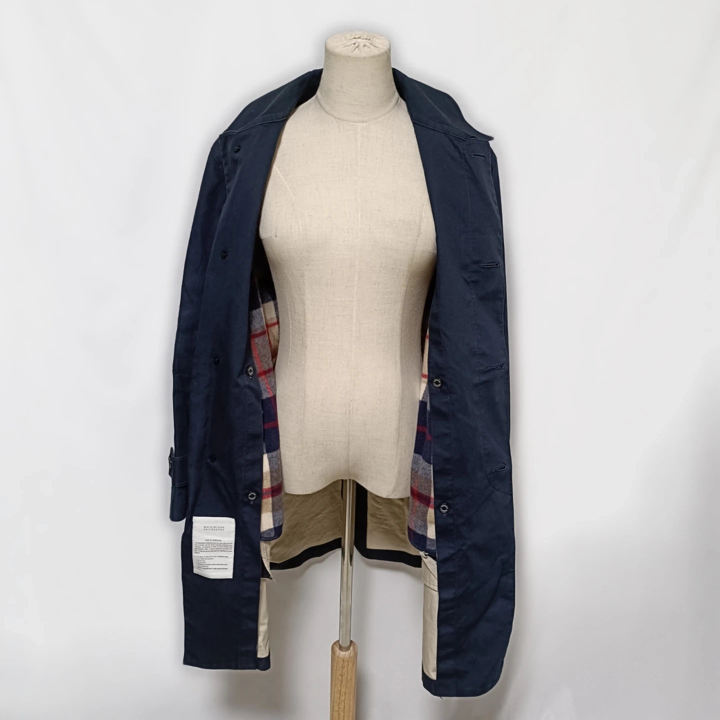ご覧いただきありがとうございます! マッキントッシュフィロソフィーの定番、ネイビーのステンカラーコートです。 取り外し可能なチェック柄ライナーが付いているため、肌寒い秋や春先から真冬まで、3シーズン着用いただけます。 ビジネスシーンはもちろん、普段のきれいめカジュアルにも合わせやすい万能なデザインです。 □商品名□ マッキントッシュフィロソフィー ステンカラーコート 38 ネイビー ライナー付 □ブランド□ MACKINTOSH PHILOSOPHY マッキントッシュフィロソフィー □表記サイズ□ 38 (メンズMサイズ相当) □実寸サイズ(cm) □ 着丈:90 肩幅:45 身幅:52 袖丈:60 ※実寸につきまして多少の誤差はご了承ください。 ※表記サイズだけではなく実寸のサイズをご確認ください。 □カラー□ ネイビー (紺) □素材□ 本体(表地、裏側生地): 綿 100% □コンディション□ 使用感はありますが、目立った汚れやダメージなど特にございません。 ※汚れはできる限り写真にて掲載しております。まずは画像をご確認ください。 どうぞよろしくお願い致します。 □商品管理番号□ T9-P-5570