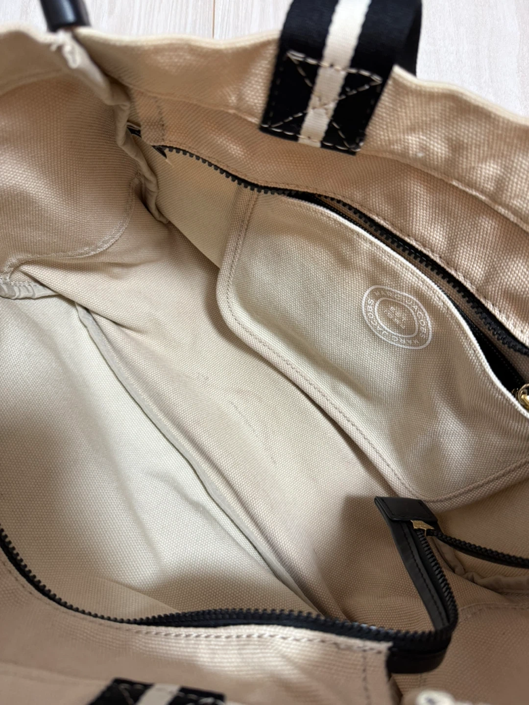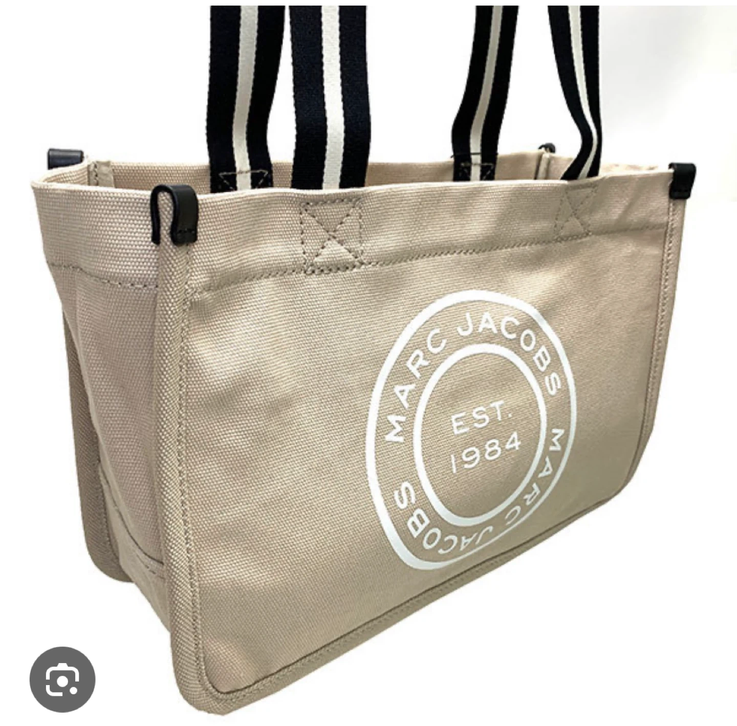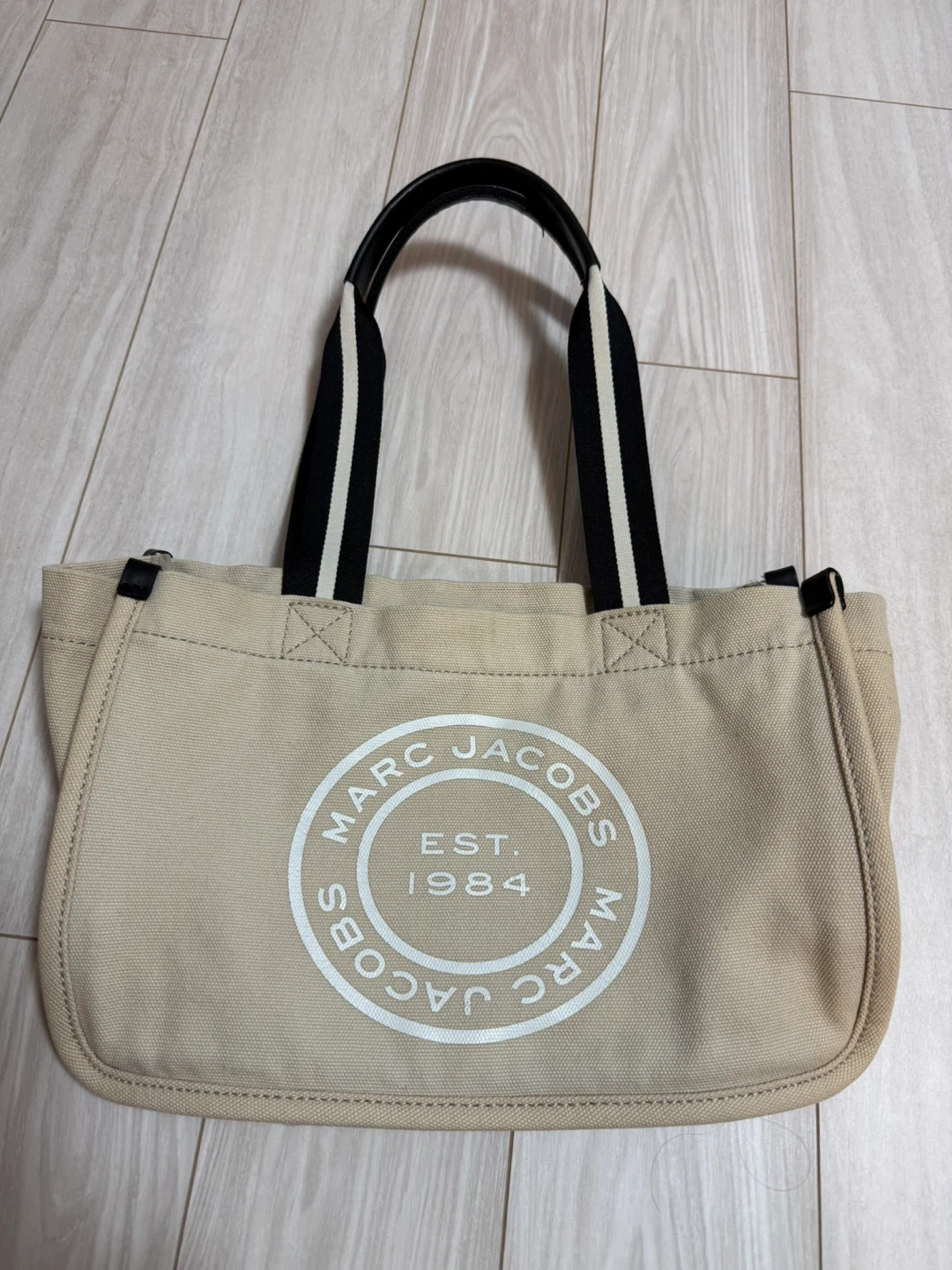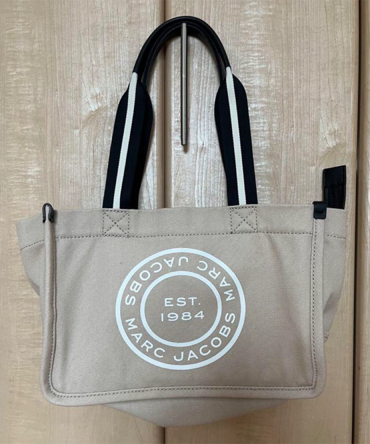 マークジェイコブスのトートバッグです ・カラー:アイボリー ・持ち手:黒と白のストライプ ・ロゴ:MARC JACOBS EST. 1984 ・内ポケットあり ・使用感あり 3枚目のお写真の様に底にシミがあります ご了承下さい