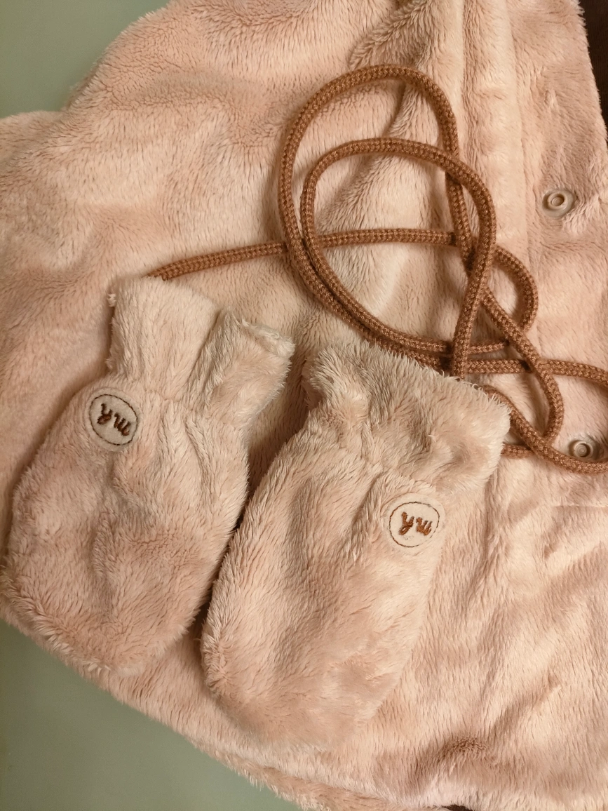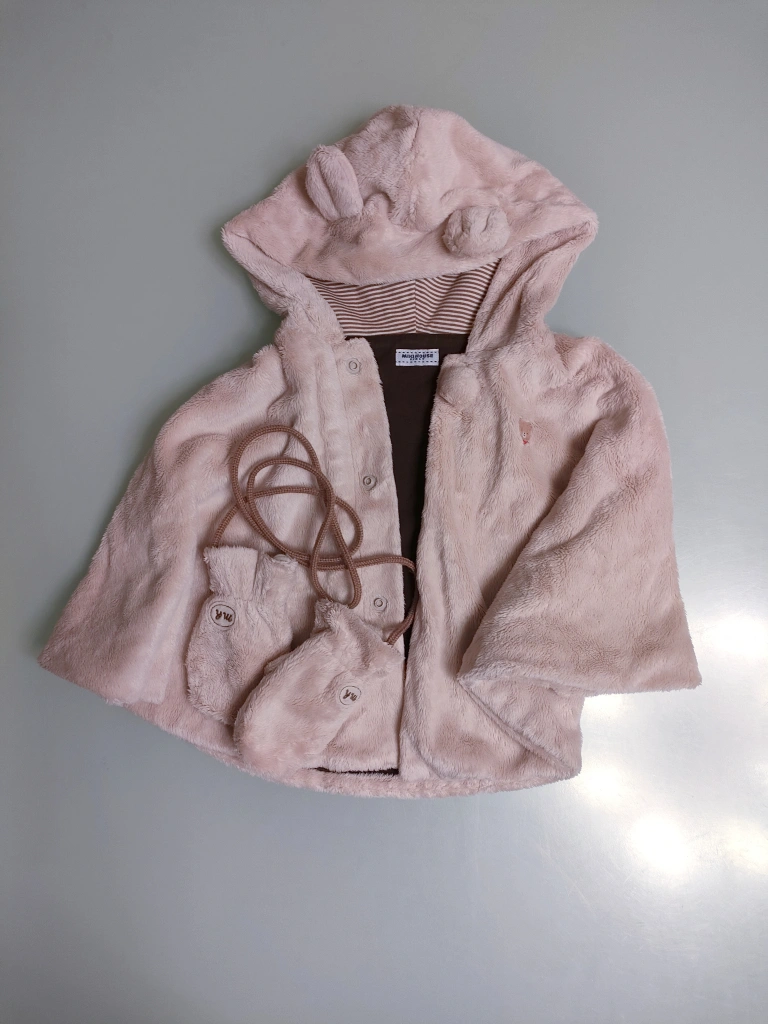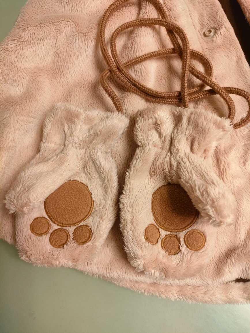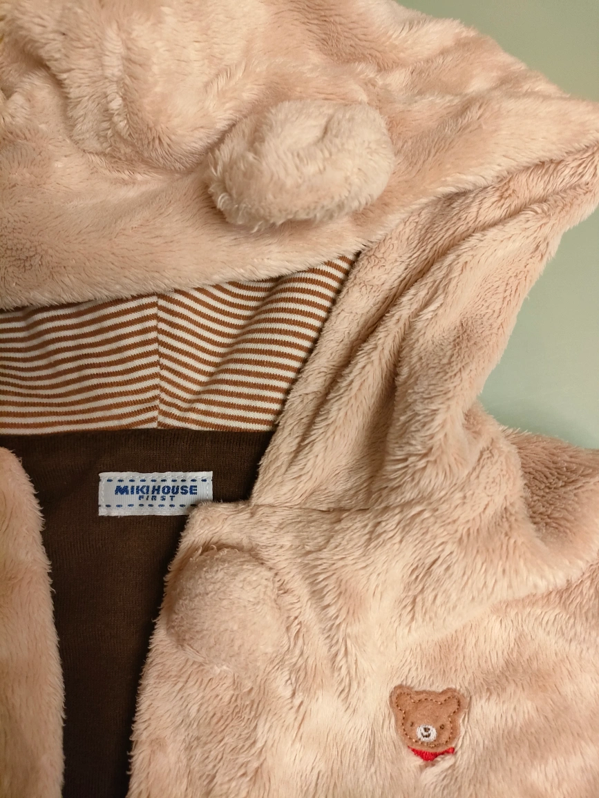 ・ブランド:ミキハウス ・ベビー用ポンチョ ・カラー:ベージュ ・サイズ:フリー(70~90) ・フードに耳付き ・手袋付き(紐で繋がれています) ・胸元にクマの刺繍