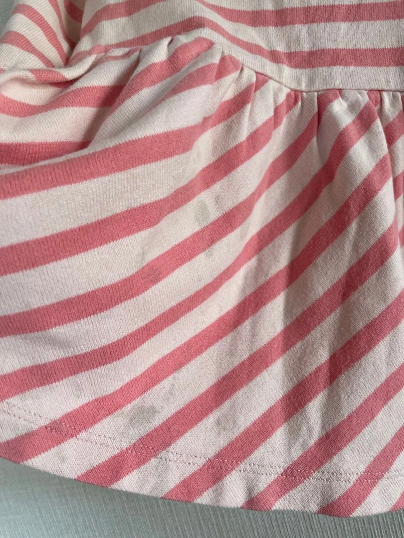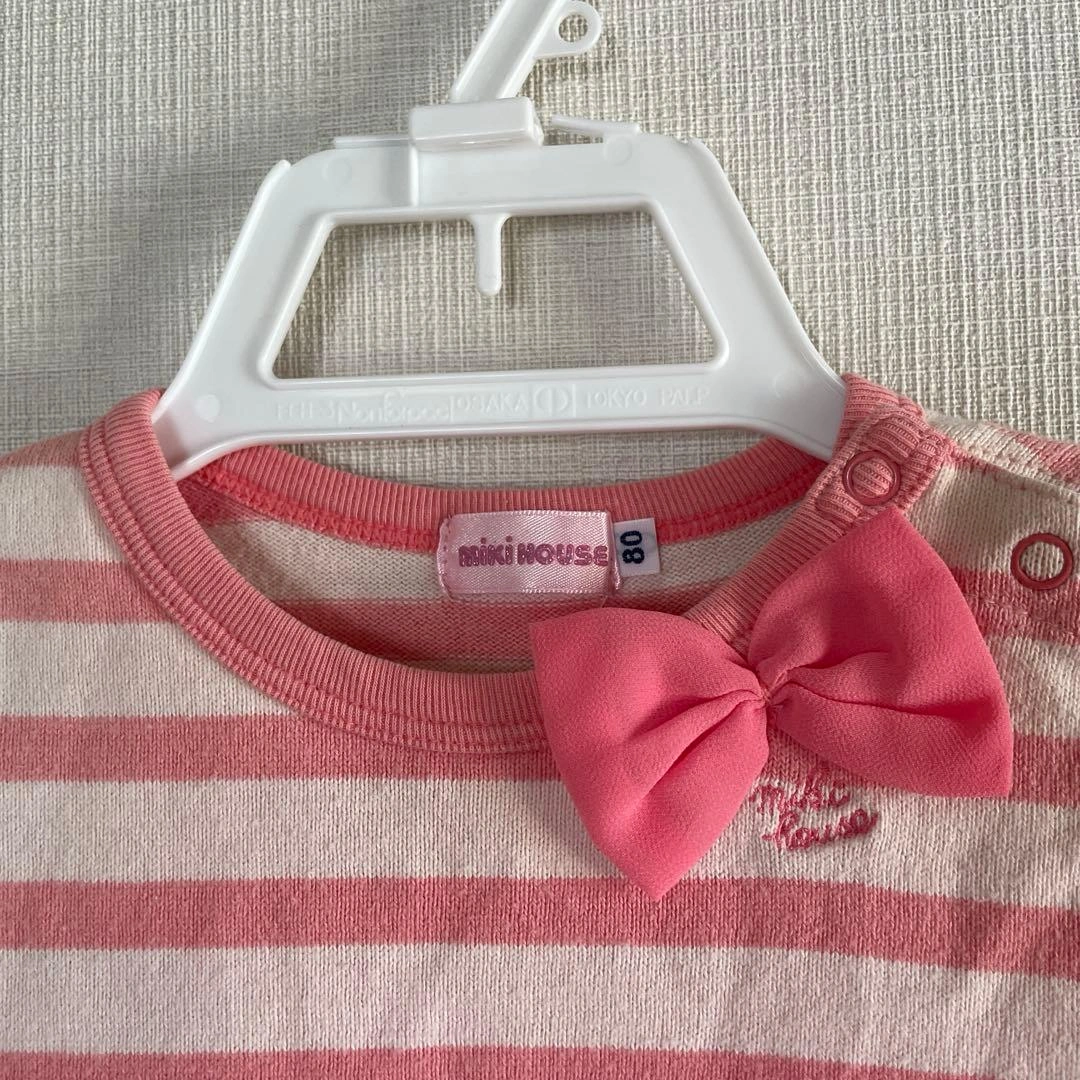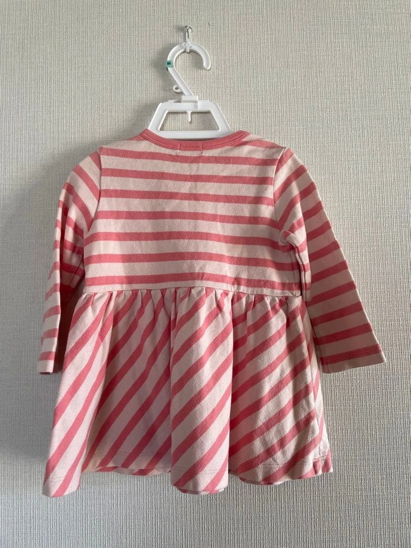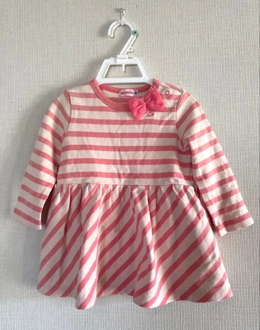 ミキハウスのピンクと白のストライプ、リボン付きの長袖ワンピースです。 ウェストの位置が高めでスタイルがよく見えるのと、明るいピンク色のため表情が明るくなると言われました。 よく見ると前側のスカート部分に薄いしみがあります(写真4枚目参照)が、ストライプ模様になっているのとギャザーがあるため着用時はほとんど目立ちません。まだまだ着て頂けると思います。 子供が着ていた中古品であることをご理解・ご了承ください。 - 色: ピンクと白のストライプ - デザイン: 長袖、フレアスカート、リボン付き - サイズ: 80 ご質問などありましたらコメントくださいませ。