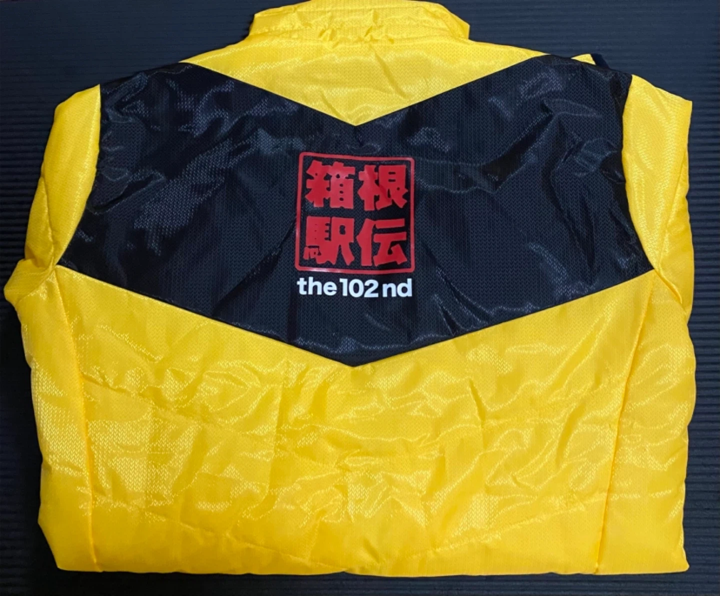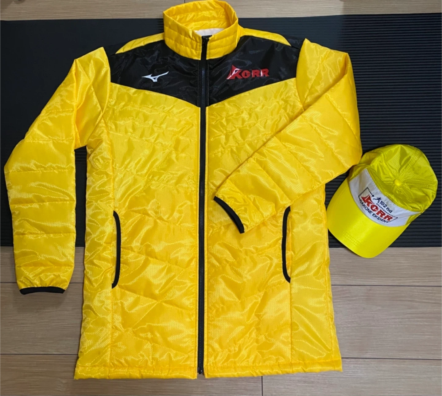 ミズノのベンチコートとキャップのセットです。 ・ブランド:ミズノ ・カラー:イエロー、ブラック ・サイズ:XL ・デザイン:102nd 箱根駅伝 ・状態:使用頻度は数時間です 身長170cmですが、太ももぐらいまできます。 あと帽子は後ろ調整できます。