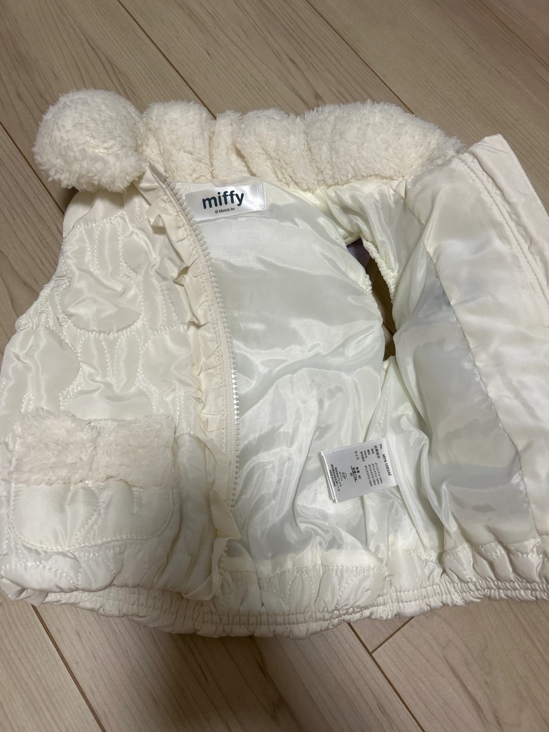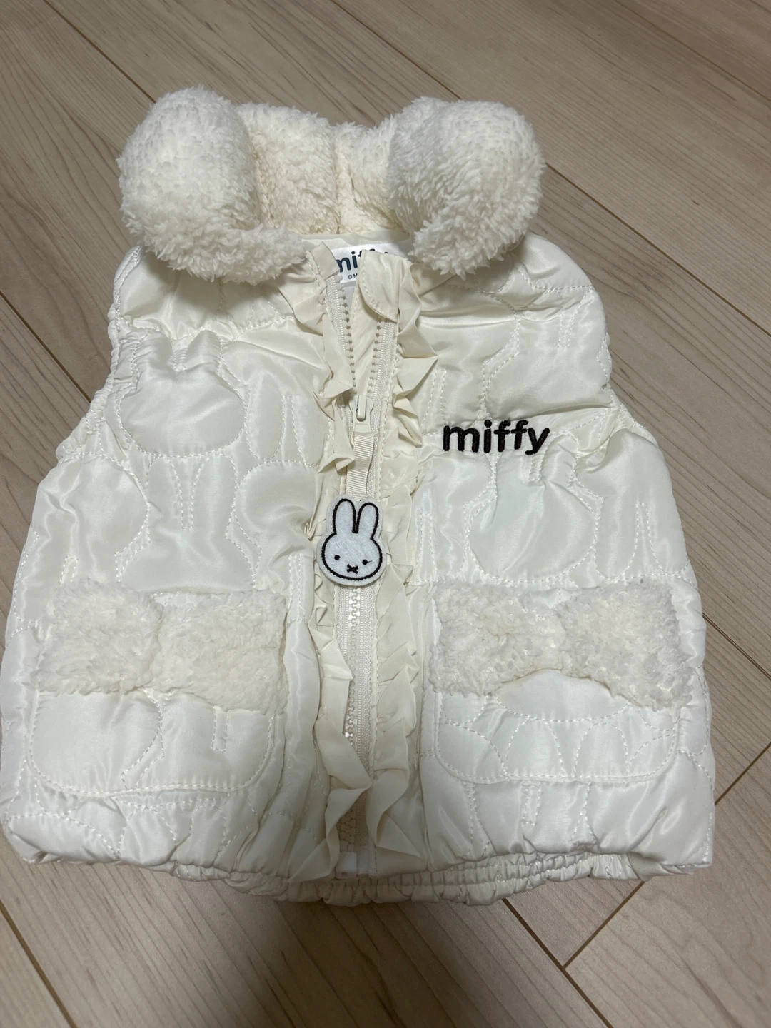 ミッフィーのベビーベストです。 もこもこは襟とポケット部分のみ、ジッパー部分にはフリルがついています。 昨年冬の頂き物、未使用です。 定価3200円
