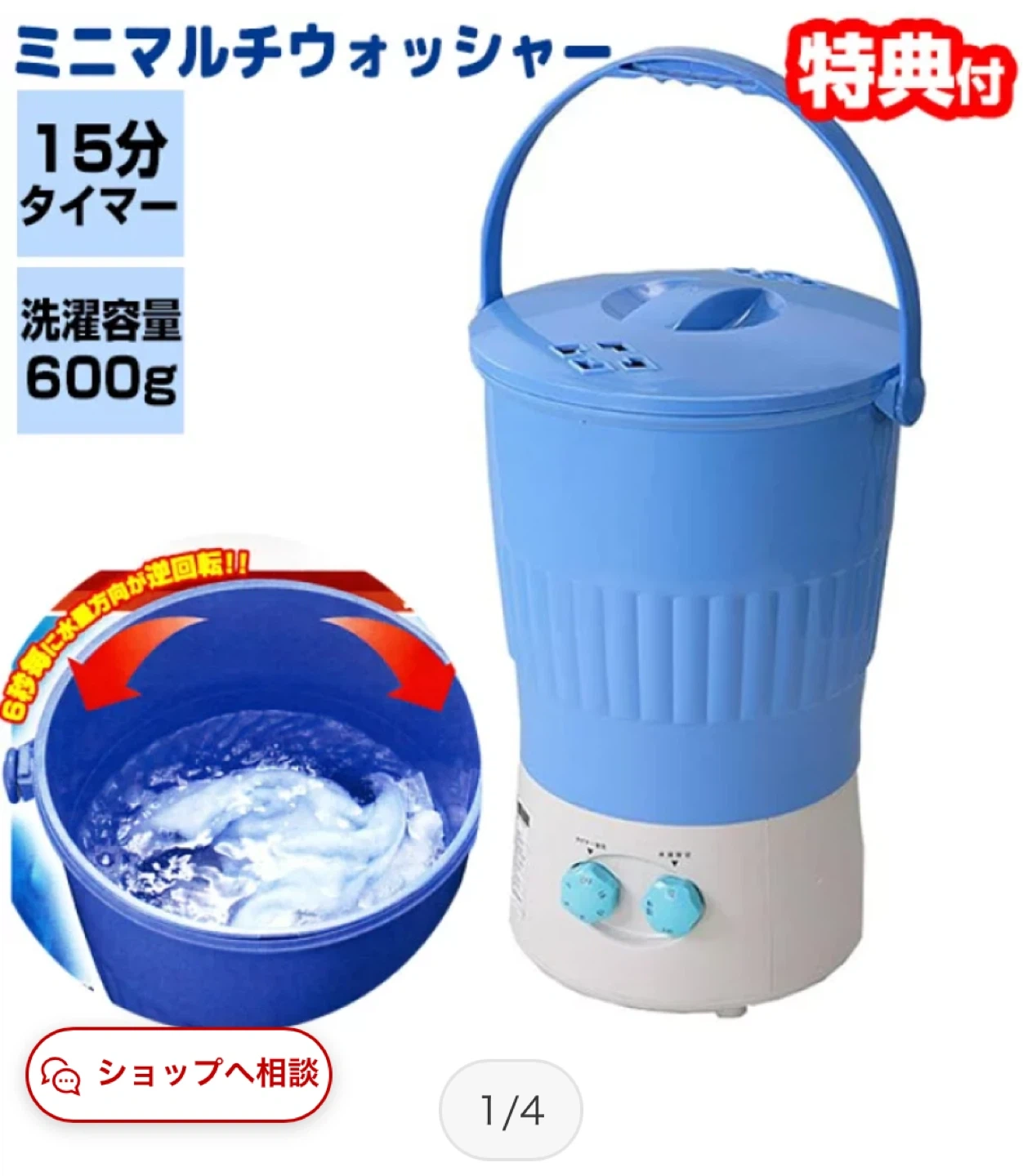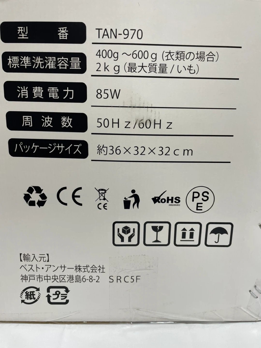 ミニマルチウォッシャー 小型洗濯機です。 【情報】 型番:TAN-970 標準洗濯容量:400g~600g(衣類の場合)、2kg(最大質量/いも) 消費電力:85W 周波数:50Hz/60Hz パッケージサイズ:約36×32×32cm 【状態】 未使用品 【付属品】 取扱説明書、箱 しばらく自宅で保管しておりました 出品にあたり開封しました