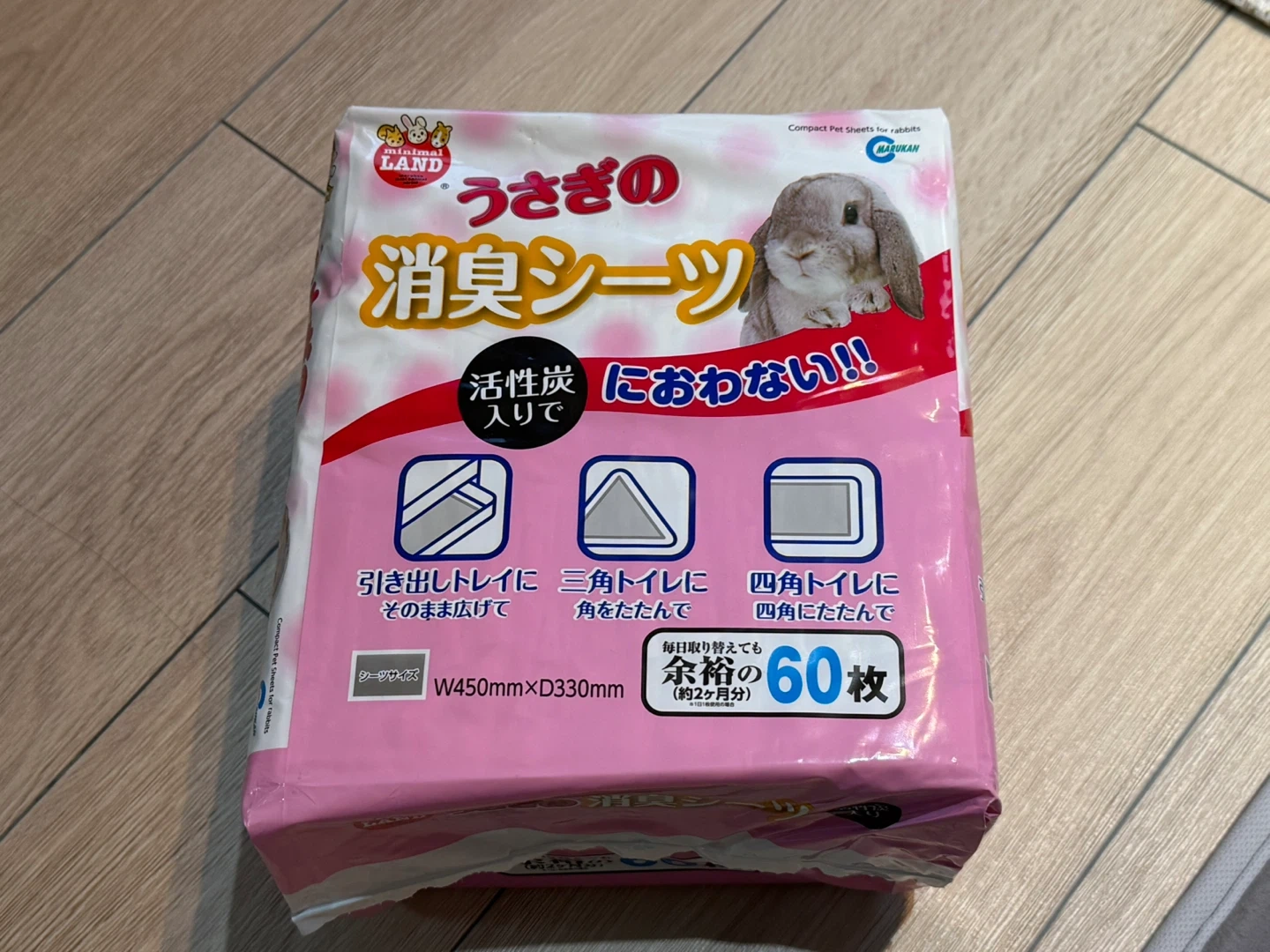 うさぎ用消臭シーツ60枚です。 ・ブランド:ミニマルランド ・サイズ:W450mm×D330mm ・60枚入り 他にも15枚ほどありましたのでお付けします。 普通に買うよりお得かと思います。