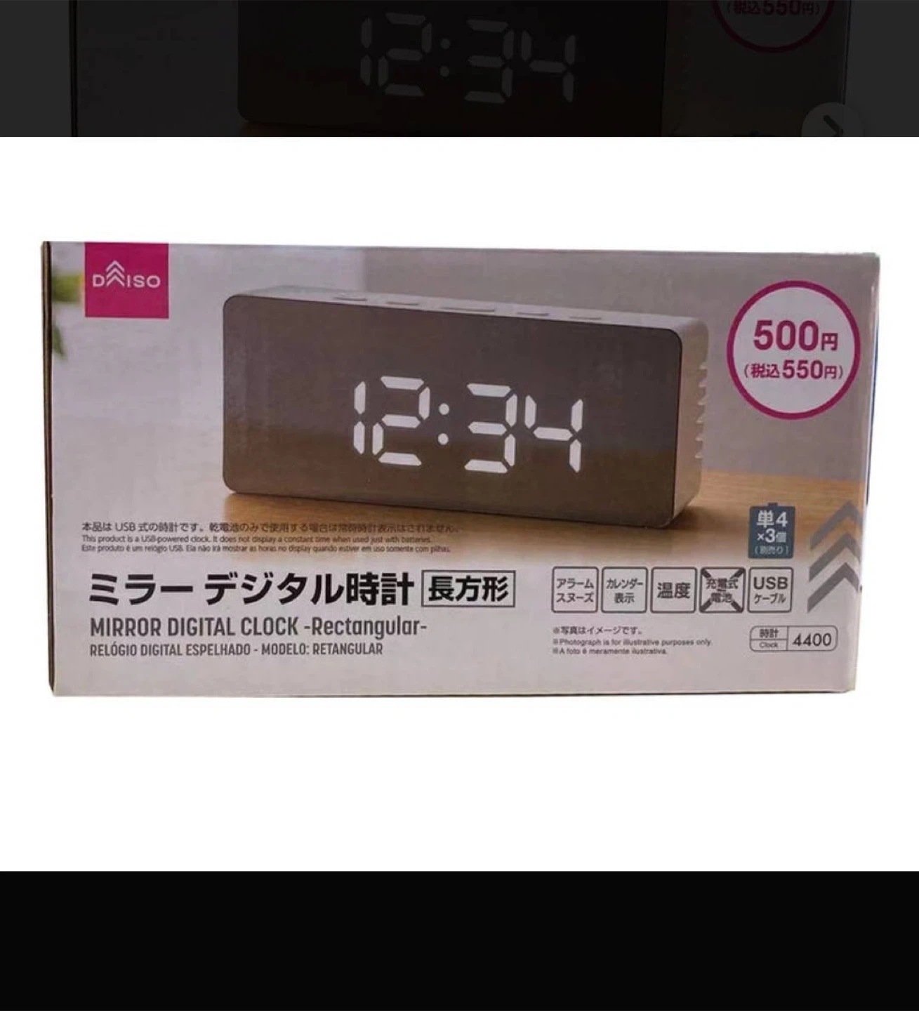あたたかさダイソー ミラーデジタル時計 使用済み 箱説明書無し USBケーブル両端被覆ズレて中のコード見えてます 写真最後参照 ミラー面保護フィルム剥がしてません アラーム、スヌーズ、温度計付いてます 動作確認済み 単4電池3本使用 電池はバックアップ用です 電池無いとUSB電源ケーブル外すと最初からか時間等セットし直さないといけません 説明書無しでの時間合わせ手こずりました ユーチューブで使い方、詳しくやってます ダイソーで即完売入手困難品 息子依頼