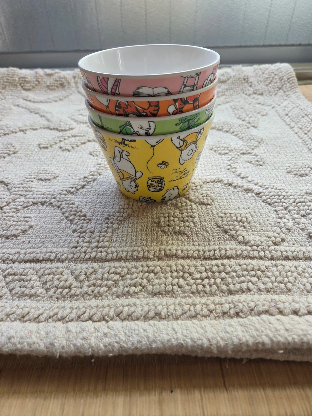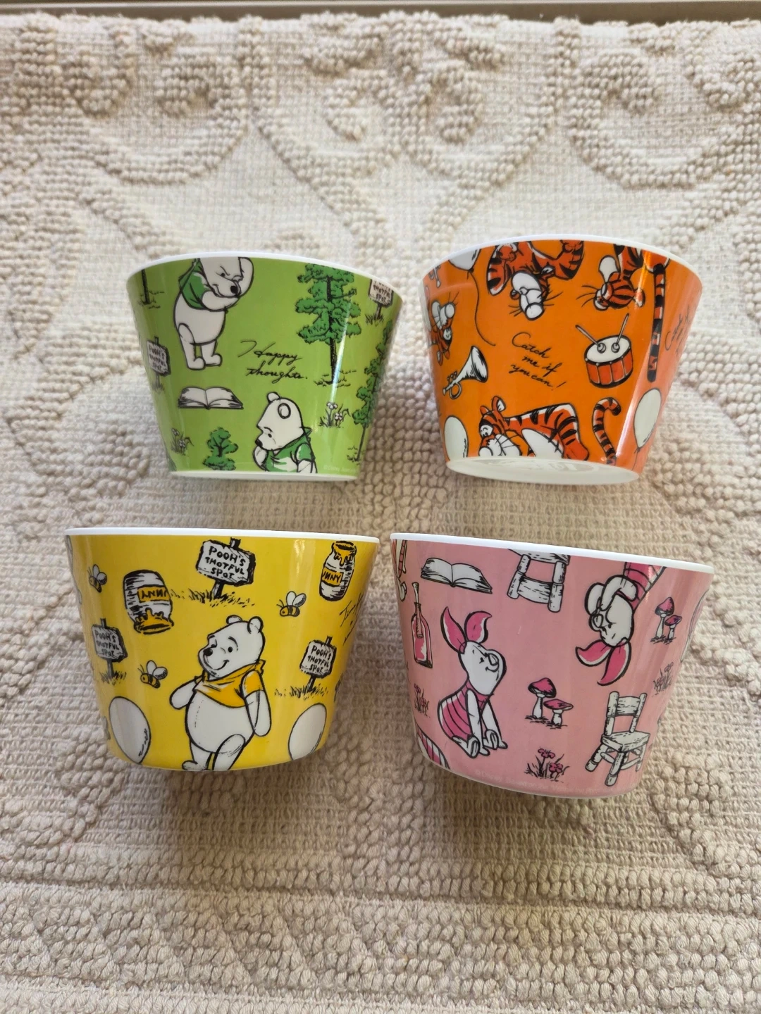 ディズニー ストアの食器4個セットです。 ・4色セット 緑・黄……プーさん ピンク……ピグレット オレンジ……ティガー 4個中2個は、数回使用した事があります。 ※中古品であることご了承ください。 仕事をしている為、 平日は18時以降 土日はご相談させて下さい。
