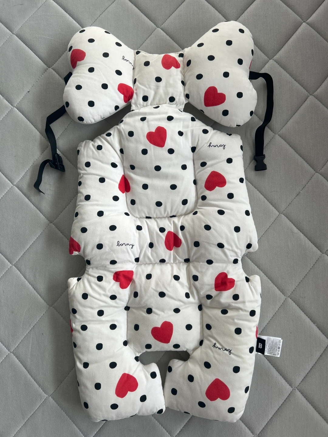 メラビーのベビーカーシートです 一目惚れして、ネットで探し回りました。 【情報】 ブランド:メラビー 柄:ドット、ハート柄 サイズ:約34cm×70cm 素材:綿100%、ポリエステル100% 【状態】 使用感少なめ、全体的にきれい 中古品であることご了承ください