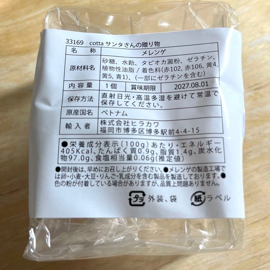 購入時期は今年11月。 クリスマスケーキにデコレーション用でいかがでしょうか? 賞味期限: 2027.08.01 cotta メレンゲ サンタさんの贈り物 コーティング cotta コッタ 一個当たり 65xH50mm ご希望の方はお気軽にご連絡ください。