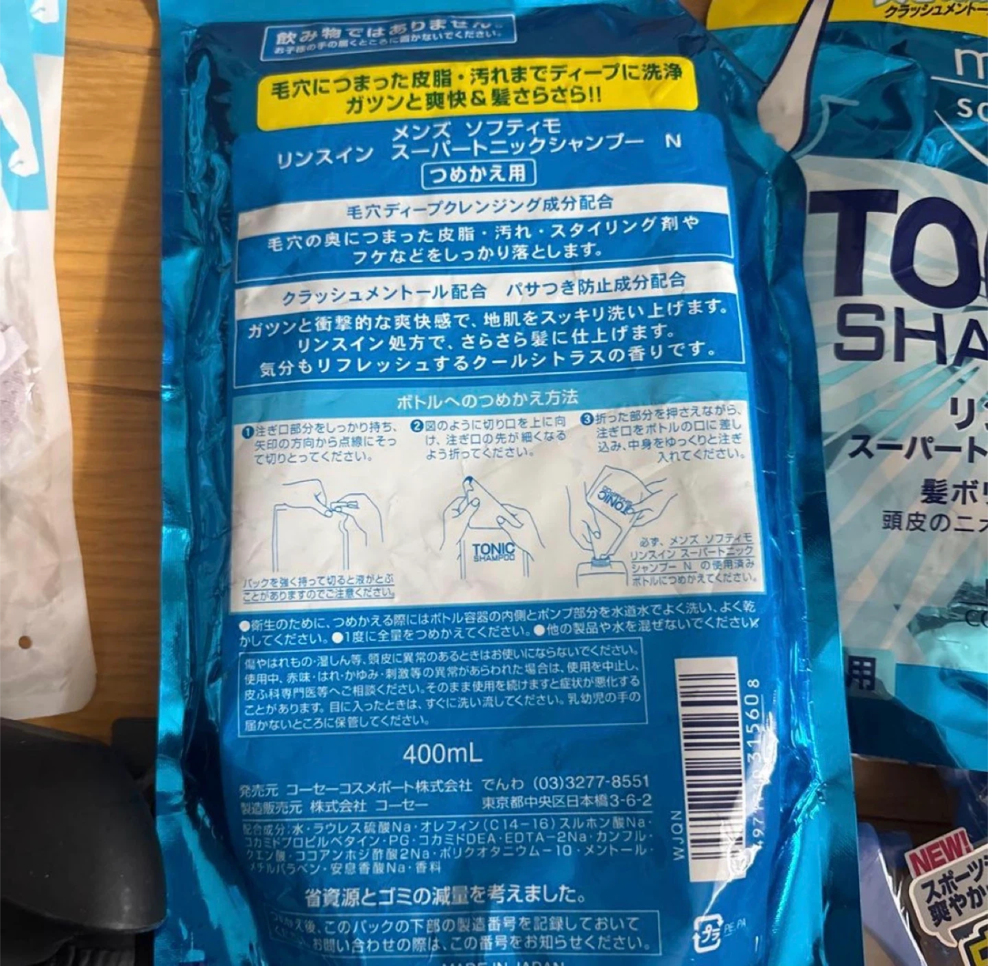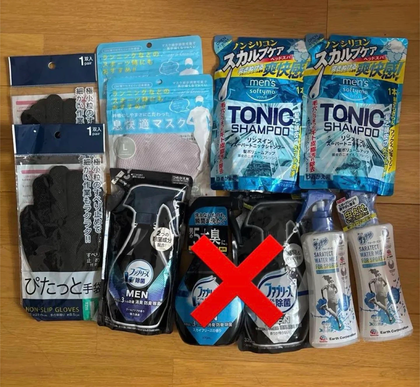 ・ファブリーズ MEN 本体 1本 ・サラテクト ウォーターミスト FOR SPORTS 200ml 2本 ・メンズ ソフティモ トニックシャンプー 詰め替え 2点 ・息快適マスク Lサイズ グレー、ブラック 各1個 ・極小粒すべり止め付き軍手 1双入 2個