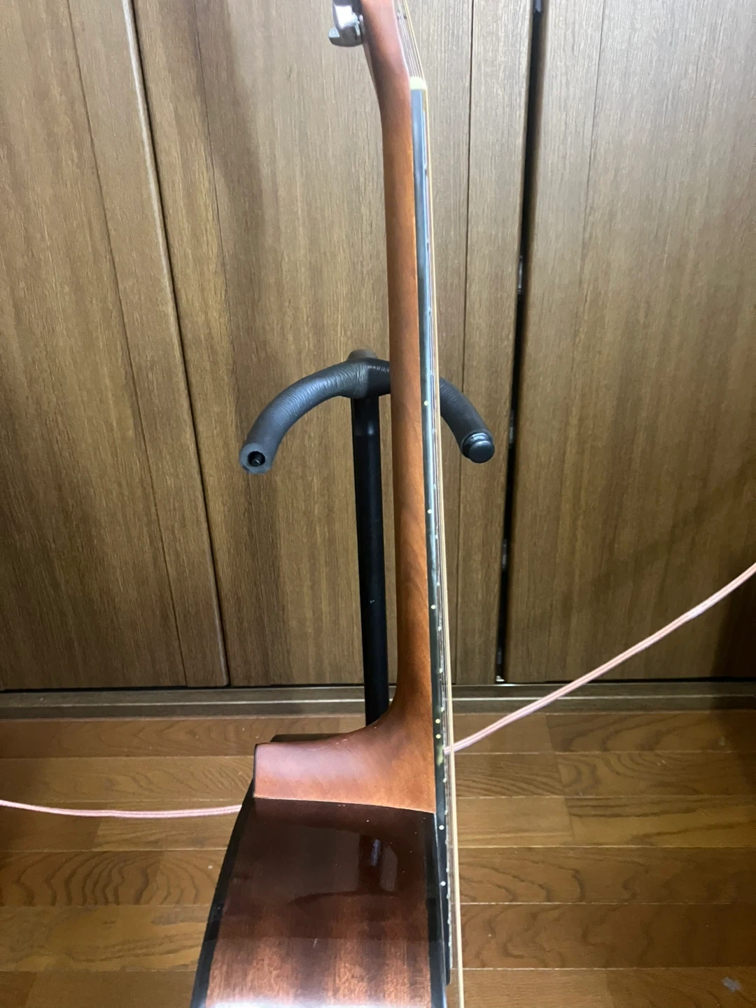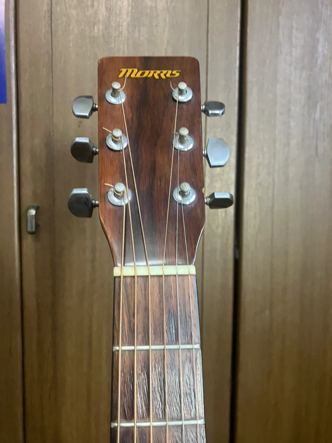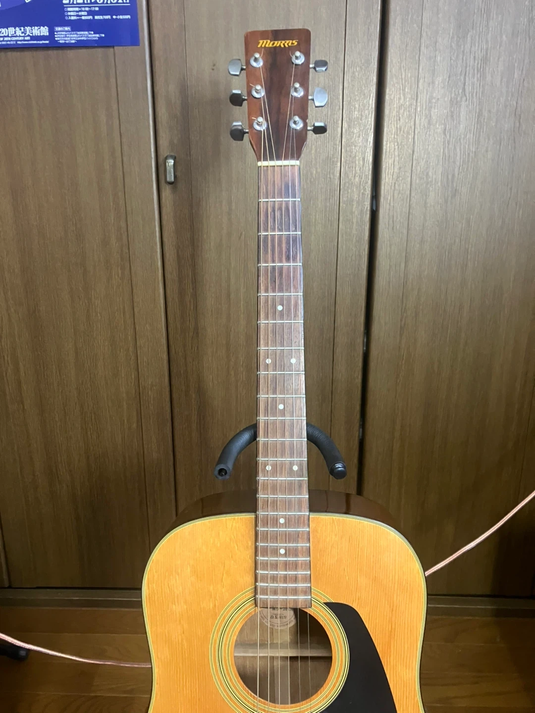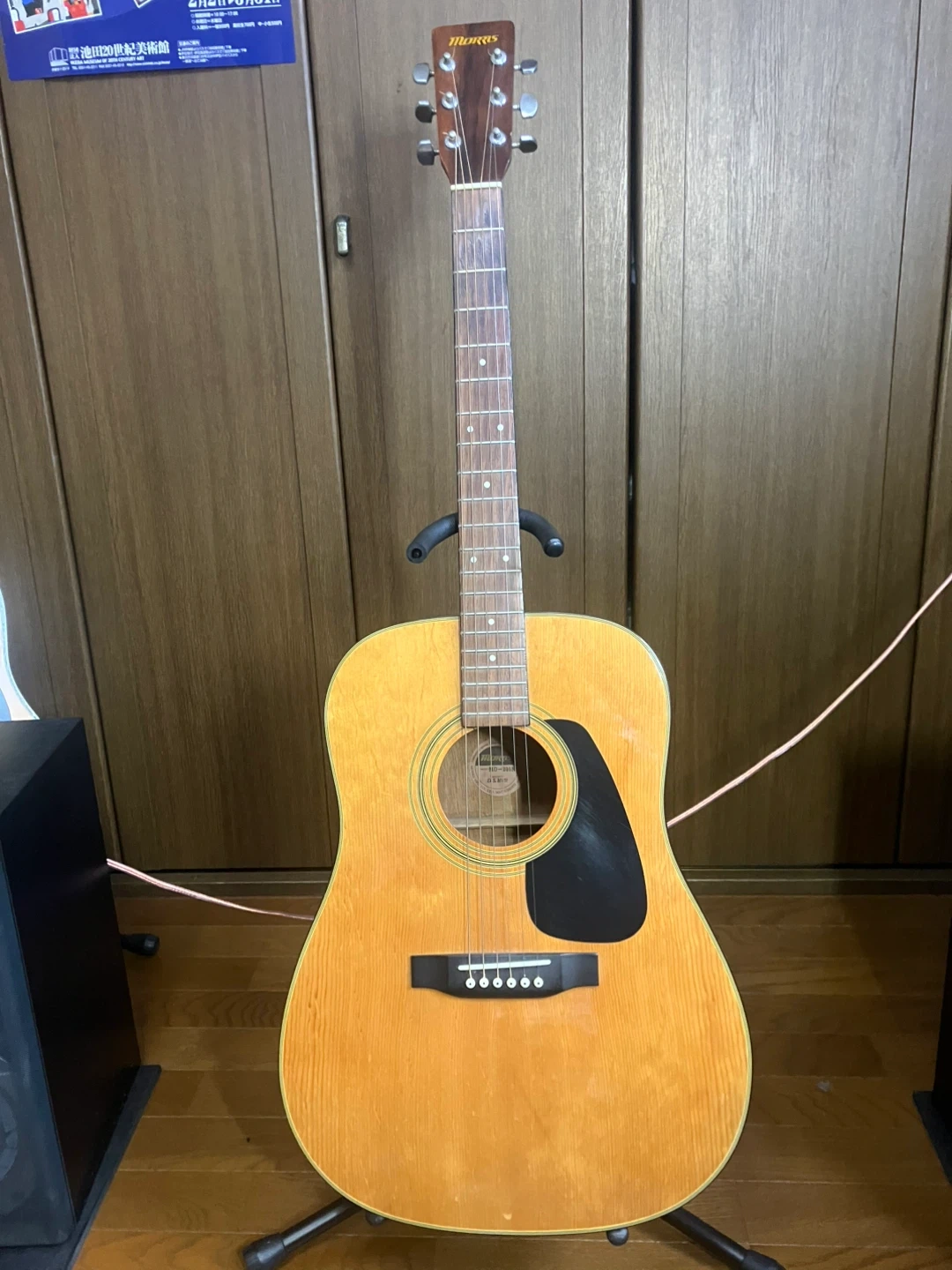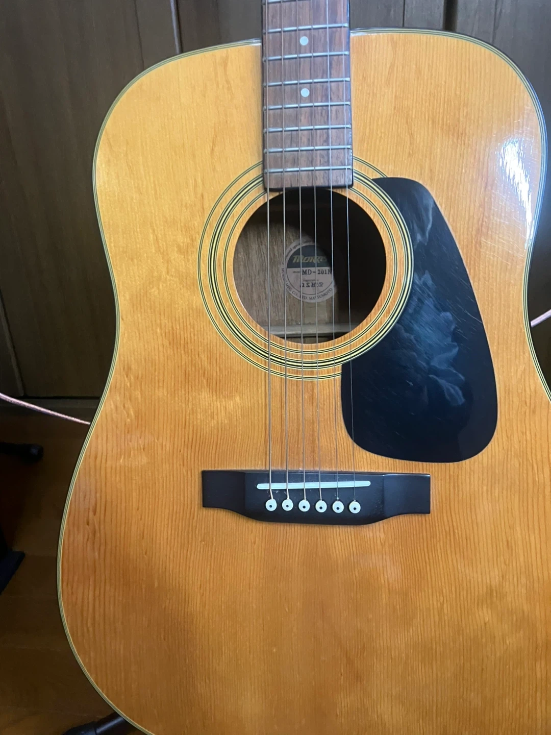 モーリス アコースティックギター MD-201N 【情報】 ブランド:モーリス 型番:MD-201N 数あるギター 工房の中からご覧いただきましてありがとうございます。 ラルクアコースティックギター工房と申します。 このギターはドレッドノートスタイルで約50年前に製造されたヴィンテージギターです。 ボディーはスプルース合板でサイドとバックはマホガニーの合板です。 指板はローズウッドでペグはカバータイプのクロームメッキです。 木材がよく乾燥し澄んだよく鳴るギターに仕上がっています。 弾き易さの目安となるナットの幅が41mmで、6 弦12フレットの弦高が3mmと初心者の方にも大変引きやすいコンディションに仕上がっています。 ボディーを始め、指板など各素材に応じたクリーナーやワックスで清掃し、特に指板はオレンジオイルで丁寧に脂質を拭き取ってありますので、初めから気持ちよくお使いいただけると思います。 お引き渡しの直前に、マーチンのエクストラライトゲージ(新品)に交換してお渡しいたします。 自宅近辺まで取りに来てくださる方限定でお願いいたします。 ご希望であれば中古ですが、ギグバックを1000円にてご提供いたします。 事前にご連絡をいただければ、曜日を問わず、11時から18時の間お引き渡しができます。