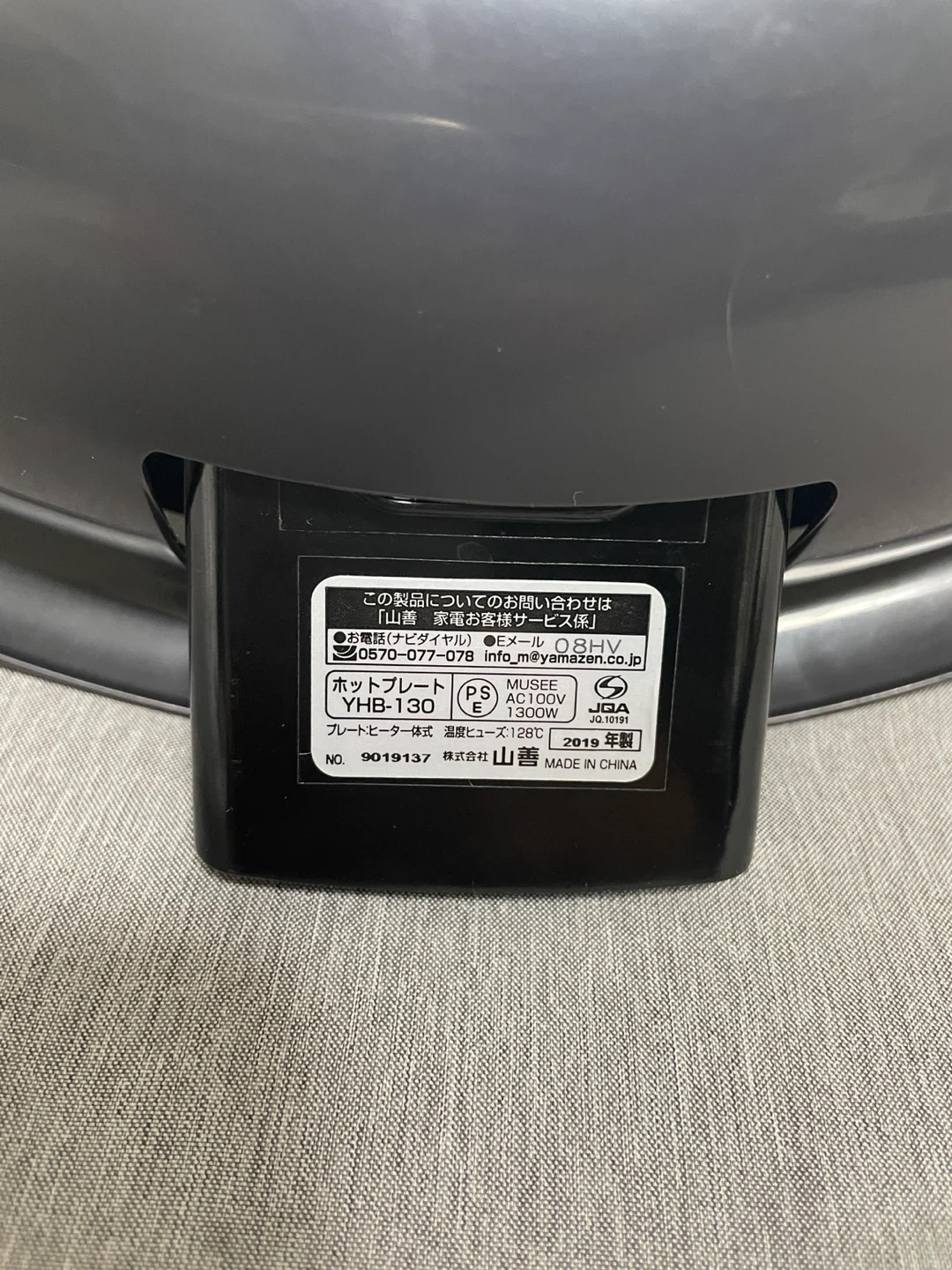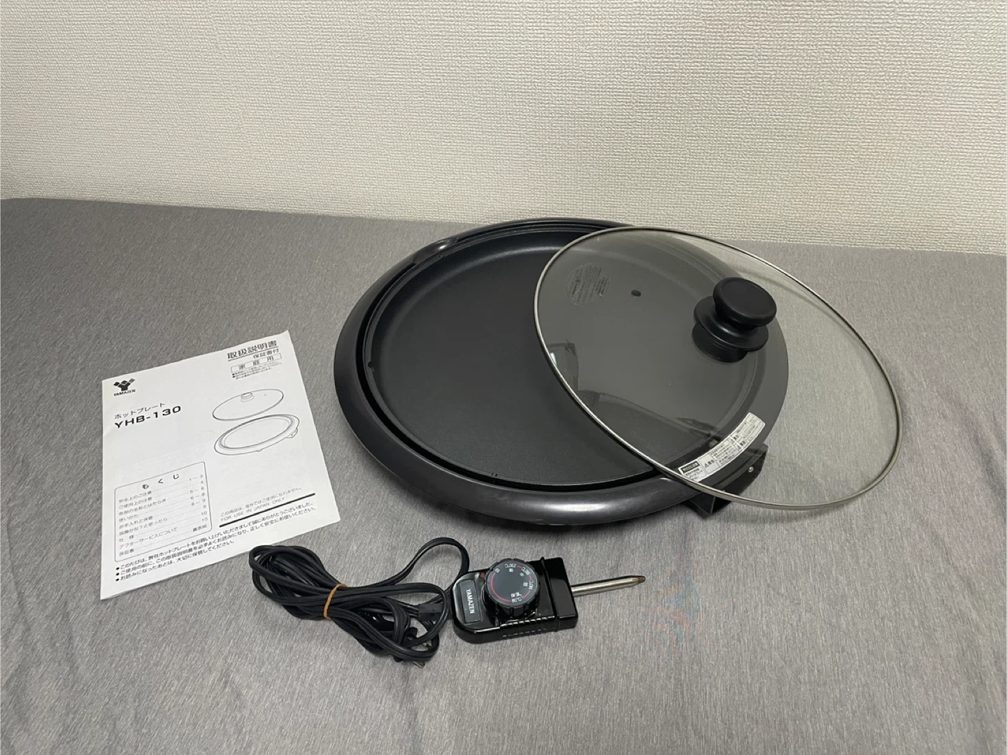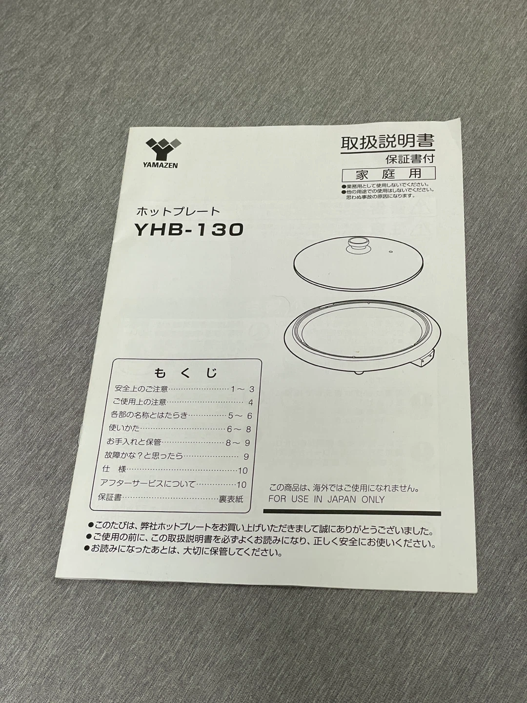 ヤマゼンのホットプレートです。 2〜3回の使用。使わなかったため出品します。 【情報】 ブランド:ヤマゼン 型番:YHB-130 定格:AC100V 1200W 【状態】 使用感は少ないです。 【付属品】 説明書、蓋、電源コード 中古品であることをご了承ください。