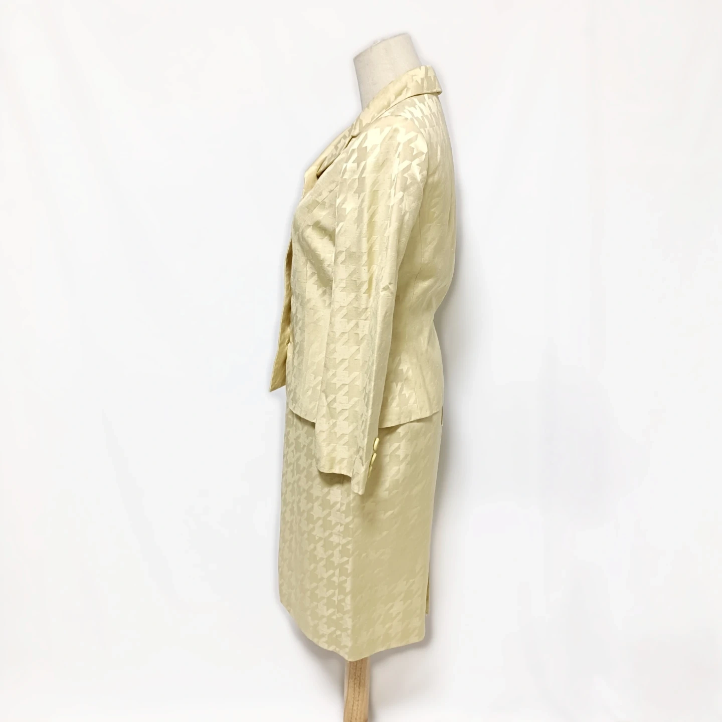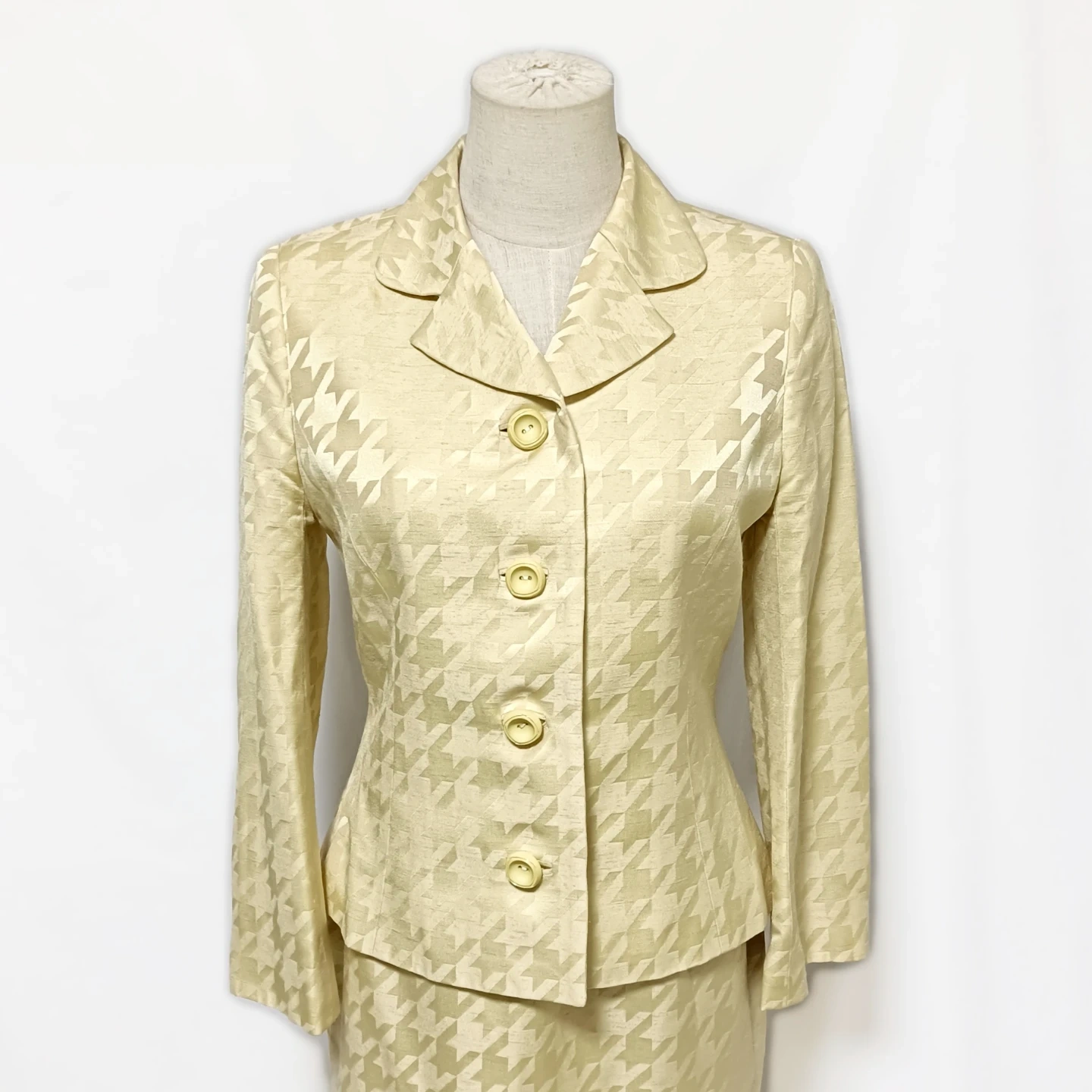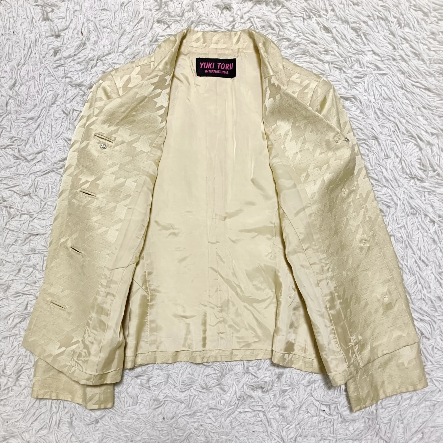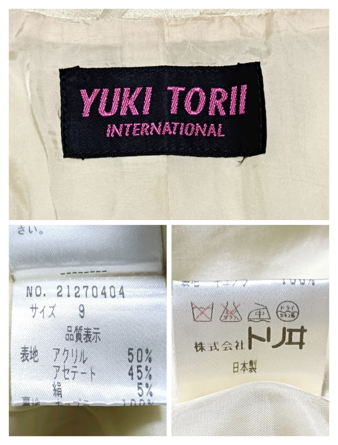 ご覧いただきありがとうございます! 日本を代表するメゾン「ユキトリイ」の、非常に上品で高級感あふれるスカートスーツです。 淡いイエロー(クリーム色)に、光の加減で浮かび上がる千鳥格子(ハウンドトゥース)のジャガード織りが、お顔周りをパッと明るく華やかに演出してくれます。 入学式・卒業式などのセレモニーから、結婚式、パーティー、お食事会まで、特別な一日にふさわしい一着です。 □商品名□ ユキトリイ シルク混 千鳥格子 セットアップ スーツ イエロー 9号 M □ブランド□ YUKI TORII ユキトリイ □表記サイズ□ 9号(M相当) □実寸サイズ(cm) □ 【床置きサイズ】 ジャケット 着丈:52 肩幅:38 身幅︰43 袖丈:54 スカート ウエスト︰32 着丈︰61 ※実寸につきまして多少の誤差はご了承ください。 ※表記サイズだけではなく実寸のサイズをご確認ください。 □カラー□ イエロー □素材□ 表地:アクリル 50% アセテート 45% 絹(シルク) 5% 裏地:キュプラ 100% □コンディション□ 目立った汚れやダメージなど特にございません。 ※汚れはできる限り写真にて掲載しております。まずは画像をご確認ください。 どうぞよろしくお願い致します。 □商品管理番号□ K3-W-5635